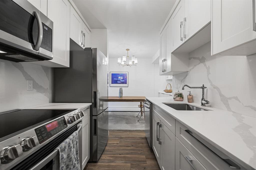 Welcome to this well-maintained and competitively priced two-bedroom condo offering over 809 sq. ft. of comfortable living space at the popular Village Green complex. The unit benefits from extensive exterior upgrades completed in 2017, including a new roof, windows, doors, and siding, giving the building a fresh, modern look and added value. Inside, the interior finishes have been completely updated. Laminate flooring throughput, ceramic tiles in bathroom, custom closets, updated lighting & plumbing fixtures. The layout is thoughtfully designed with a separate bedroom wing for added privacy, along with full-sized dining and living areas that make the home feel spacious and inviting. The modern kitchen features stainless steel appliances, quarts countertops, along with quarts backsplash and ample cabinetry, making it both functional and stylish. Dining room offers custom built-ins for extra added storage & countertop space. Both bedrooms include custom built-in closets offering convenience and storage. The unit also includes two separate entries, adding convenience and privacy for residents. Located in a desirable area with easy access to public transportation, the C-Train line, Heritage Drive, MacLeod Trail, and Blackfoot Trail, this condo is close to everything you need—shopping, schools, parks, and more. Whether you’re looking to invest or purchase your first home, this is a fantastic opportunity to own a stylish, move-in-ready condo in a well-managed complex.