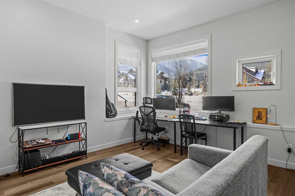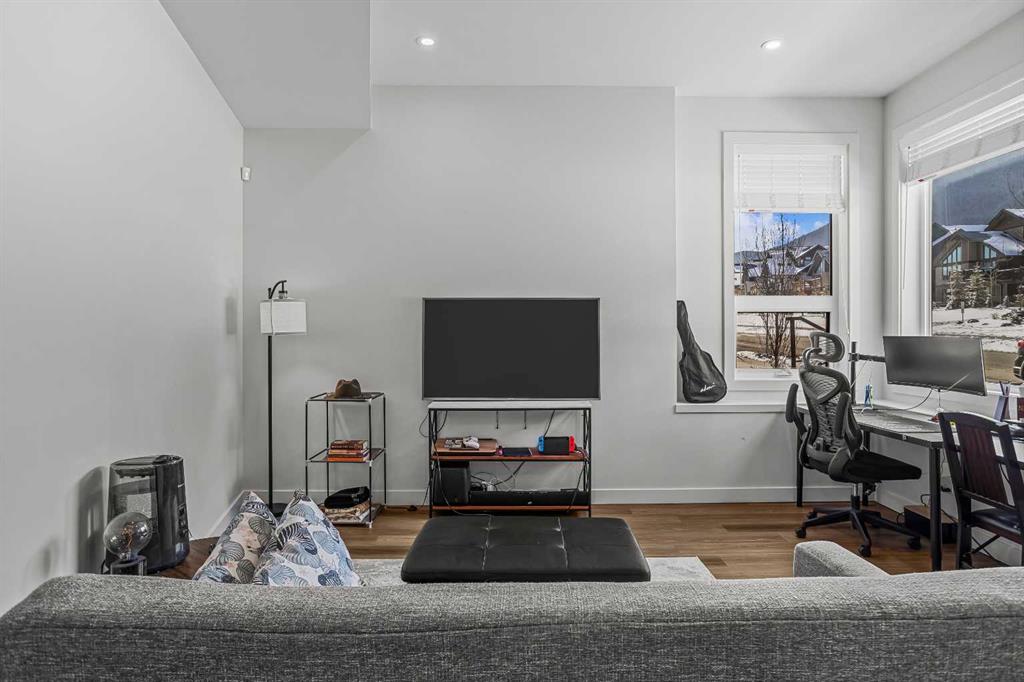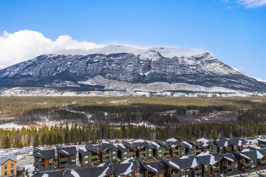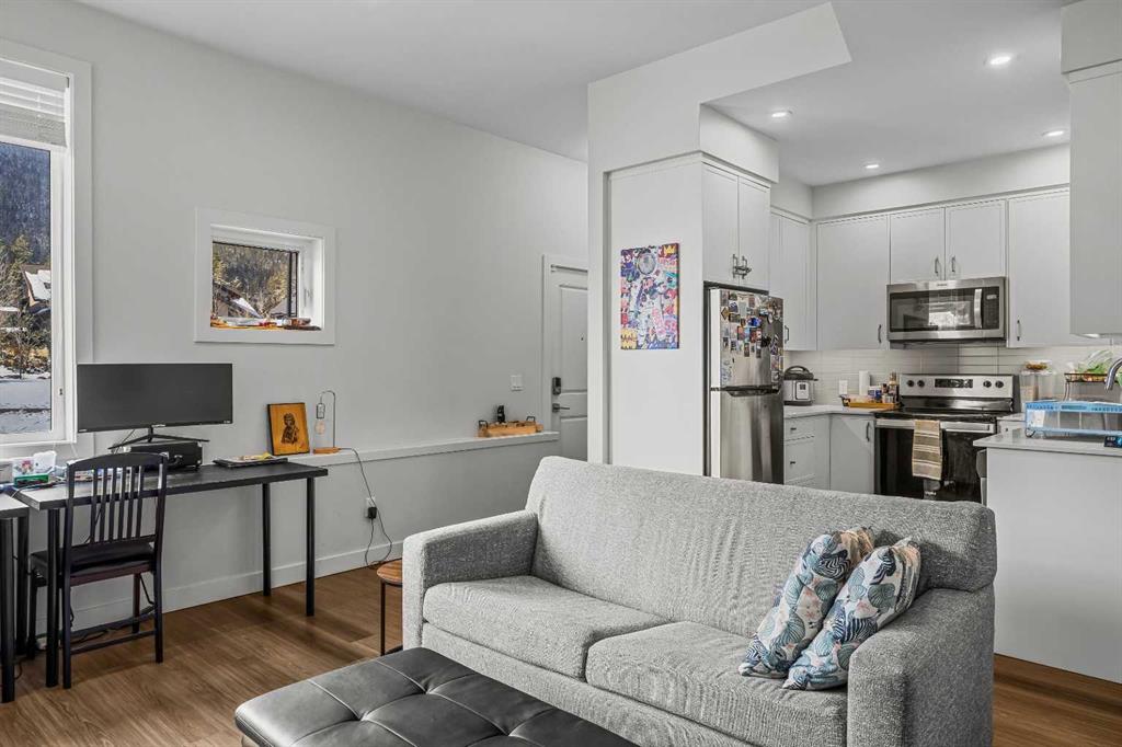 Welcome to 102G – 1200 Three Sisters Parkway, a beautifully designed 1-bedroom condominium in the highly desirable community of Stewart Creek, offering modern mountain living in one of Canmore’s fastest growing neighbourhoods. This thoughtfully laid-out home features over 620 sq ft of bright, open living space with large windows that flood the interior with natural light and showcase stunning mountain views right from your living area and workspace. The open-concept living room provides a comfortable place to relax, complete with warm wood flooring and seamless flow into the kitchen. The modern kitchen offers clean contemporary finishes including quartz countertops, stainless steel appliances, full-height cabinetry, and a stylish tile backsplash. Its efficient design provides excellent storage and workspace while maintaining an open connection to the living area—ideal for both everyday living and entertaining. A standout feature of this home is the flexible workspace positioned beside oversized windows, creating a bright and inspiring area for working from home while enjoying views of the surrounding peaks. The spacious bedroom provides a quiet retreat with generous closet space and easy access to the well-appointed 4-piece bathroom. In-suite stacked laundry and additional storage add convenience and practicality. Situated on the ground level with easy access, this home is perfect for full-time living, a mountain getaway, or an investment property. Stewart Creek continues to grow as one of Canmore’s most desirable communities, and this location is conveniently close to the upcoming Three Sisters Gateway commercial district, future home to an IGA grocery store, cafés, restaurants, and services—bringing everyday amenities just minutes from your door. Surrounded by world-class hiking, biking, and cross-country ski trails, and just steps from the Stewart Creek Golf Course, this home offers the perfect balance of mountain lifestyle and modern convenience.
