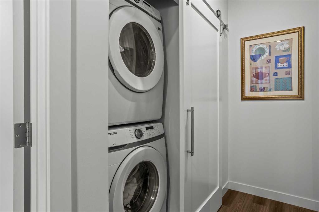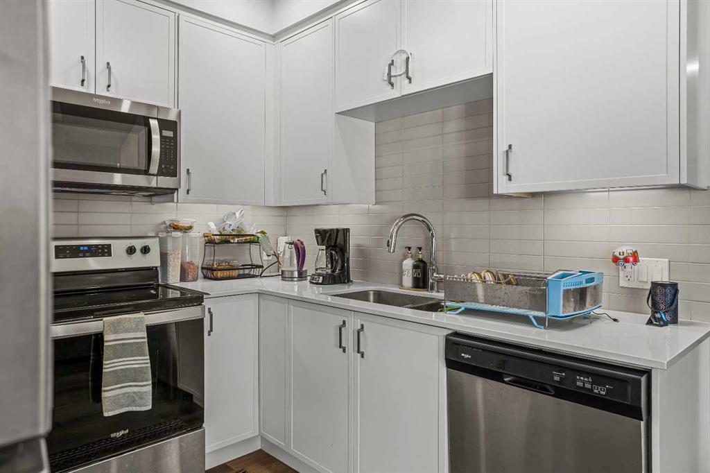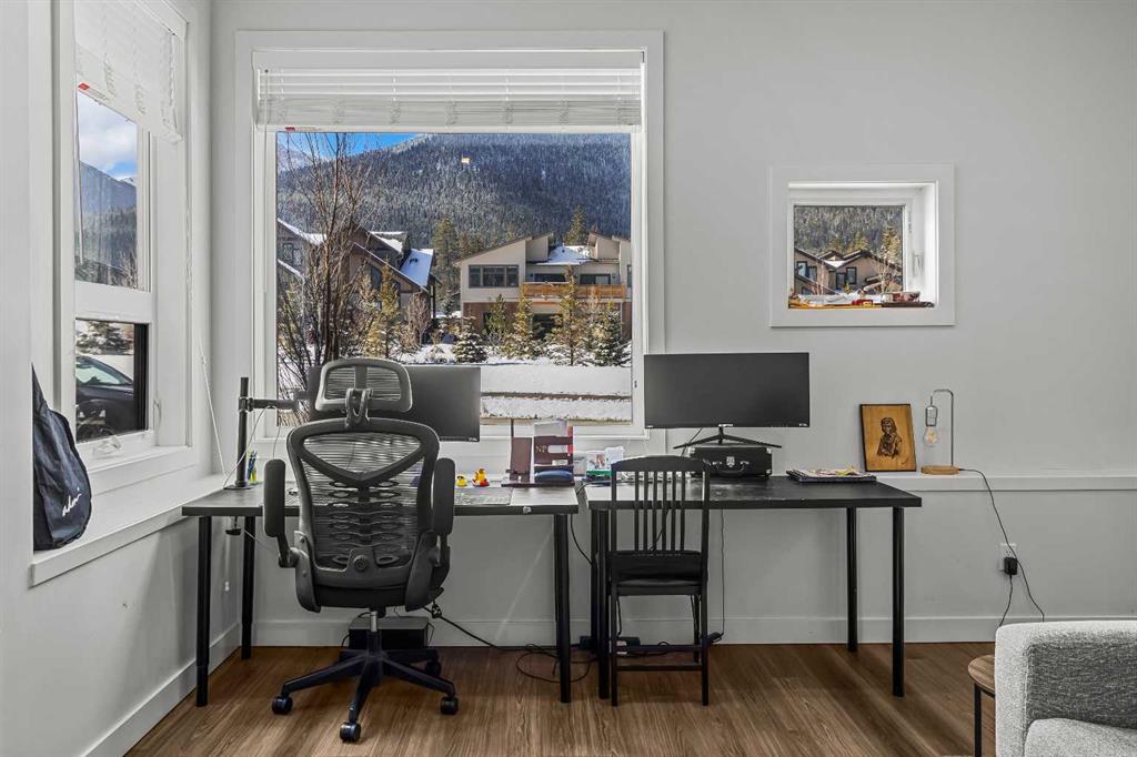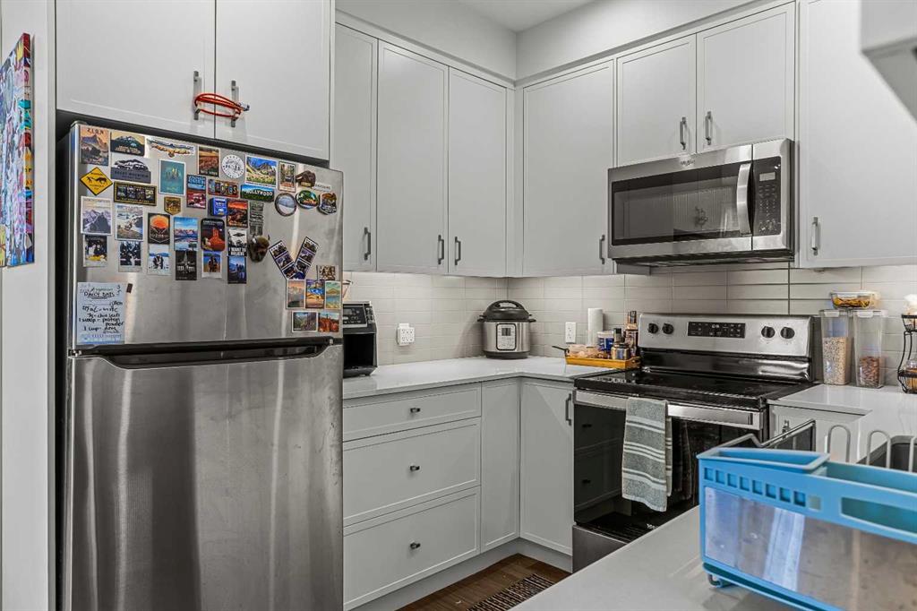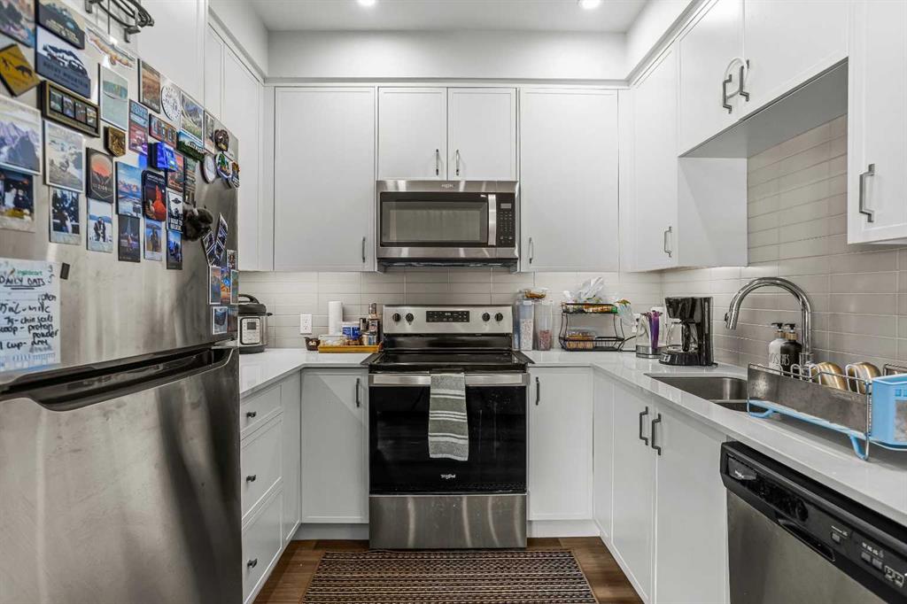 Welcome to 102G – 1200 Three Sisters Parkway, a beautifully designed 1-bedroom condominium in the highly desirable community of Stewart Creek, offering modern mountain living in one of Canmore’s fastest growing neighbourhoods. This thoughtfully laid-out home features over 620 sq ft of bright, open living space with large windows that flood the interior with natural light and showcase stunning mountain views right from your living area and workspace. The open-concept living room provides a comfortable place to relax, complete with warm wood flooring and seamless flow into the kitchen. The modern kitchen offers clean contemporary finishes including quartz countertops, stainless steel appliances, full-height cabinetry, and a stylish tile backsplash. Its efficient design provides excellent storage and workspace while maintaining an open connection to the living area—ideal for both everyday living and entertaining. A standout feature of this home is the flexible workspace positioned beside oversized windows, creating a bright and inspiring area for working from home while enjoying views of the surrounding peaks. The spacious bedroom provides a quiet retreat with generous closet space and easy access to the well-appointed 4-piece bathroom. In-suite stacked laundry and additional storage add convenience and practicality. Situated on the ground level with easy access, this home is perfect for full-time living, a mountain getaway, or an investment property. Stewart Creek continues to grow as one of Canmore’s most desirable communities, and this location is conveniently close to the upcoming Three Sisters Gateway commercial district, future home to an IGA grocery store, cafés, restaurants, and services—bringing everyday amenities just minutes from your door. Surrounded by world-class hiking, biking, and cross-country ski trails, and just steps from the Stewart Creek Golf Course, this home offers the perfect balance of mountain lifestyle and modern convenience.