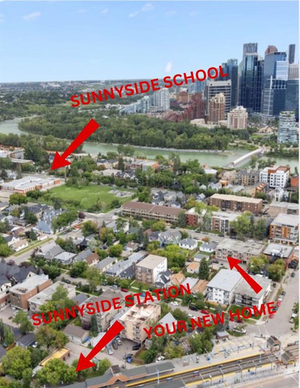 PRICE REDUCTION, AMAZING VALUE! Located in the vibrant community of Sunnyside, this freshly painted 2 bedroom 1 bathroom END unit apartment is MOVE IN READY. Entering the unit you'll be welcomed with hardwood floors, a generous storage room and your stacked, in-unit laundry (April 2025). Walking into the main living space you'll appreciate the large kitchen featuring stainless steel appliances, granite countertops, an open concept floor plan with a good sized living/dining area and a newer fireplace, 2023. With extra windows across the front, side and back (due to it being an end unit), you'll always feel warm and at home. The oversized patio doors lead to a SOUTH FACING patio that's great for a morning coffee or evening wine. The 4 piece bathroom was renovated in November 2020 and has tile flooring. Both bedrooms are larger than you'd normally find in a two bedroom apartment with the carpet being replaced in 2019. Other features of the unit/building are that you're just a few steps to your parking stall which has a plug, there's a new ramp being installed at the main entrance and it's a concrete building. The biking score is an impressive 99 with a walkability score of 95 and transit score of 77, almost unheard of! Other important destinations are: Steps to Safeway, walking distance to coffee, cafes, boutiques, river pathways, 2 blocks from the Bow River, 2 blocks from Kensington, 1 block from the C train, and just 1 stop on the C train from Sait and 2 stops to the University of Calgary.