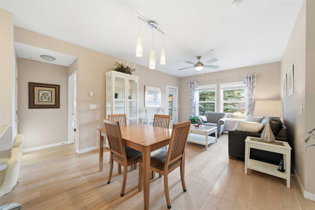 Hello #107!! Discover this bright and beautifully maintained 2-bedroom, 2-bathroom main-floor condo offering over 924 sq. ft. of thoughtfully designed living space in one of Calgary’s most sought-after southeast communities. With true pride of ownership throughout, this home seamlessly blends modern style, comfort, and everyday convenience. The open-concept layout features 9-foot ceilings and large south-facing windows that flood the space with natural light. The modern kitchen is well-appointed with sleek quartz countertops, lightly used stainless steel appliances, abundant cabinetry, a large walk-in pantry, and a generous breakfast bar that comfortably seats four—perfect for casual dining or entertaining. The kitchen flows effortlessly into the dining and living areas, finished with luxury vinyl plank flooring, creating a warm and inviting atmosphere. Step outside to your private patio, an ideal spot for a morning coffee. You’ll enjoy the privacy of this corner unit and the open green space! The spacious primary suite offers a walk-through closet and a 4-piece ensuite, while the second bedroom provides the same sun-drenched ambiance; excellent for guests, a home office, or a roommate, and conveniently located next to a second full bathroom. Additional features include in-suite full-size stackable laundry, a dedicated storage locker, an assigned parking stall conveniently located at the front entry, ample visitor parking, and access to a common courtyard playground. The quiet, family-friendly building enhances the appeal of this comfortable and functional home. Residents of Cranston enjoy Cranston Century Hall with a gym, splash park, skating rink, sports courts, and event spaces. Trail and park adventurers will love the walking and biking paths connecting to Fish Creek Park and the Bow River. Residents benefit from nearby schools, playgrounds, green spaces, shopping, dining, and entertainment that are minutes away at Cranston Market and Seton Urban District, as well as South Health Campus, Cineplex, and the world’s largest YMCA. With quick access to Deerfoot Trail, Stoney Trail, and public transit, commuting is easy and convenient. Whether you’re a first-time buyer, investor, or downsizer, this beauty offers the perfect blend of comfort and convenience.