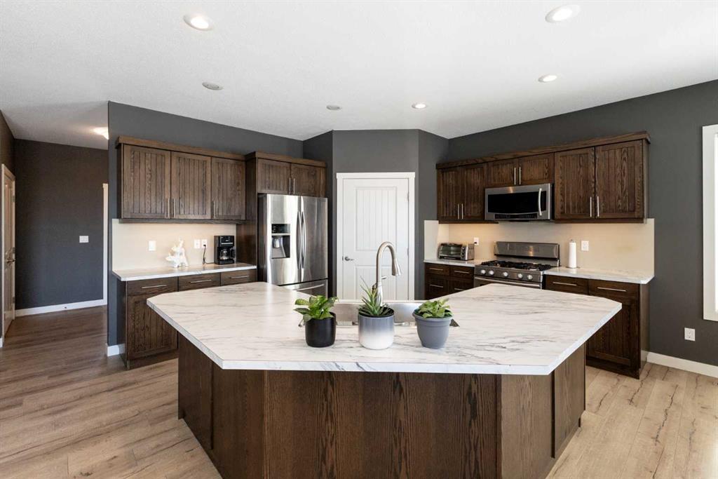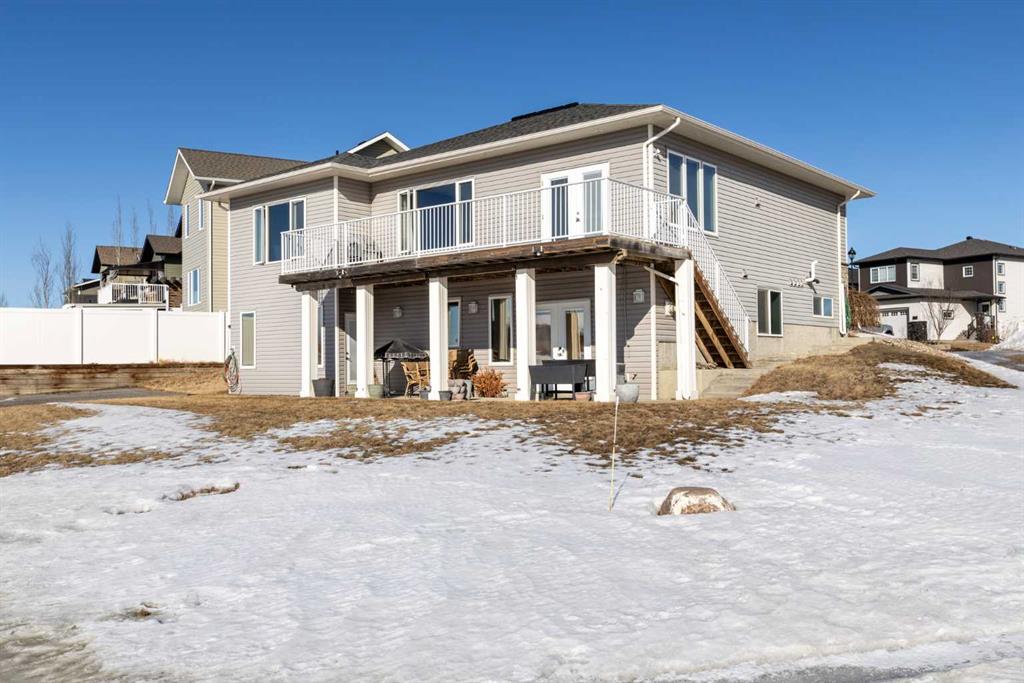 Incredible opportunity in Blackfalds! This impressive walkout bungalow was thoughtfully built as a legal suited home, offering exceptional flexibility for extended family living or potential rental income.Situated on a massive lot with no neighbours behind, the property enjoys beautiful open views and a peaceful setting in a desirable neighbourhood. The home also offers excellent parking with a triple attached garage and additional rear parking, providing plenty of space for vehicles, toys, or guests. The main floor features a bright and spacious layout with a large kitchen, generous living and dining areas, and convenient main floor laundry. This level includes two bedrooms, two full bathrooms, and a dedicated office, with the primary suite offering a comfortable retreat. The fully developed walkout basement provides its own separate entrance and an abundance of additional living space. Downstairs you’ll find two bedrooms, an office, two bathrooms, laundry, extensive storage, and a spacious living area that opens onto a covered patio, creating a comfortable and private lower-level living space. Extra soundproofing was added between the levels by the builder for additional privacy. The triple attached garage is accessible to both levels, adding everyday convenience, while the oversized lot with open views behind offers a rare sense of space and privacy. Located in a great neighbourhood in Blackfalds, this unique property offers a flexible layout, excellent parking, and beautiful surroundings.