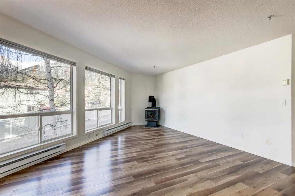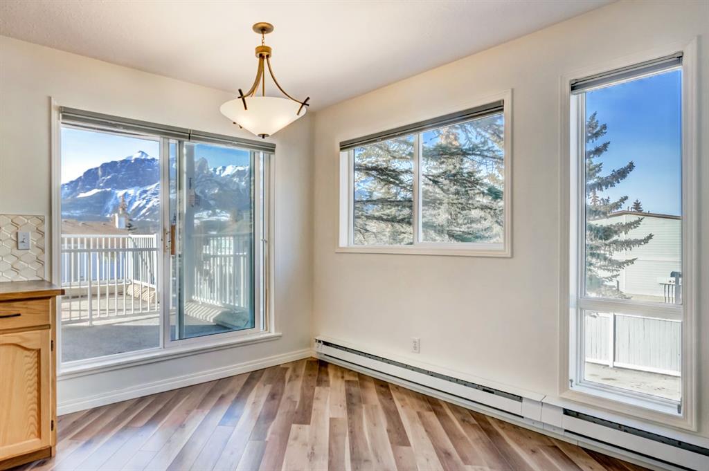 Two bedroom apartment with amazing views. This bright two bedroom, two bathroom corner suite offers over 980 sqft of single level living, perfectly positioned to capture breathtaking mountain views. Oversized windows and the coveted corner location flood the home with natural light, while its sunny valley side setting enhances the warm, inviting atmosphere. The open concept kitchen, dining and living area is ideal for both everyday living and entertaining, anchored by a cozy fireplace. Step outside to the spacious private patio, an extension of the living space and the perfect spot to relax and take in the surrounding alpine scenery. The primary bedroom features a walk in closet and private ensuite, while a second bedroom, full bathroom, walk-in laundry room and ample storage complete the layout. Residents enjoy excellent on site amenities, including an outdoor hot tub, a common gathering space, underground parking and storage. Located just steps from hiking and biking trails plus numerous Bow Valley attractions.