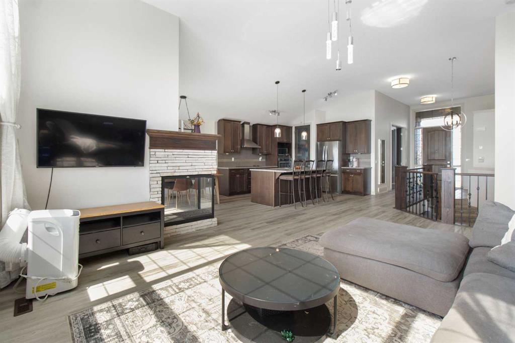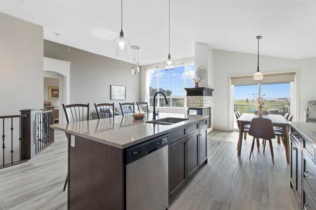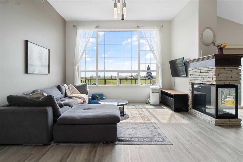 Welcome to this stunning walkout bungalow on a quiet cul-de-sac, backing onto the peaceful links of Muirfield Lakes Golf Course. Soaring vaulted ceilings and a wall of windows frame breathtaking golf-course views. As you enter, you’ll find a versatile flex room—perfect for a home office or extra bedroom. The main floor opens to a chef’s kitchen featuring quartz countertops, plenty of cabinetry, a cooktop, wall oven, and a large corner pantry. The kitchen flows into the dining and living areas, anchored by a stylish three-sided fireplace and spectacular vistas of the course. The primary suite is spacious with vaulted ceilings, serene views, a spacious walk-in closet, and a spa-inspired ensuite with a double vanity, soaker tub, and separate shower. The ensuite connects conveniently to the laundry room. Step outside to the expanded raised deck—ideal for entertaining or relaxing—where you can enjoy unobstructed views and stunning sunsets. Low-maintenance landscaping and a fully fenced yard complete the scene. The finished walkout basement adds a large bedroom, full bathroom, and a welcoming rec room that opens to the backyard. An attached oversized double garage provides ample space for vehicles, storage, and a workshop. Located in the golf-course community of Lakes of Muirfield, just 20 minutes from Calgary, Airdrie, and Strathmore.