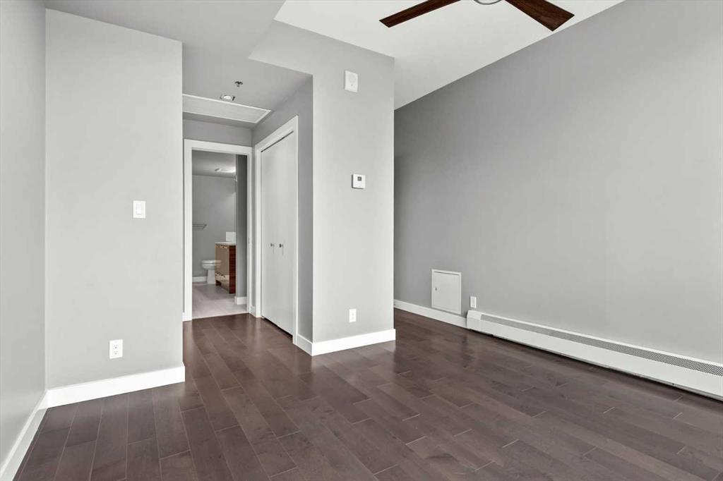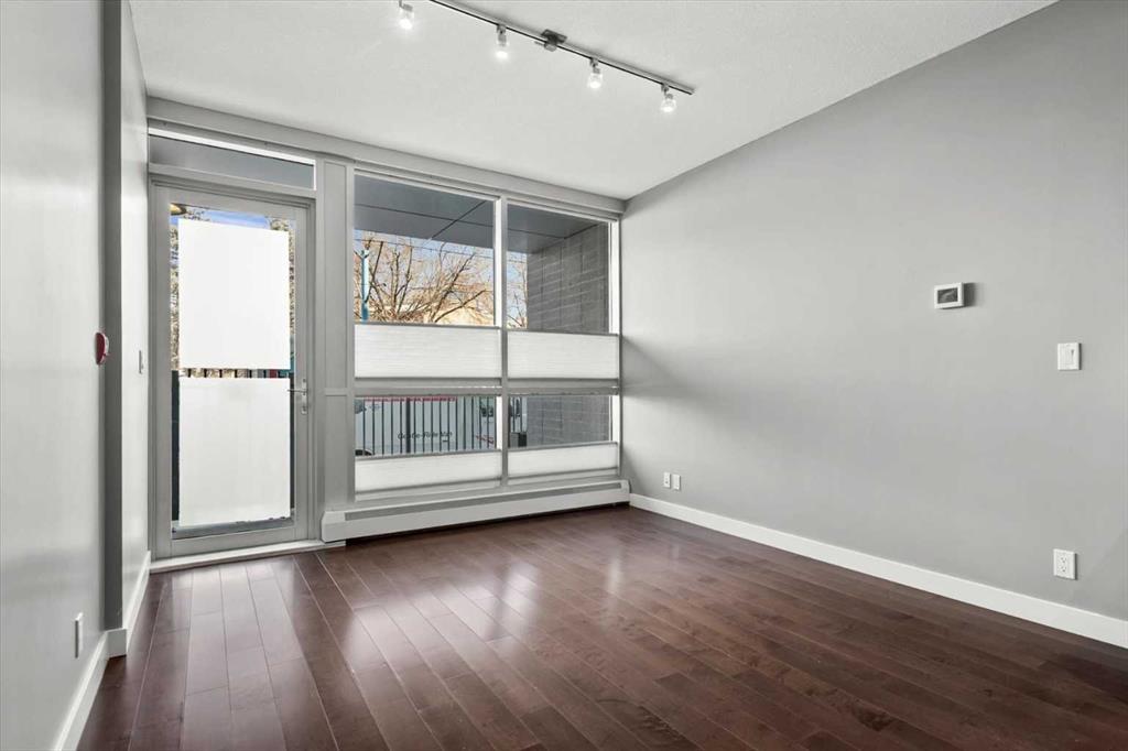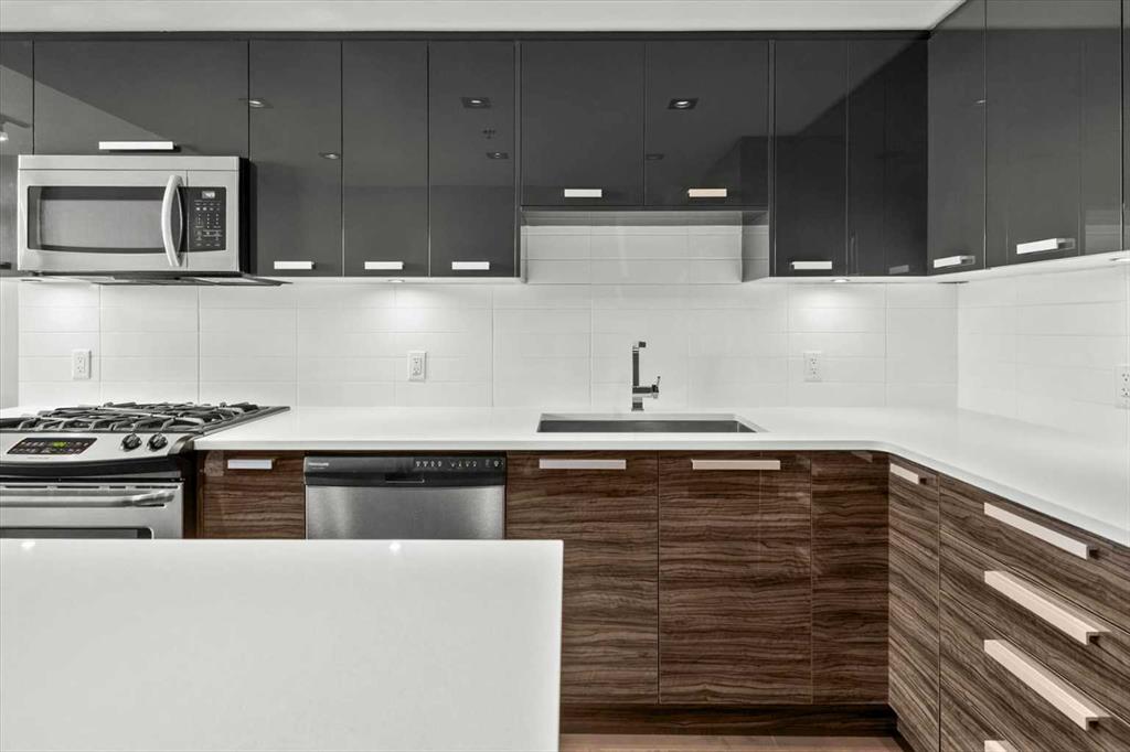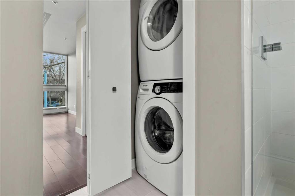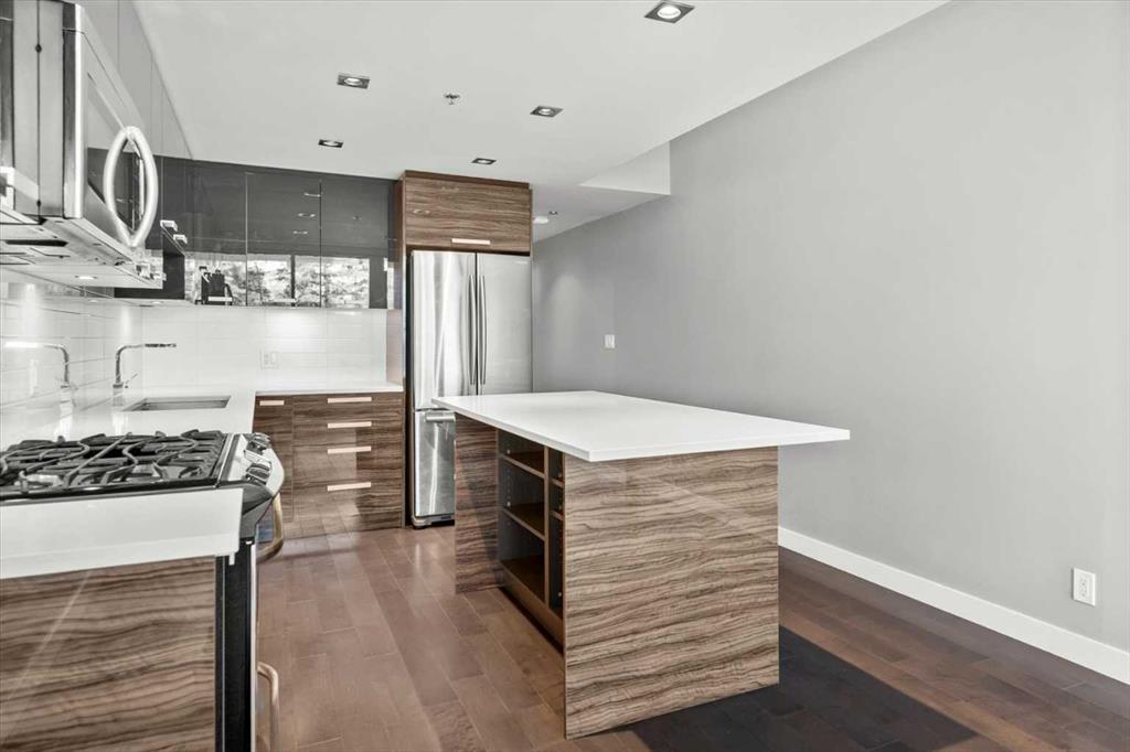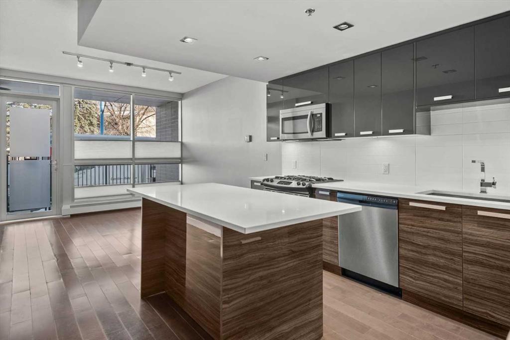 Welcome to Unit 111 at Pixel by Battistella, one of the most coveted addresses in Calgary's inner city. This exceptional multi-level townhome offers 1,068 square feet of intelligently designed and air-conditioned living space within one of Kensington's most architecturally distinctive buildings. With its own private street-level entrance, a fenced patio, two generous bedrooms, two full bathrooms, and a chef-calibre kitchen, this home isn't just a place to live...it's a lifestyle statement. Step through your own front door directly from the street. No lobbies to navigate, no elevator to wait for. Just your home, your space, and one of the most walkable, vibrant neighbourhoods in all of Calgary right outside your gate. That private entrance is one of the details that sets this unit apart and gives you the independence and ease of townhome living wrapped in the sophistication of a concrete, green-built urban residence. The main level sets the tone immediately. Expansive windows provide amazing natural light and highlight the open-concept layout where the living area flows seamlessly into a stunning chef's kitchen. Quartz countertops, a centre island, high-gloss upper cabinetry, warm wood grain lower cabinets, and a premium stainless-steel appliance package including a gas range make this kitchen as functional as it is beautiful. Whether you're entertaining a dinner party, meal prepping for the week, or simply enjoying a morning espresso, this space inspires. Just outside your front door is a private fenced patio, the ideal spot to enjoy a glass of wine in the evening or container gardening in the warmer months. A private 4-piece bathroom and rear access to the common area of the building leading to the heated underground titled parking, complete this level. Head upstairs and the two-level character of this home truly comes alive. The staircase leads to a bright hallway opening to both bedrooms. The primary bedroom is a showstopper. Corner floor-to-ceiling windows on the upper-level frame sweeping treetop views and flood the room with sunshine throughout the day. A ceiling fan helps keeps things comfortable year-round. The ensuite features a glass walk-in shower and a soaker tub...the kind of bathroom that makes you want to slow down on a Sunday morning. Matching quartz counters and warm wood cabinetry tie it beautifully to the kitchen aesthetic below. The second bedroom is equally polished, spacious, and bright with hardwood floors and a generous double closet. Whether you're housing a guest, setting up a home office, or welcoming a growing family, this room delivers flexibility without compromise. A cheater door to the ensuite allows for dedicated access. Complementing the clever upper-level layout is convenient full-size in-suite laundry and added storage. Pixel by Battistella is more than a building, it's a community. The rooftop patio is a genuine gathering place, complete with a gas fireplace, lounge seating, and panoramic views of the Calgary skyline.