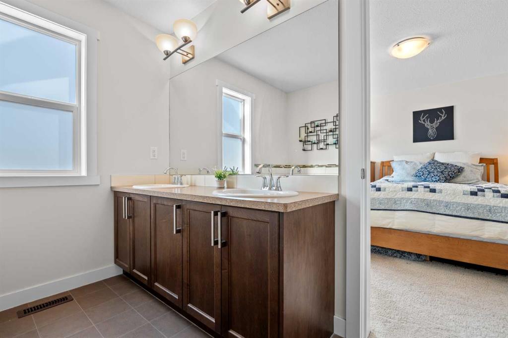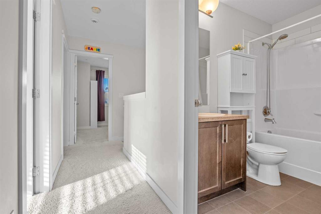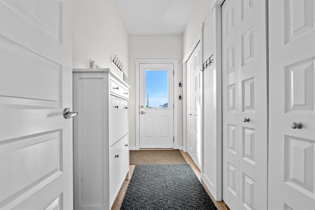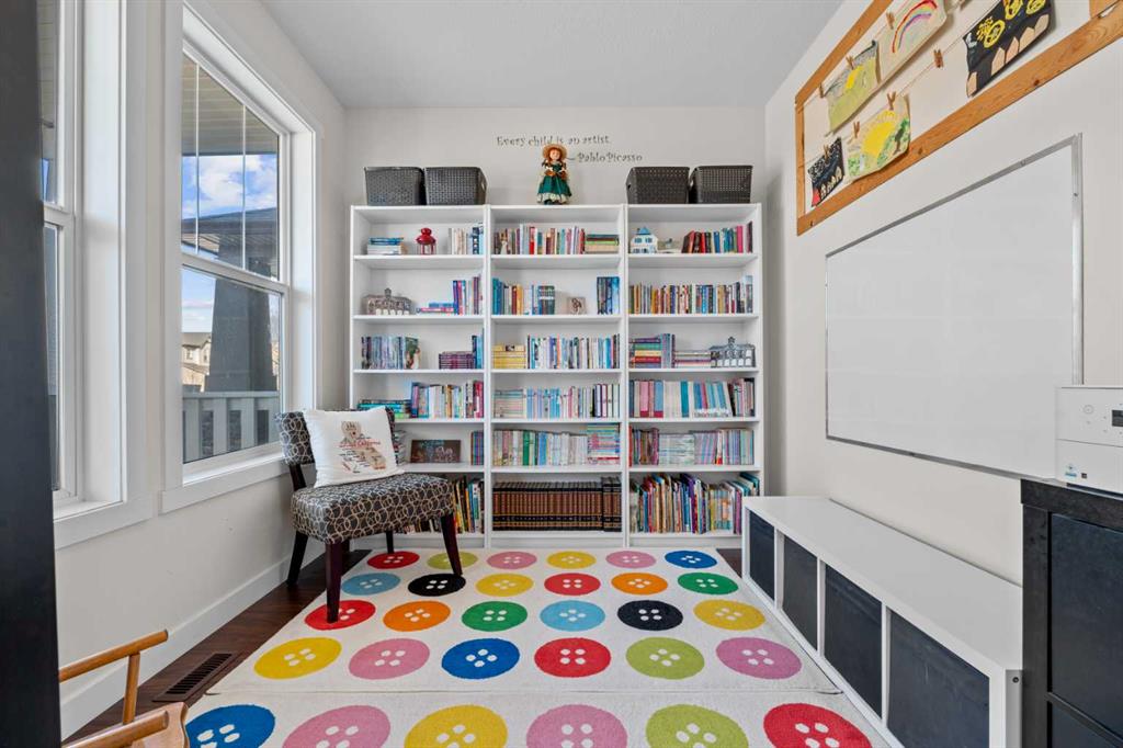 Welcome to this beautifully maintained, original-owner home, perfectly situated on a quiet CORNER LOT beside a scenic WALKING PATH. Thoughtfully designed and ideally located, it’s just STEPS from a SCHOOL, PLAYGROUND, POND, PARK, and a protected nature preserve. Inside, the 9-ft ceilings and open floor plan create a bright, welcoming atmosphere. The main level includes a versatile OFFICE/DEN, a modern kitchen with STAINLESS STEEL APPLIANCES that flows seamlessly into the dining area, and a comfortable living room centered around a cozy FIREPLACE. A convenient powder room and a well-organized mudroom, with both a closet and pantry, add everyday practicality. The backyard offers a generous outdoor space with a deck, SHED, playhouse/platform, and raised GARDEN BOXES filled with assorted herbs. As spring arrives, the property comes alive with raspberry and haskap bushes, rose bushes, mountain ash, Bailey’s Schubert, Japanese lilac trees, and a charming crabapple tree in the front yard. Upstairs, you’ll find three spacious bedrooms and two full bathrooms. Relax with a book in the sitting area of the primary bedroom, or soak in the tub in the primary ensuite with dual sinks, and a walk-in closet. A separate upper-level laundry room adds extra convenience. The undeveloped basement features 9-ft ceilings, large windows, and ample room to create additional living space, whether you envision an office, extra bedroom, or a home gym, with mirrors already included. A brand new hot water tank and water softener is also included. With a quick 20 minute commute to Calgary city limits, this home offers a wonderful blend of comfort, function, and family-friendly living in a truly inviting setting.