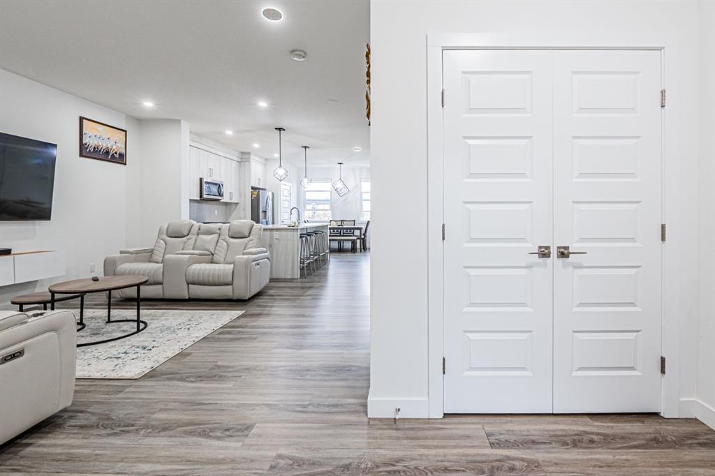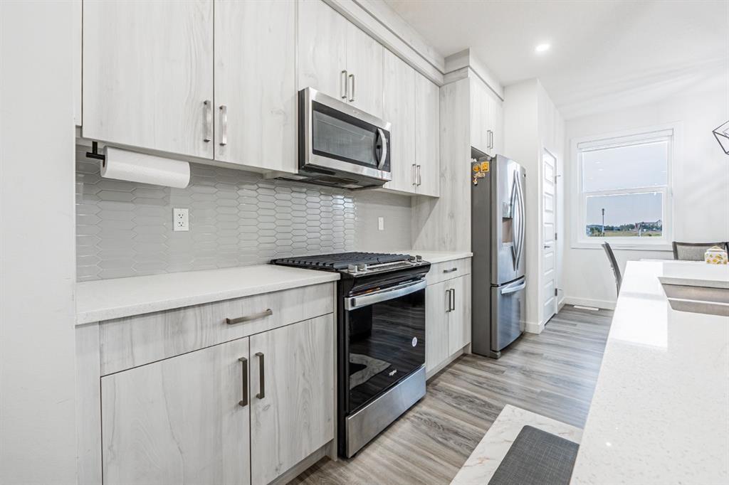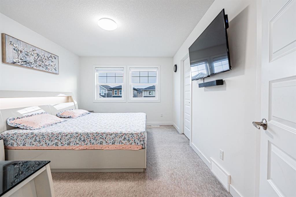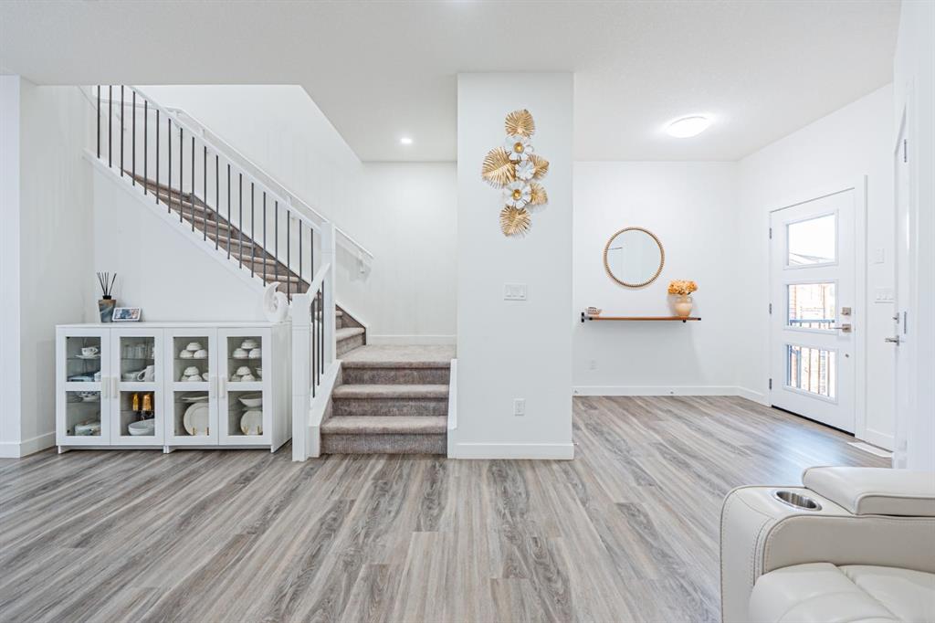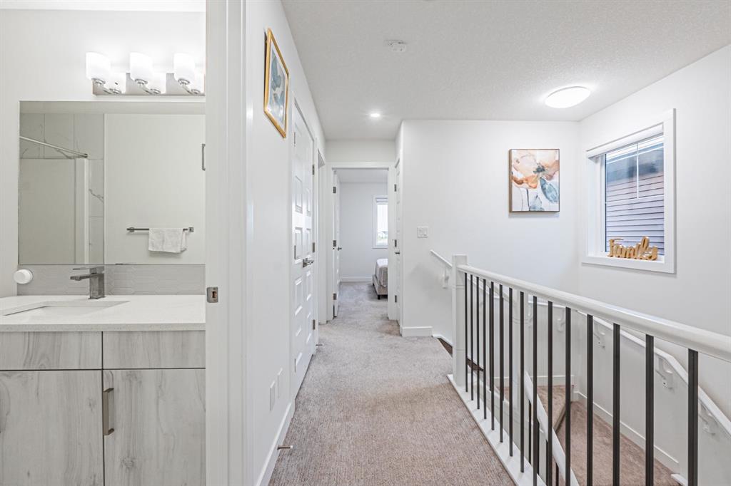 4 BEDROOMS + DEN | 3.5 BATHS | FRONT ATTACHED GARAGE | ILLEGAL BASEMENT SUITE | HIGH-END FINISHES | PRIME LOCATION | Welcome to this stunning and exceptionally maintained front garage duplex in the sought-after community of Midtown, Airdrie. This beautiful home showcases a modern design, high-end finishes, and a functional layout perfect for families, professionals or investors. With a total of 4 bedrooms plus a den and 3.5 bathrooms, this property offers exceptional comfort, versatility, and value. The main floor features a bright and open-concept layout that seamlessly connects the living, dining, and kitchen areas—perfect for entertaining or everyday family life. The elegant kitchen is a true highlight, complete with stainless steel appliances, ceiling-height cabinetry, quartz countertops, and a large island that provides additional workspace and seating. A cozy living room invites relaxation, while the dining area opens to a fully fenced and landscaped backyard with a deck and BBQ gas line, ideal for summer gatherings. A convenient half bathroom completes the main floor. Upstairs, you’ll find three spacious bedrooms, including a luxurious primary suite with a walk-in closet and private ensuite bathroom. Two additional bedrooms share a full bath, and the upstairs laundry adds everyday convenience. The upper level offers a versatile layout perfect for growing families. The basement is fully developed with an illegal suite featuring a separate side entry, large living area, modern kitchen, bedroom plus den, and a full bathroom. This space is currently rented, making it an ideal mortgage helper or a perfect setup for extended family. Located in a quiet and family-friendly area, this home is just steps away from parks, walking trails, schools, and essential amenities such as Co-op Gas, Tim Hortons, and shopping. With 8 years of new home warranty remaining, this property offers both peace of mind and exceptional value. Move-in ready and waiting for you—schedule your private viewing today!