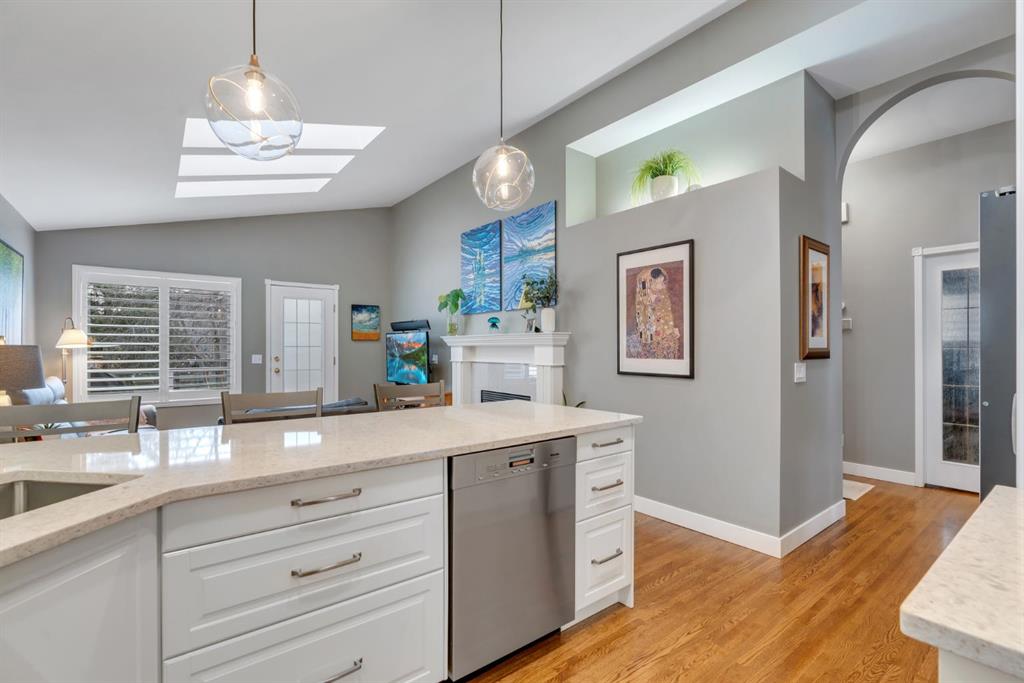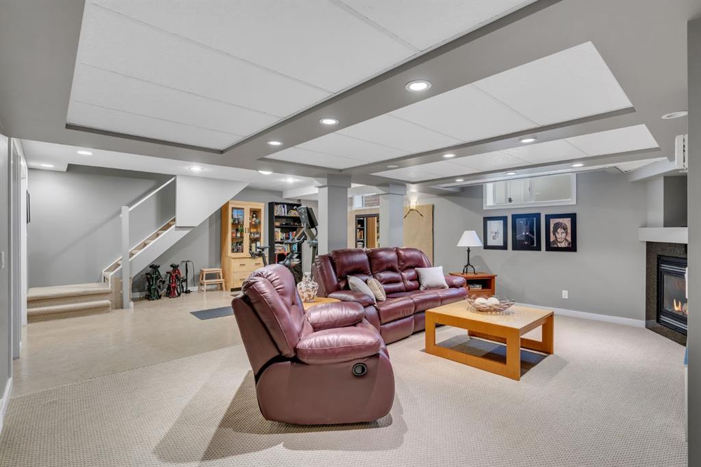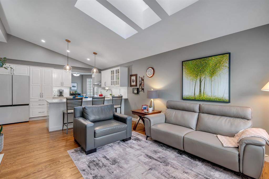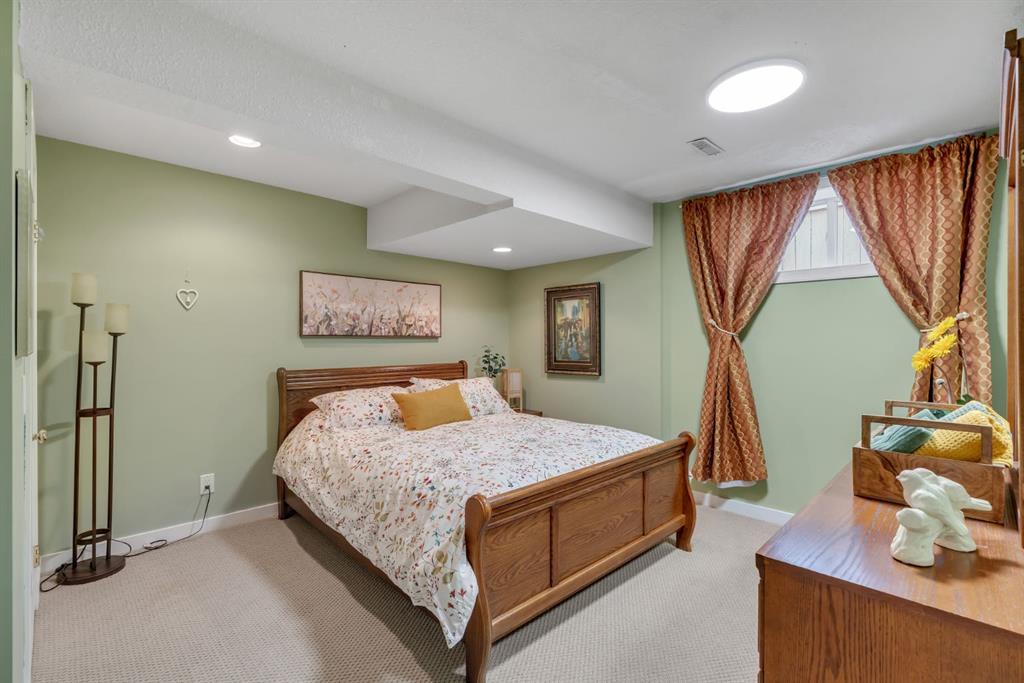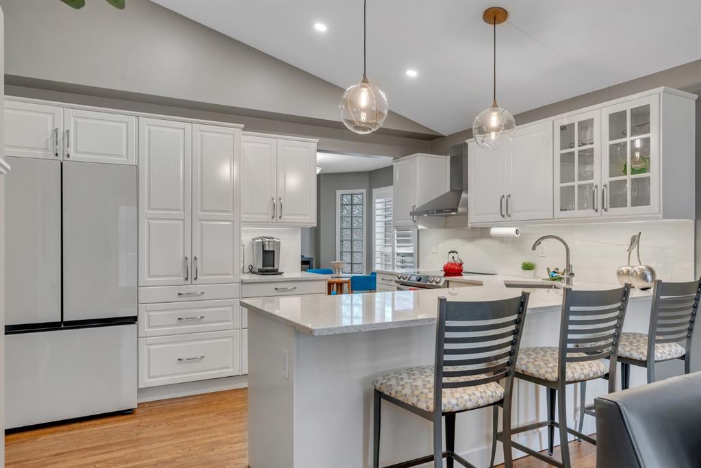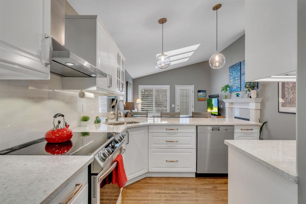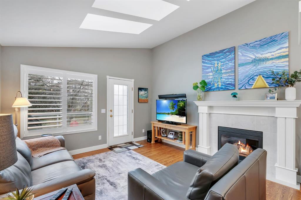 This beautifully upgraded home backs onto greenspace with a sunny south backyard and offers bungalow style living with bonus space for guests or family. As you enter, the main level features soaring vaulted ceilings in the living and dining rooms, refinished hardwood floors throughout, and an upgraded white kitchen with quartz countertops, eating bar, under-cabinet lighting, pull-out drawers, a pantry with organizers, and a newer white glass front Samsung Bespoke fridge with beverage center and induction stove (2023) plus the nook has extra storage. The family room with skylights and beautiful gas fireplace with tile surround provides direct access to the no-maintenance deck overlooking the greenspace. The primary bedroom on the main floor offers the ultimate convenience—no stairs required—and includes a walk-in closet, updated ensuite with new shower and soaker tub and heated floors. It also provides deck access. A main floor den/office, powder room and laundry room complete this ideal layout. Upstairs, the loft is perfect for a reading area or office and the additional bedroom with walk-in closet and ensuite make the perfect private space for older kids, guests, or extended family. The developed basement adds even more versatility with two additional bedrooms (one with a built-in Murphy bed), bathroom with shower, a spacious rec room with a gas fireplace, workout area with cork flooring and plenty of storage. Additional updates and features include: air conditioning, all Poly-B replaced, California shutters, new garage door (2023), newer furnace (2019), extra-wide driveway, gas BBQ line on the deck and backyard shed. This home truly combines the ease of one level living with the flexibility of additional space — a rare and truly special find in Riverbend! Ideally located on one of the community’s best streets, it backs directly onto greenspace and is just a short walk to the Bow River pathways, Quarry Park amenities, and offers quick access to Glenmore Trail and Deerfoot- don't miss out on this great home!