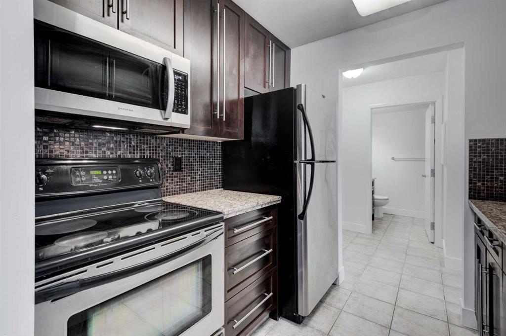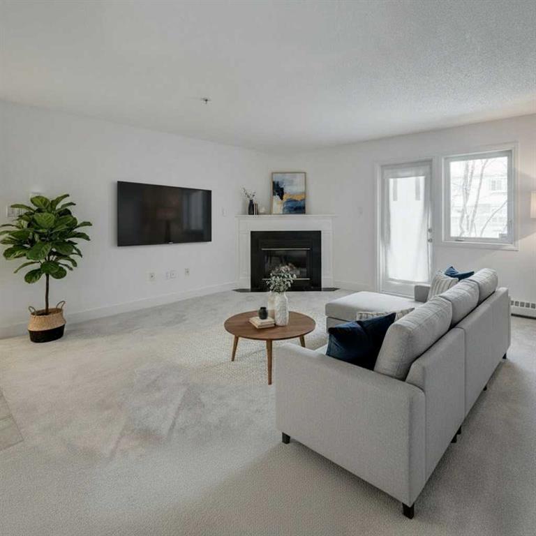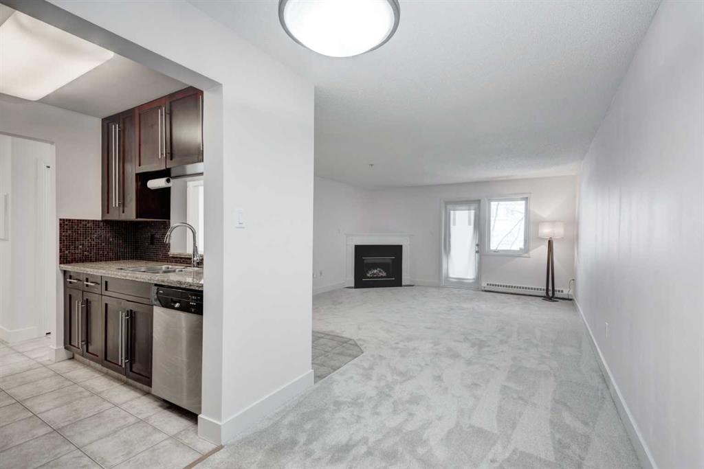 Welcome to this spacious and well-appointed main floor one-bedroom condo at 117-790 Kingsmere Crescent SW in the desirable Kingsland community. Offering comfort, convenience, and modern finishes, this pet-friendly building is perfect for first-time buyers, professionals, or investors. The open and functional layout features a large living room highlighted by a cozy corner gas fireplace, creating a warm and inviting space to relax or entertain. The kitchen is thoughtfully designed with granite countertops, rich dark wood cabinetry, and sleek stainless-steel appliances. A dedicated dining area sits just off the kitchen, ideal for everyday living or hosting guests. Step outside to your large private balcony, perfect for enjoying morning coffee or summer evenings. This home is move in ready, every room has been revitalized with a clean coat of paint and brand-new, soft carpeting underfoot. Complete with a newly installed washer and dryer, this home offers the ultimate in comfort and convenience. If you are a dog lover you will enjoy the close proximity to the front entrance, making walks a breeze. This home includes titled underground parking and a separate titled storage unit, providing exceptional value and practicality. Located just minutes from Chinook Centre, the restaurants and amenities along MacLeod Trail, and C-Train access, this condo offers unbeatable connectivity while still tucked away in a quiet, well-managed complex.