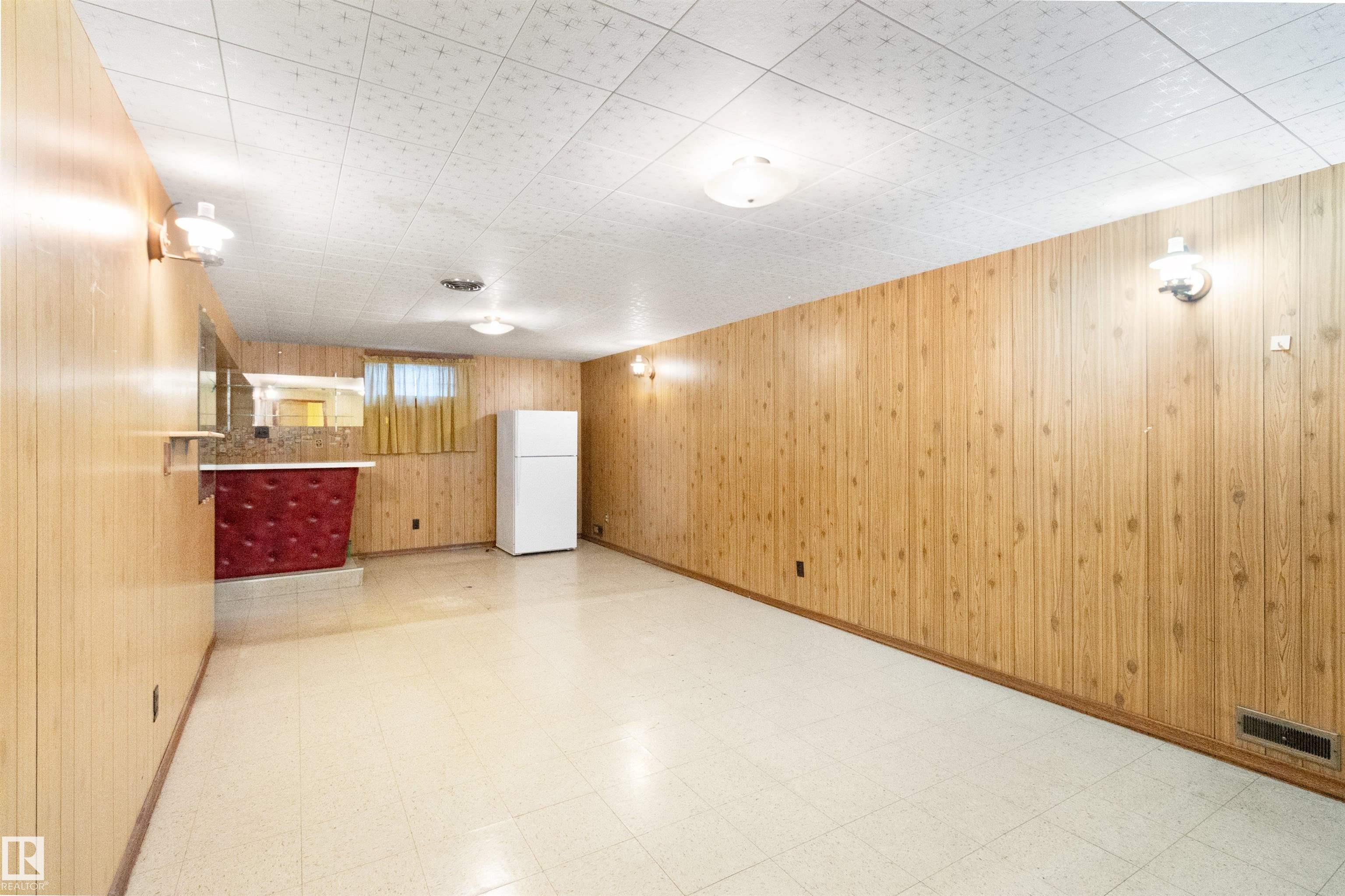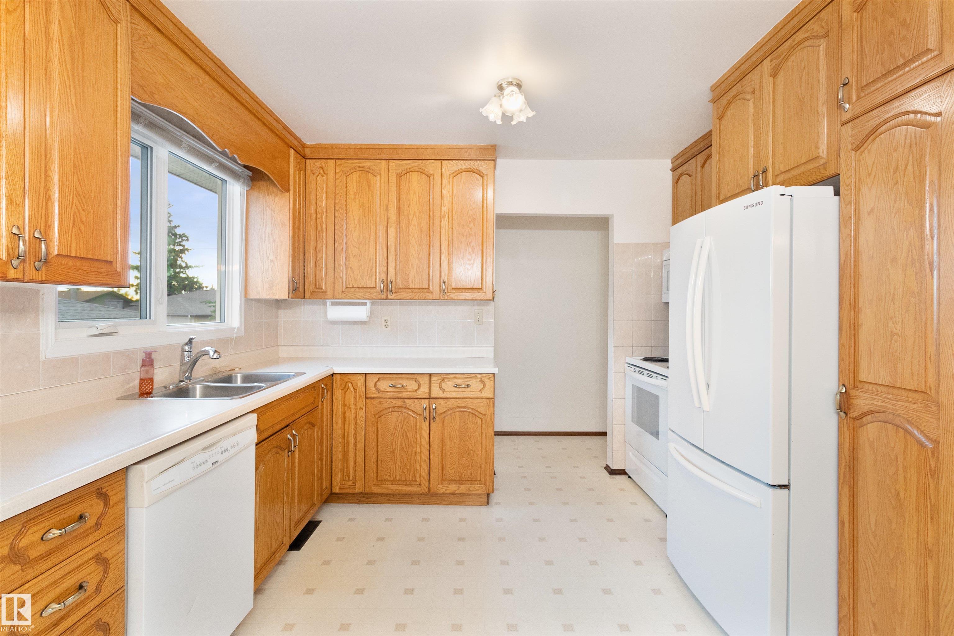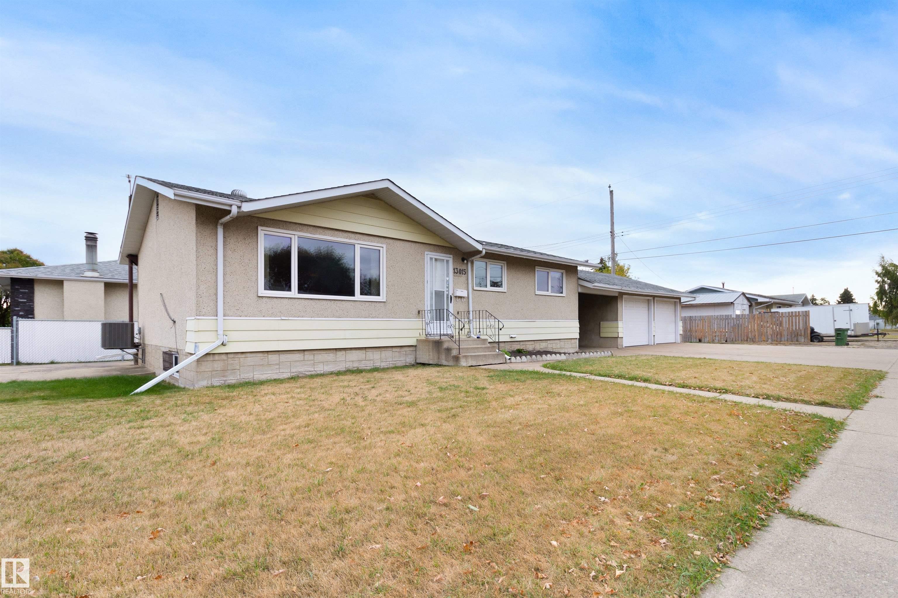 Charming 995 sq. ft. bungalow in the heart of Balwin! This well-kept home features newer windows, a double detached garage with breezeway, and side parking pad. Inside, the bright living room showcases hardwood flooring, while the kitchen offers oak cabinets, a newer fridge, and updated tap. The main floor includes two bedrooms with lino flooring and a primary bedroom with hardwood, plus a renovated 3-pc bath with new shower and tap. The fully finished basement provides a rec room with wet bar and fridge, tile-floor bedroom, 3-pc bath with shower, cold room, and laundry area with washer, dryer, humidifier, and A/C. The garage is a handyman’s dream with heater, compressor, workbench, shelving, and cabinets. Perfect starter home or for investors, this home combines comfort and functionality in a desirable location close to schools, shopping, and transit.