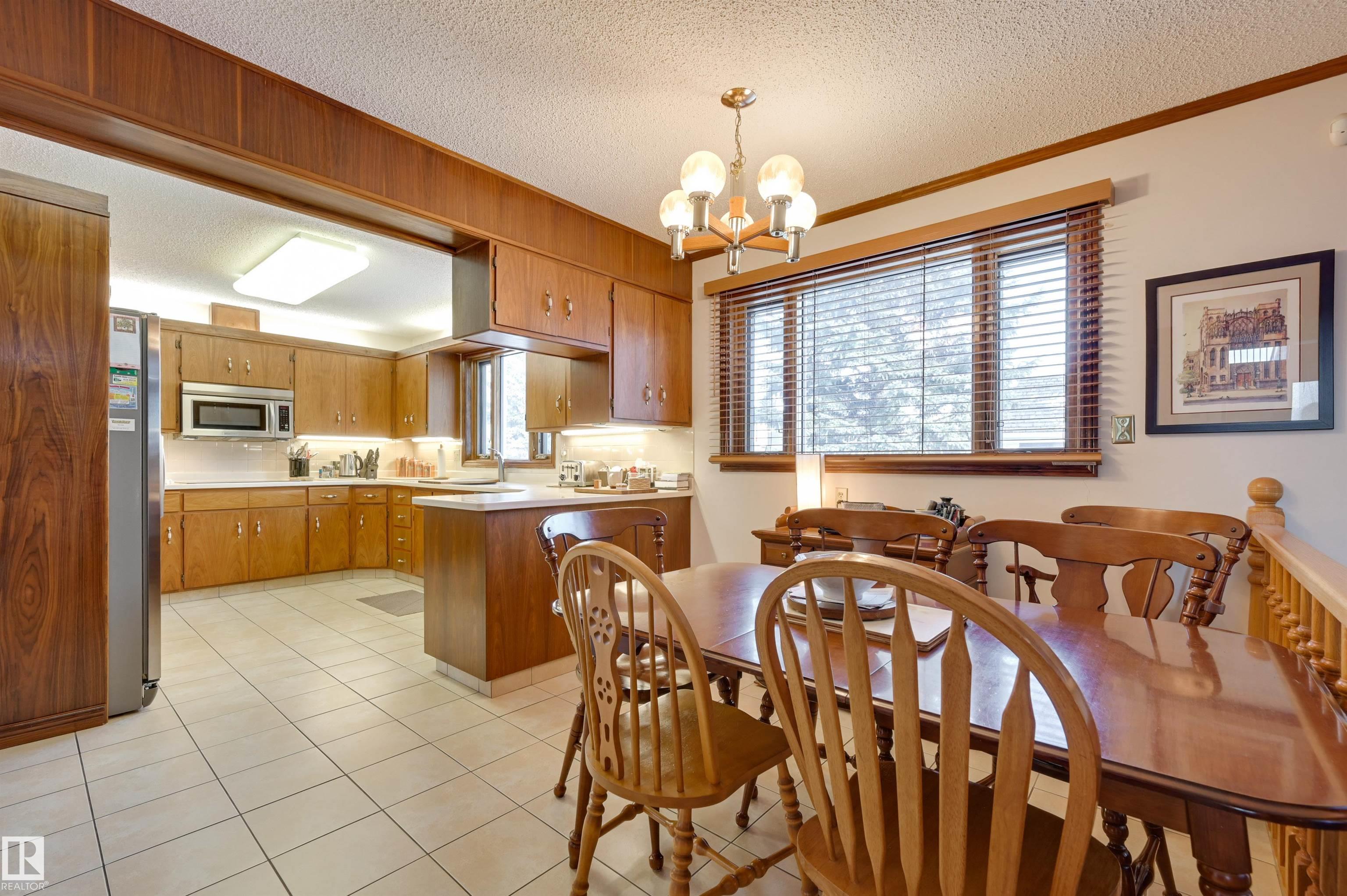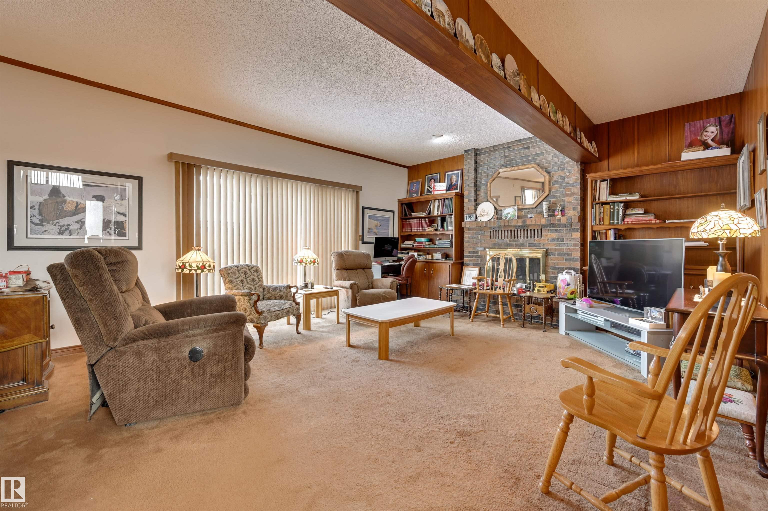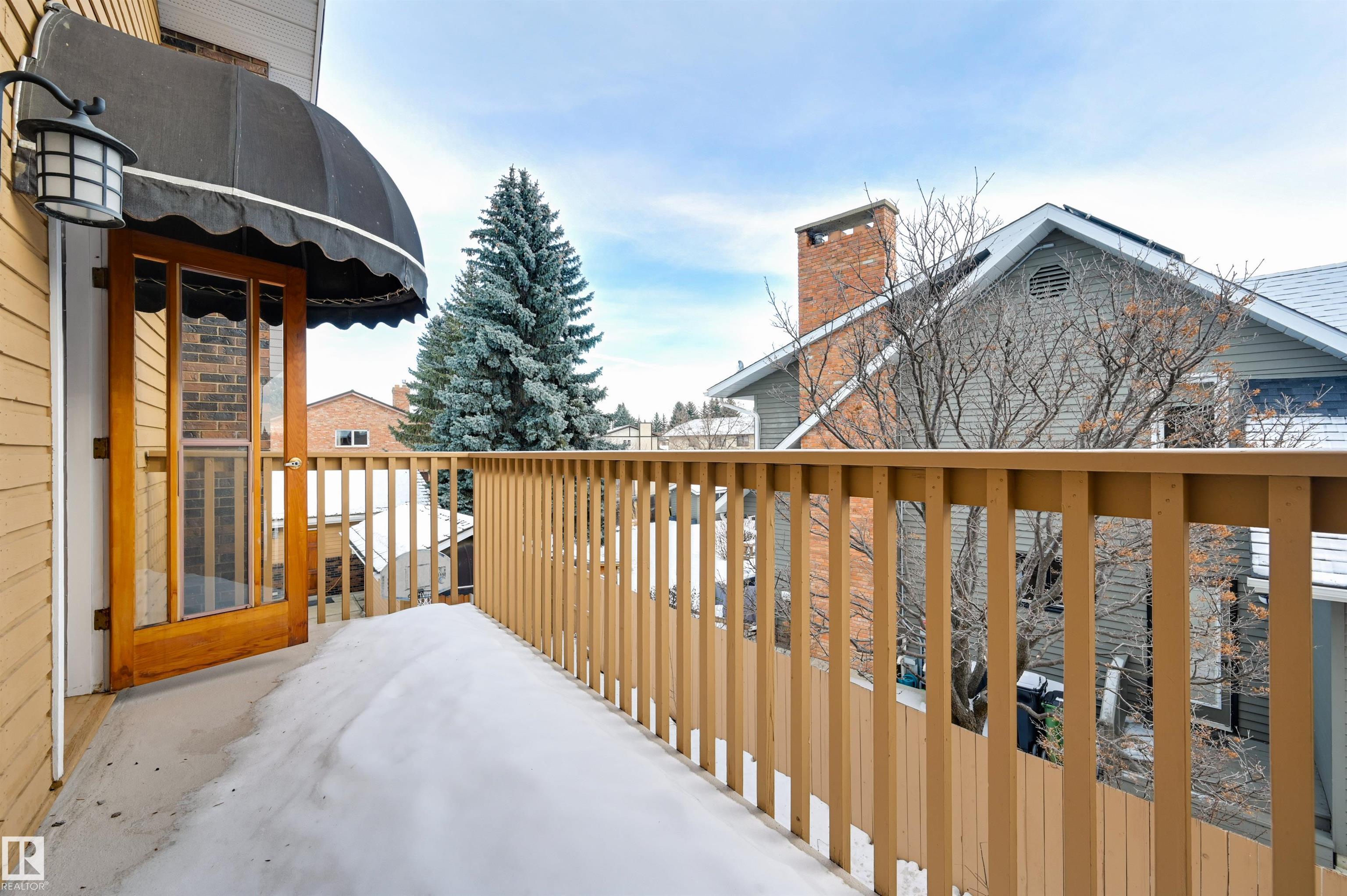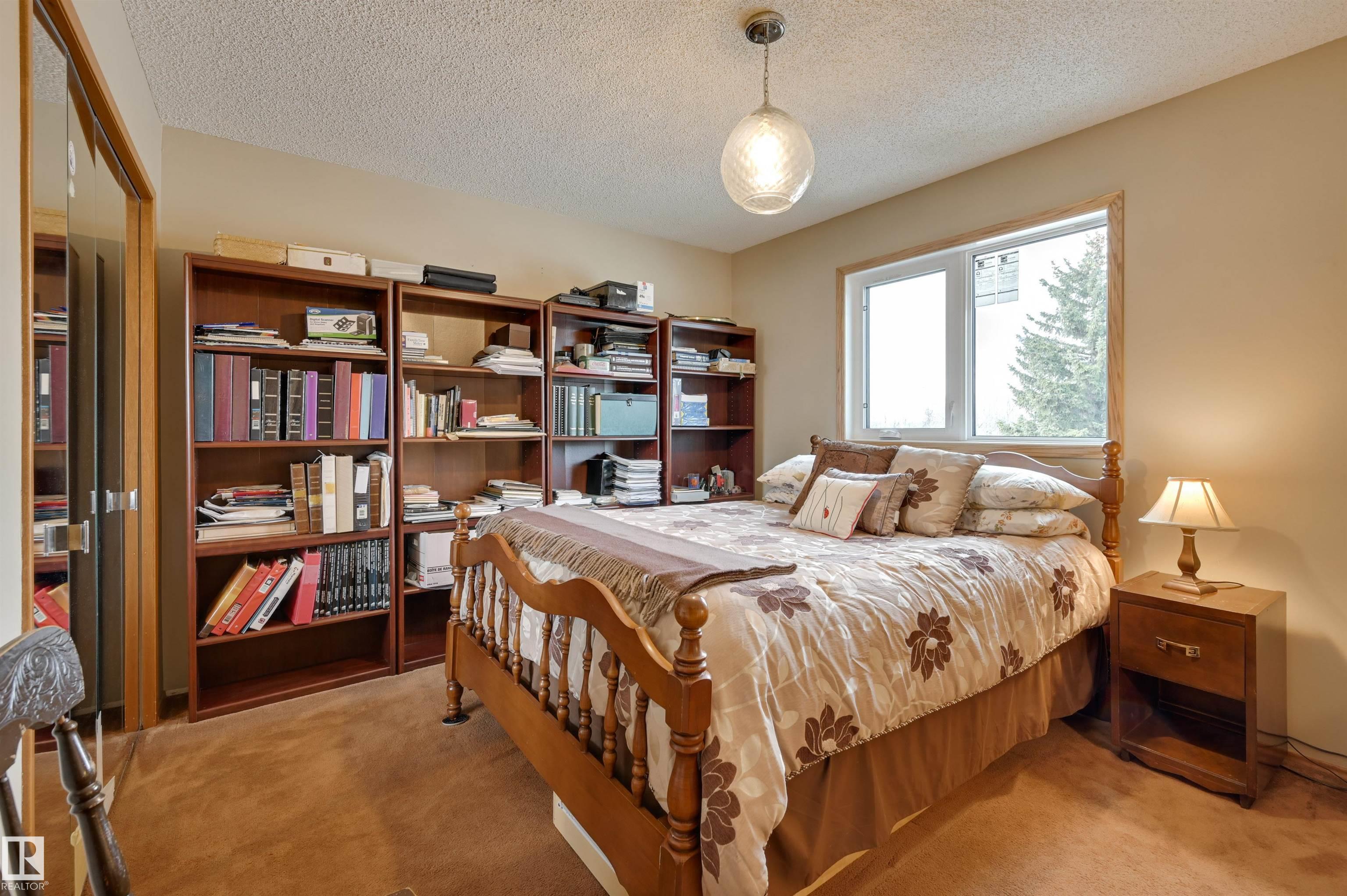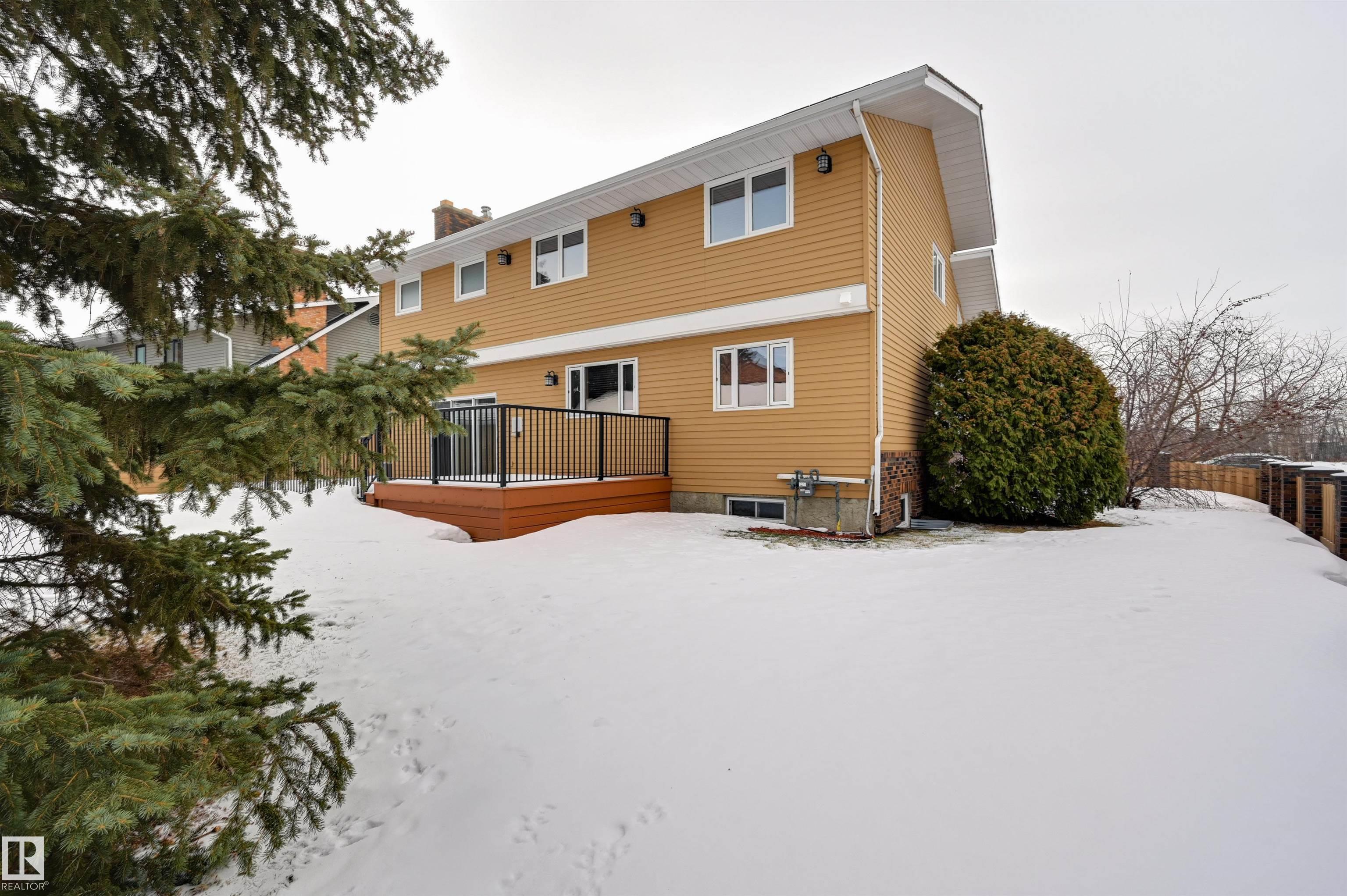 Located across from Big Bear Park with stunning views of Blackmud Creek Ravine this custom-built Birkholz home on a corner lot offers over 2900 sq ft plus a fully finished basement. Grand front entry leads to living room featuring a vaulted cedar ceiling & brick wood-burning fireplace, creating a warm & inviting space. The dining room is perfect for special occasions & enhanced by black walnut hardwood. The adjacent kitchen offers built-in oven, stove top, black walnut cabinetry, & a dining nook overlooking the backyard. The family room has access to the deck & second fireplace. Upstairs the primary suite includes a den, private balcony, cedar closet, & ensuite (2015). Three additional bedrooms & a full bath (updated in 2015). The finished basement features new carpet, a nanny suite plus 5th bedroom, & direct access to the attached garage. Additional highlights include a large deck, huge detached RV garage with work pit, cedar shakes (2012), & A/C. An exceptional home in a truly outstanding location.