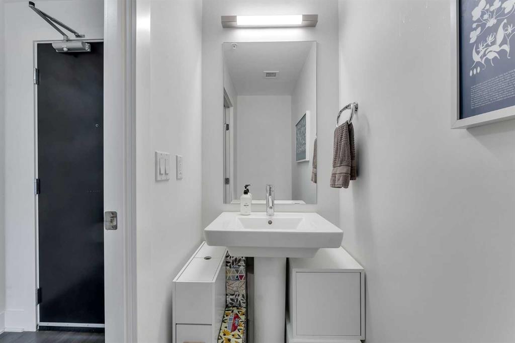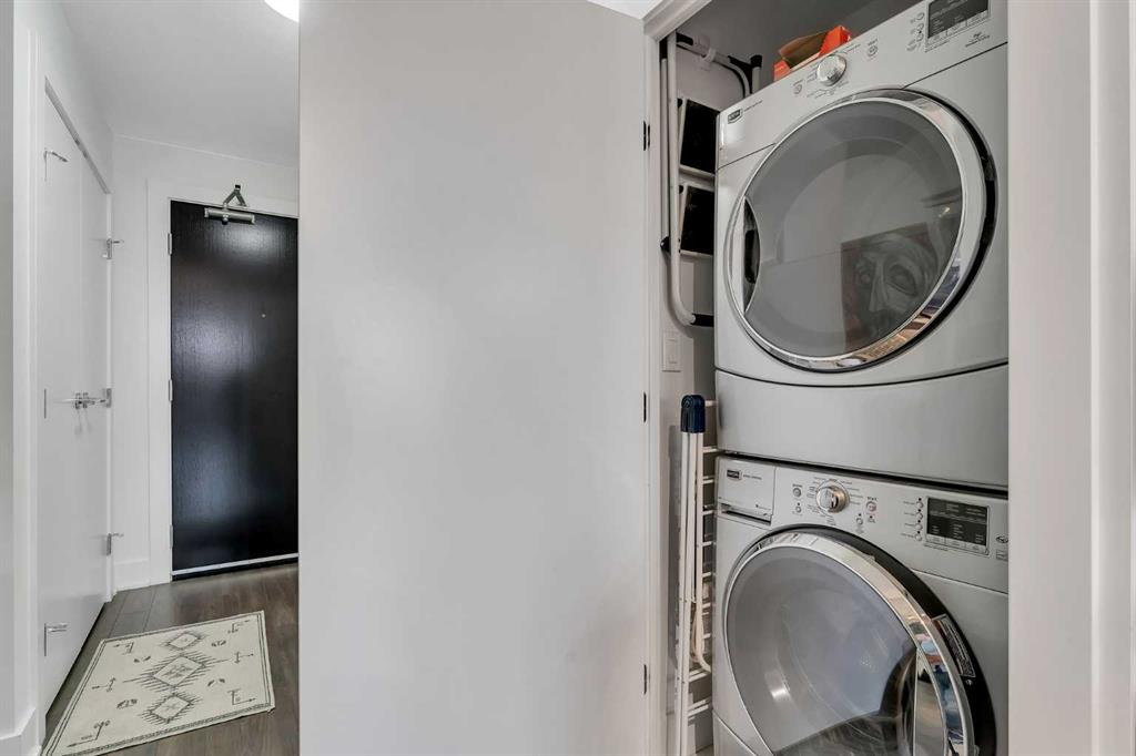 VIEWS VIEWS VIEWS / CENTRAL AC / PRIME LOCATION / Whether you're a first-time buyer or an investor, this 15th floor unit in the FIRST building is a must-see. Located in the heart of East Village, this sleek 1-bedroom, 1.5-bathroom condo combines modern finishings with unbeatable walkability—steps from RiverWalk, Superstore, Studio Bell, Calgary Library, transit, and more. Inside, you'll love the high ceilings, open layout, and natural light streaming through the east facing windows. Wake up to a beautiful sunrise and sounds of the picturesque river. This apartment features laminate floors, quartz counter tops, and full appliance package, including dishwasher, electric stove, microwave hood fan, refrigerator, and stacked in-unit washer/dryer. The bedroom offers a walk-in closet and private 3pc ensuite, while a separate 2pc powder room is perfect for guests. The unit also includes central air conditioning, a private balcony, assigned storage locker (locker 104-P1 -door 102), and titled underground parking (184-P3). FIRST is a newer concrete high-rise offering a ton of value at an affordable price. On the 18th floor, you will find a beautiful conference/board game room, large outdoor patio/bbq with views of the river, pool table with views of the Calgary tower and a massive social room that has a full kitchen and a SPICE kitchen for big events. On the 3rd floor, you'll find an fitness room, a separate yoga studio and a peaceful outdoor courtyard. There are also guest suites which can be booked. On top of all this, you get FULL TIME day concierge and security at night, 24/7 assistance and also visitor parking . Live in one of Calgary’s most vibrant inner-city neighborhoods with restaurants, shops, and river pathways right at your doorstep. Contact your favorite Realtor today to book a showing and see what elevated urban living feels like!