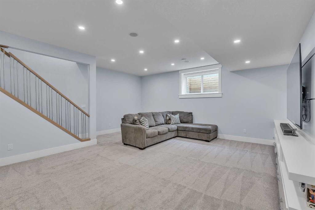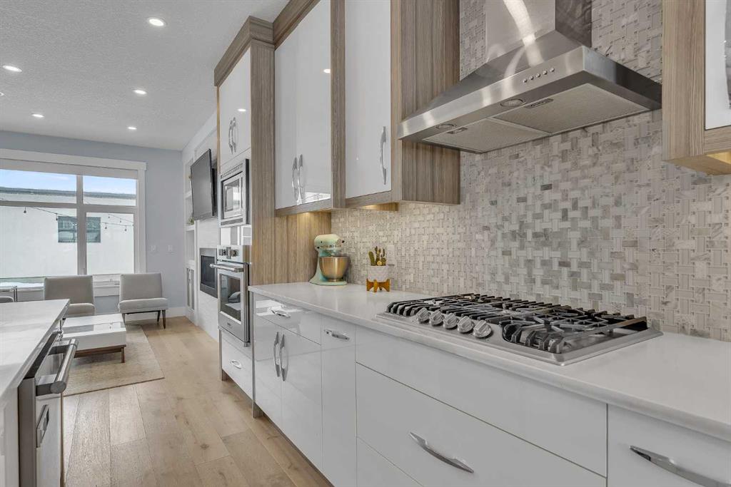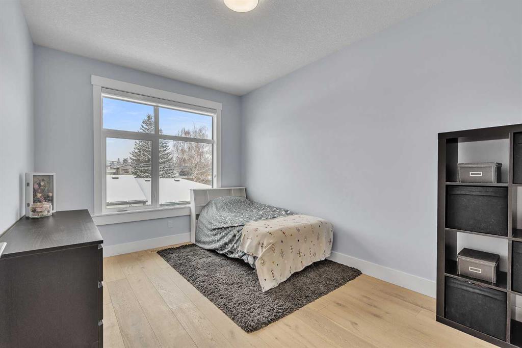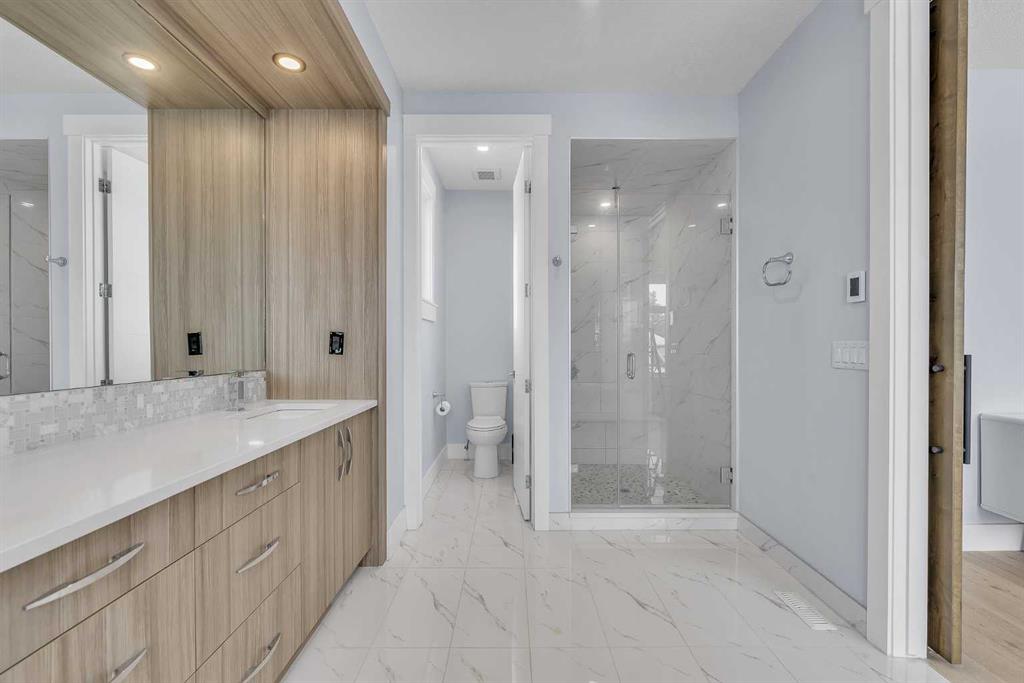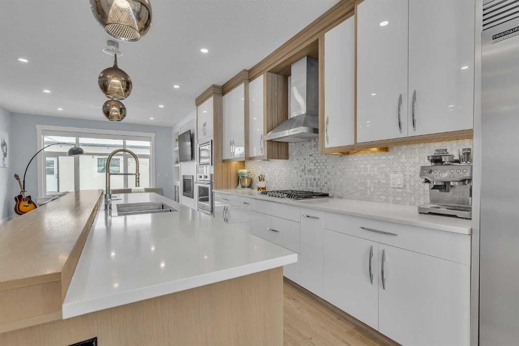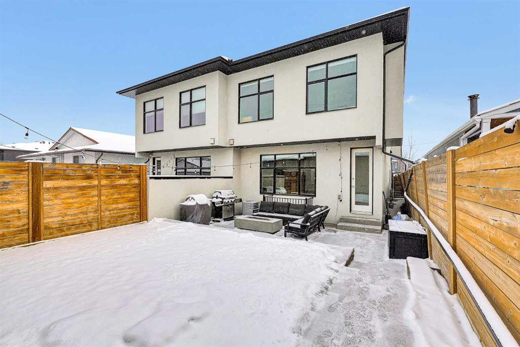 Upon entry, you’re welcomed by a spacious front formal dining area and distinctive hardwood flooring that flows throughout both the main and upper levels. The thoughtfully designed main floor showcases a striking hardwood staircase and a chef-inspired kitchen centered around an oversized quartz island with raised eating bar. The kitchen is further elevated by an extra-large, professional-grade fridge and freezer combination, offering exceptional storage and functionality for entertaining and everyday living. Additional main-floor features include ceiling speakers, a functional mudroom, a sleek modern linear fireplace with custom built-ins, and a convenient half bath. The upper level offers 9’ ceilings throughout, anchored by a luxurious primary retreat with vaulted ceilings, a beautifully appointed ensuite featuring heated floors, and a walk-in closet. Two generously sized secondary bedrooms, a full bathroom, and an upper laundry room with ample cabinetry, counter space, and a utility sink complete this level. The fully developed basement is ideal for entertaining, featuring a large media room with custom built-ins, a wet bar, a fourth bedroom, and a full bathroom, along with hydronic heated floors. Enjoy the fully landscaped, west-facing backyard, all just minutes from downtown, schools, and shopping. This exceptional infill home delivers modern living with standout features throughout.