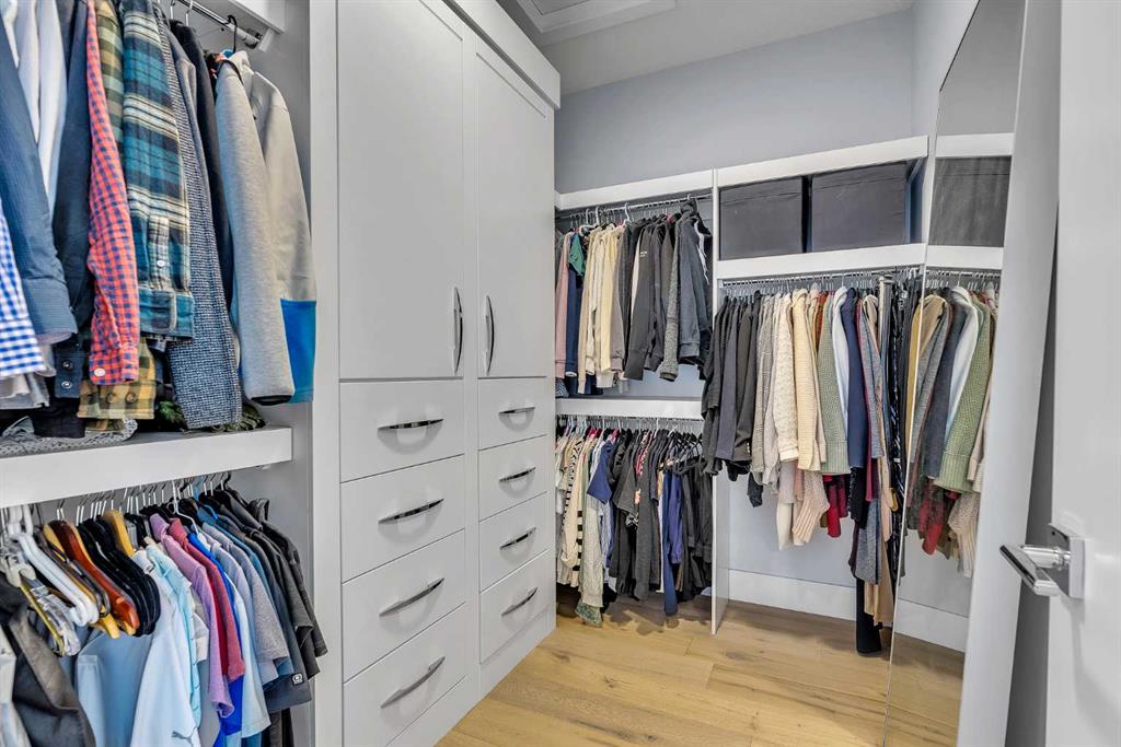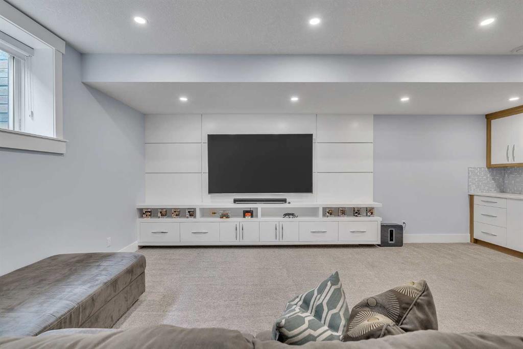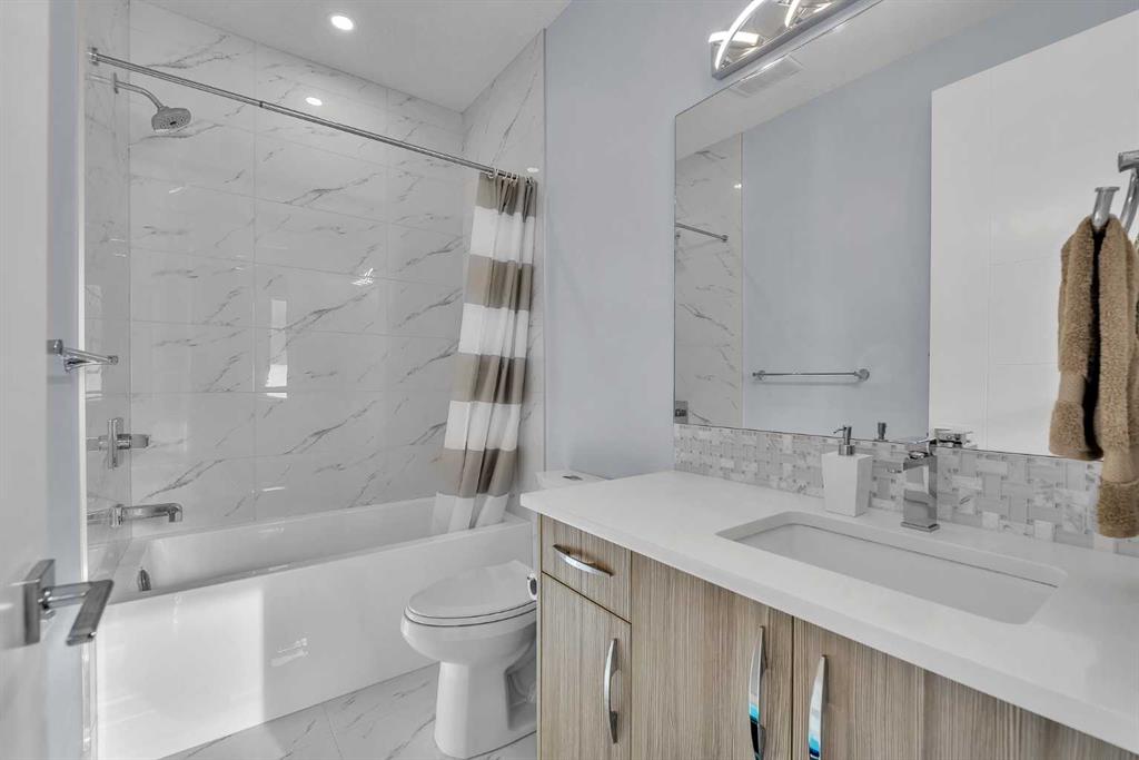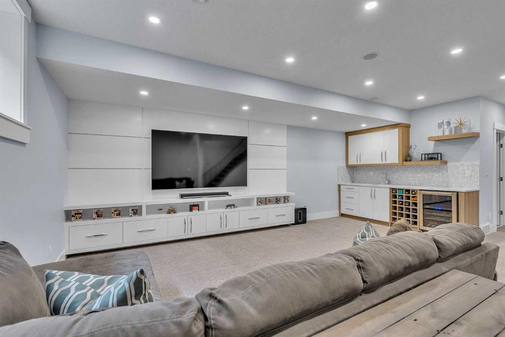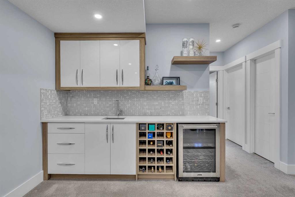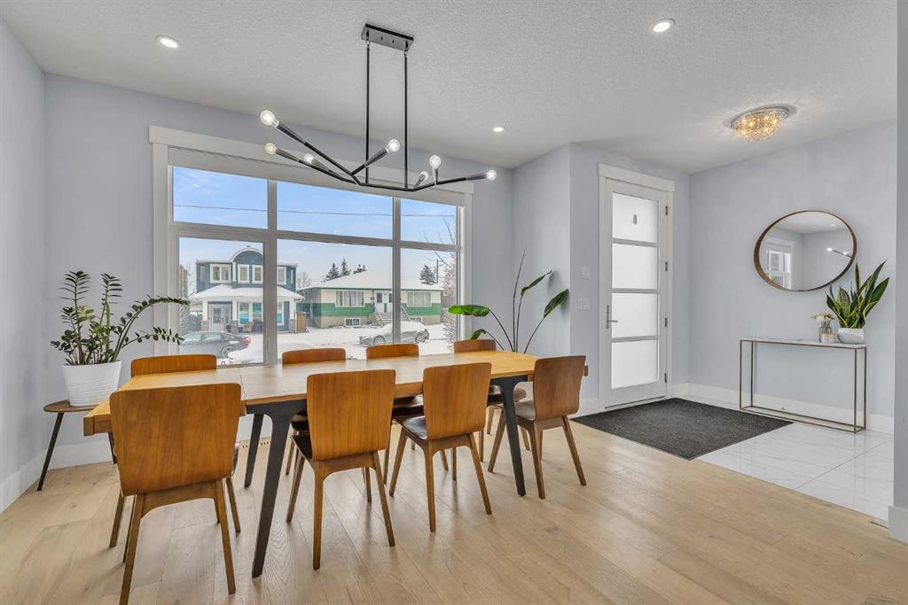 Upon entry, you’re welcomed by a spacious front formal dining area and distinctive hardwood flooring that flows throughout both the main and upper levels. The thoughtfully designed main floor showcases a striking hardwood staircase and a chef-inspired kitchen centered around an oversized quartz island with raised eating bar. The kitchen is further elevated by an extra-large, professional-grade fridge and freezer combination, offering exceptional storage and functionality for entertaining and everyday living. Additional main-floor features include ceiling speakers, a functional mudroom, a sleek modern linear fireplace with custom built-ins, and a convenient half bath. The upper level offers 9’ ceilings throughout, anchored by a luxurious primary retreat with vaulted ceilings, a beautifully appointed ensuite featuring heated floors, and a walk-in closet. Two generously sized secondary bedrooms, a full bathroom, and an upper laundry room with ample cabinetry, counter space, and a utility sink complete this level. The fully developed basement is ideal for entertaining, featuring a large media room with custom built-ins, a wet bar, a fourth bedroom, and a full bathroom, along with hydronic heated floors. Enjoy the fully landscaped, west-facing backyard, all just minutes from downtown, schools, and shopping. This exceptional infill home delivers modern living with standout features throughout.