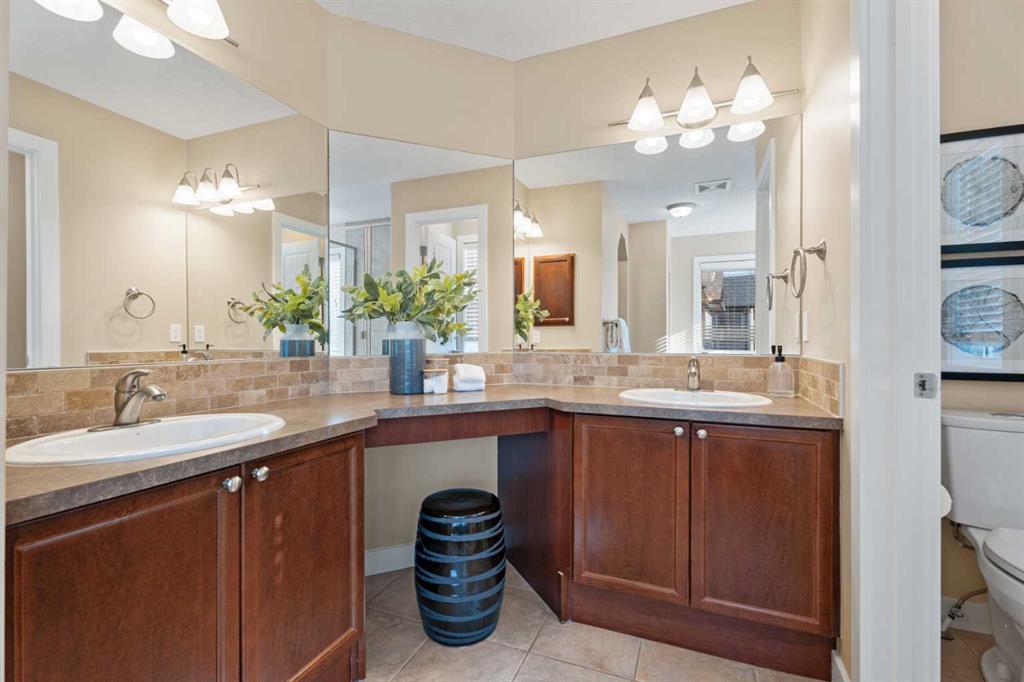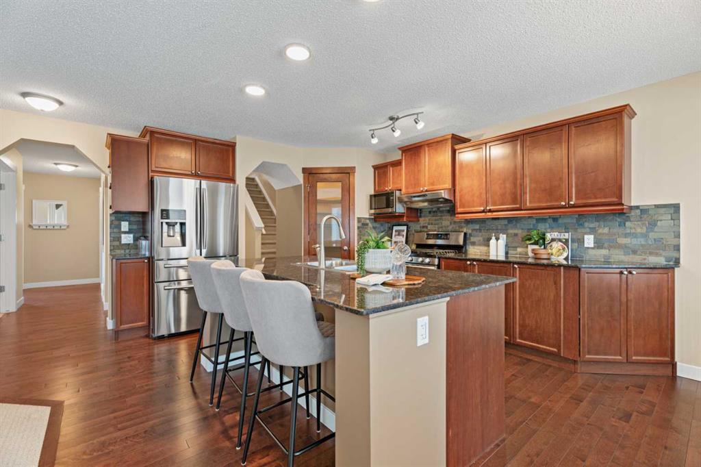 *Open House Sunday, March 22, 1-4 pm* Welcome to this beautifully maintained 2174 sqft two-storey walkout in one of the most sought-after neighbourhoods in Okotoks, close to schools and amenities. This 4 bed, 3.5 bath home with air conditioning offers a great functional layout and a professionally landscaped, private yard. The open-concept main floor features an awesome chef's kitchen with granite countertops, solid wood cabinetry, stainless steel appliances, a gas stove, and a large corner pantry with ample storage! The kitchen island has room for a few kids to eat their breakfast at, its open to the kitchen table nook and has a really cozy living room, with the fireplace as the main focal point, all overlooking the beautifully landscaped, west-facing backyard. Upstairs, you’ll find a spacious bonus room, central den area(great for computer desk and for doing homework), large upper laundry room, and three generous sized bedrooms. The large primary bedroom has a huge walk-in closet, a versatile coffee/juice bar with counter & cabinet, and a massive ensuite with a soaker tub, double sinks, and a stand-alone shower. The fully finished walkout basement provides a bright, private living space ideal for extended family or guests, complete with a kitchenette, fridge, carpet and heated tiles, 2nd large primary bedroom, and a full bathroom ensuite with a shower. Outside, enjoy a private, west-facing yard with mature trees, a gas fire pit with a granite surround included, and backing onto the main pathway system in Okotoks, walk or bike anywhere from here. Located close to parks, schools, off-leash areas, and more, this is a perfect family home in Drake Landing.