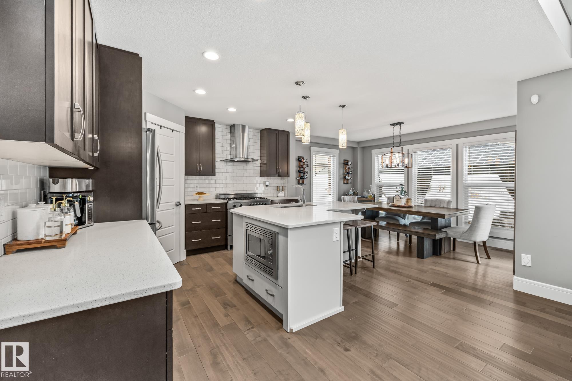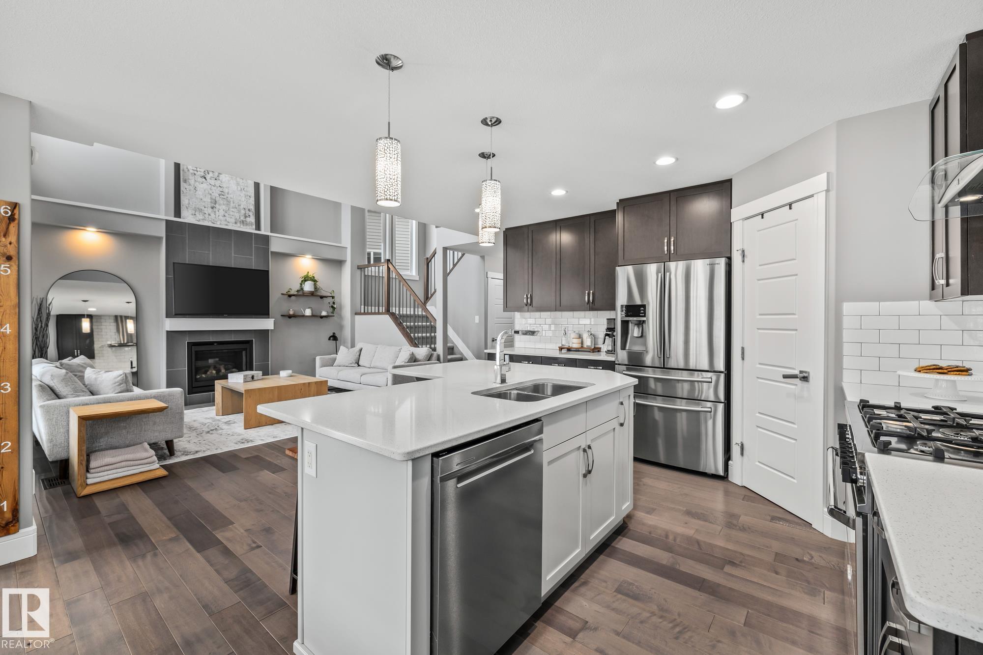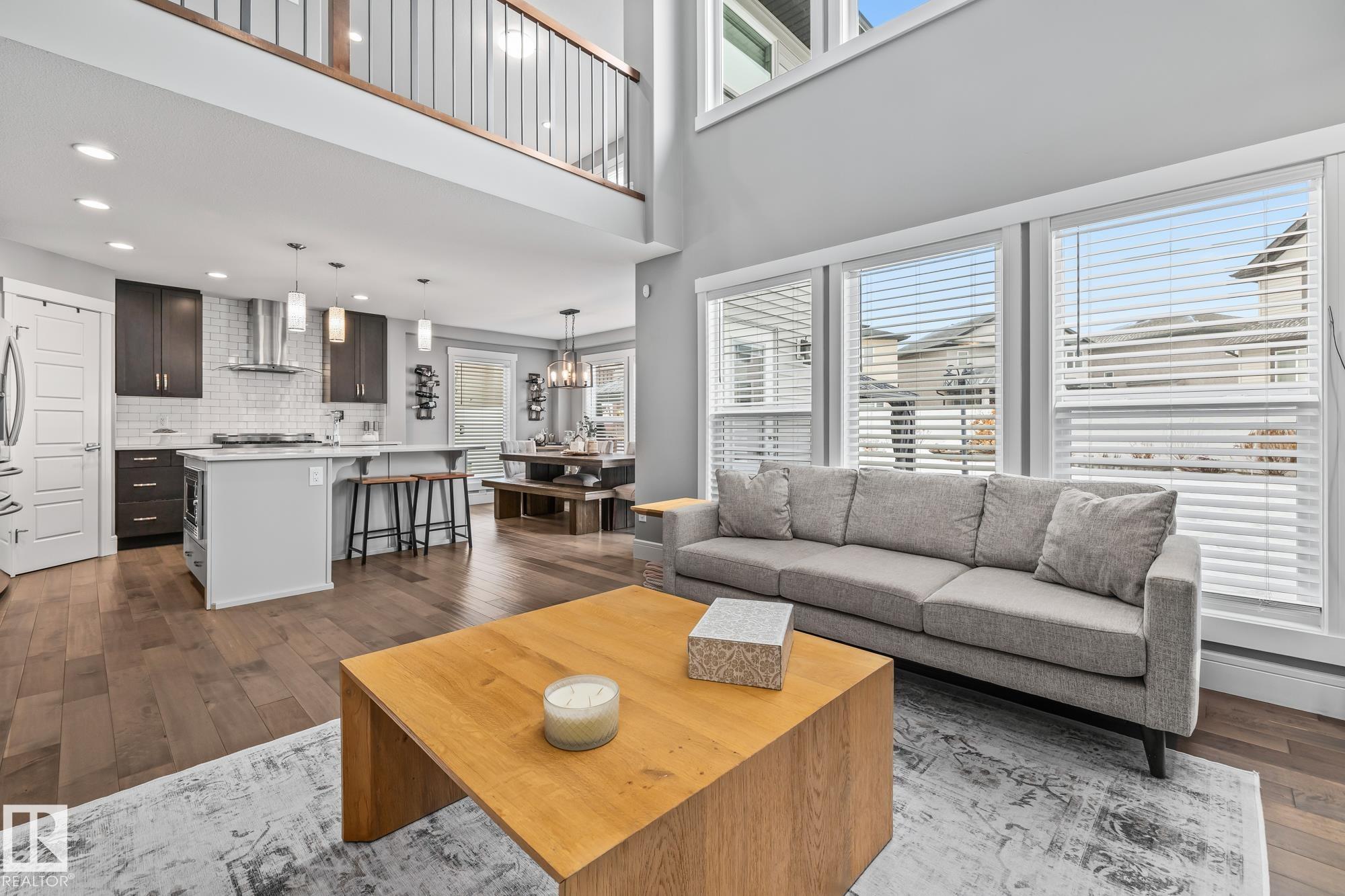 STUNNING EXECUTIVE 2 STOREY! Tucked away in a quiet cul-de-sac in Schonsee, this beautifully crafted custom home offers luxury finishes & a great floor plan. Featuring quartz counters, engineered hardwood floors, A/C, Lennox furnace & hot water on demand, the quality is evident throughout. The main floor boasts a bright foyer, mudroom, an office with a stone feature wall & fabulous chef’s kitchen with L-shaped island, gas stove, high-end s/s appliances, pantry, full-height espresso cabinetry & subway tile. The dining area offers a wall of windows, a door to the patio & overlooks the impressive living room with soaring cathedral ceilings & elegant fireplace. Upstairs, open to below, is a bonus room, laundry with drain, bath & 3 spacious bedrooms. The primary retreat features a w/i closet & spa-like ensuite, dual sinks, soaker tub & glass shower. The finished basement offers LVP flooring, a family room & flex/gym area. Set on a large lot with patio, shed & sprinkler system—an exceptional family home!!
