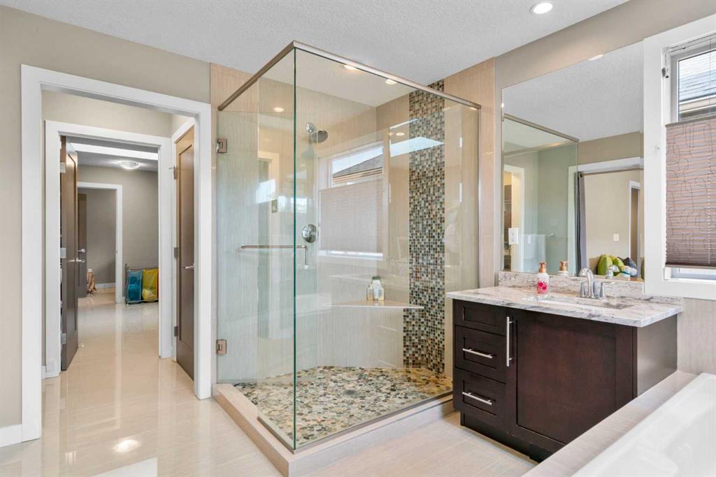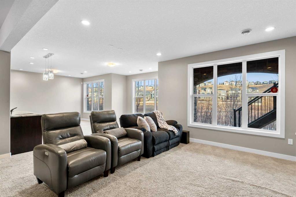 Welcome to this exceptional executive-style detached home, ideally situated on a pie-shaped lot backing directly onto a stunning environmental reserve in the sought-after community of Sage Hill NW. Offering over 4,100 sq. ft. of beautifully finished living space, this home combines upscale design, thoughtful functionality, and breathtaking views. From the moment you enter, you are greeted by a spacious open foyer and a private main-floor office featuring elegant double French doors—perfect for working from home. The main living area is highlighted by a soaring double-height ceiling in the living room, complete with a striking built-in fireplace feature flanked by custom shelving, creating an impressive yet inviting space. The chef’s kitchen is designed to impress, showcasing granite countertops, rich wood cabinetry, a massive island, built-in wall oven, professional double-size refrigerator, a pot filler above the stove top, and an oversized walk-through pantry that connects seamlessly to the mudroom. The mudroom offers exceptional organization with built-in hooks, shelving, a bench, and a walk-in coat closet, conveniently located off the attached front-drive double garage. Pristine hardwood flooring completes the main level. Upstairs, you’ll find four generously sized bedrooms and three full bathrooms, including an expansive primary retreat with a luxurious upgraded 5-piece ensuite and a massive walk-in closet that opens directly into the upper laundry room. Sky lights in the primary bathroom AND closet provide plenty of natural light. A rare and highly desirable second primary bedroom offers its own 4-piece ensuite and walk-in closet—ideal for teens, multi-generational living or guests. The fully finished walk-out basement features a large bedroom, a 4-piece bathroom, and a sprawling U-shaped family and recreation room with built-in shelving and a bar sink—perfect for entertaining or relaxing. In floor heat in the basement creates a cozy environment, and dramatically lowers the heating bills. Step outside to enjoy the fenced backyard with a deck off the kitchen, a lower paved patio, and unobstructed views of the picturesque environmental reserve—your own private oasis with no rear neighbors. A brand new roof, eaves, and stylish modern garage door were all recently completed in Fall of 2025. Additional features of the home include ceramic tile in entryways and bathrooms, mounted speakers on main and upper levels, upgraded lighting, including abundant pot lights, ceiling fans, and stair lights to the basement. Granite counter tops in the kitchen, all bathrooms, laundry room and basement wet bar complete the refined feel of this home. With extensive upgrades throughout, premium finishes, and an unbeatable location, this remarkable Sage Hill home offers luxury living at its finest.