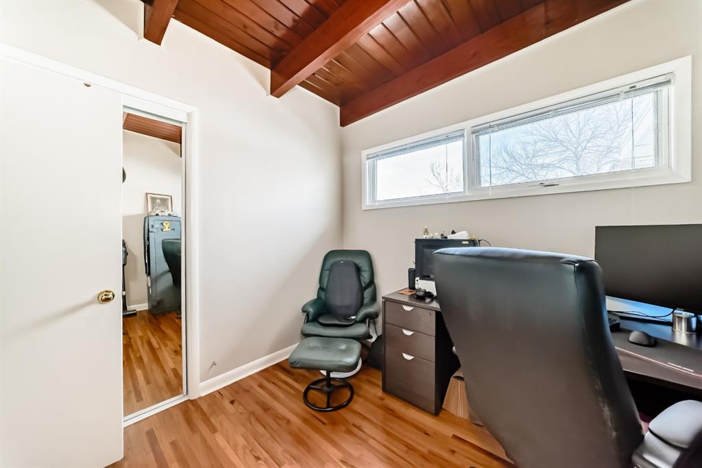 Welcome to this exceptional mid-century modern style bungalow, perfectly positioned across from a park and green space and zoned R-CG.. Showcasing timeless design, this home features stunning cedar plank ceilings with exposed beams and original hardwood flooring throughout the main level, creating warmth and architectural interest rarely found. Offering 4 bedrooms, a den, and 3 full bathrooms, the layout is both spacious and functional. The bright living and dining areas flow seamlessly, while the character-filled kitchen offers great potential and includes a charming eating nook. The primary bedroom is generously sized with large windows and a private 3-piece ensuite, complemented by two additional bedrooms and a full bathroom on the main floor—all bedrooms are bright, sun-filled spaces with oversized windows. The fully developed lower level features a separate entrance, a large family and recreation space, an additional bedroom, and a second room currently used as a bedroom (window does not meet egress requirements), plus a full bathroom and extensive storage. The large fenced yard, front patio for outdoor entertaining, and double detached garage complete this unique property. A rare opportunity to own a home with this much character and potential in an unbeatable location