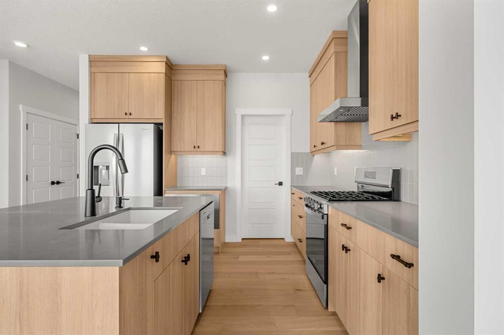 Welcome to 192 Belmont Passage SW, a beautifully designed brand-new two-storey home offering over 2,073 sq. ft. of thoughtfully planned living space plus a fully developed legal suite in the basement with separate exterior entrance, providing excellent flexibility for growing families or future potential. Located in the desirable community of Belmont, this home blends modern finishes, functional design, and everyday comfort. The main floor features a bright and open-concept layout enhanced by large windows that fill the home with natural light. The kitchen is both stylish and practical, complete with quartz countertops, a spacious island with breakfast bar seating, pantry storage, modern cabinetry, and a gas stove, making it ideal for cooking and entertaining. The adjacent dining and living areas create a seamless flow, while the electric fireplace in the living room adds warmth and a welcoming focal point. A versatile main floor den provides the perfect space for a home office, study, or flex room to suit your lifestyle. A convenient powder room and access to the rear deck with BBQ gas line enhance everyday functionality and outdoor enjoyment. Upstairs, the thoughtfully designed upper level offers comfortable accommodations for the whole family. The primary bedroom retreat features a walk-in closet with built-in organizers and a luxurious 5-piece ensuite complete with double vanity and soaker tub, creating a relaxing private space. Two additional bedrooms are generously sized and share a full bathroom, while the central family room offers valuable extra living space for relaxing, working, or spending time together. The upper-level laundry room adds convenience to daily routines. The fully developed basement expands the home’s versatility with two additional bedrooms, a full bathroom, a spacious recreation area, and a secondary kitchen, making it ideal for extended family, guests, or future rental possibilities. The separate exterior entrance enhances privacy and functionality. Additional highlights include engineered hardwood flooring, high ceilings, quartz counters throughout, closet organizers, modern finishes, partial fencing, and a double attached garage. This home is a no animal and no smoking property, offering you a clean environment as first owner. Situated in the growing southwest community of Belmont, residents enjoy convenient access to parks, playgrounds, pathways, nearby schools, shopping amenities, and major commuter routes. With its functional layout, quality craftsmanship, and move-in ready condition, 192 Belmont Passage SW presents an excellent opportunity to own a brand-new home designed for modern living.