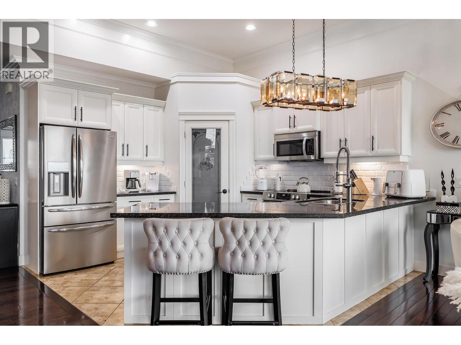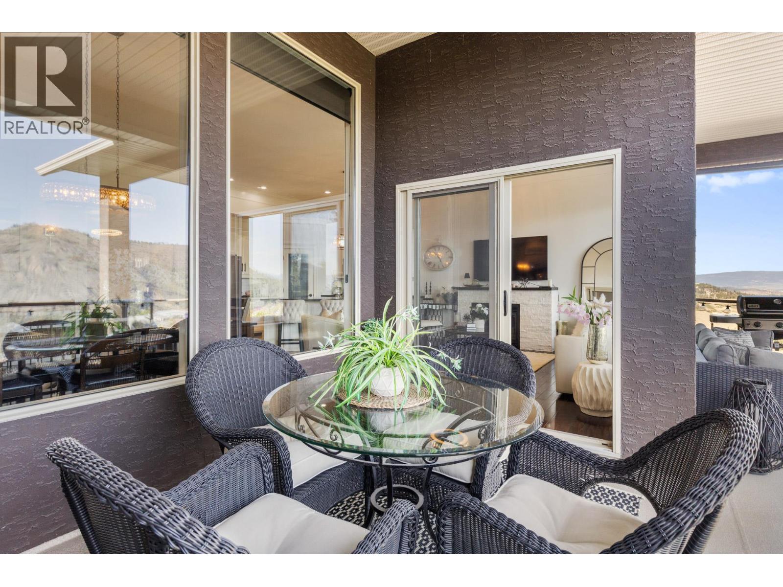 Discover elevated luxury living in The Highlands, one of West Kelowna’s most prestigious gated communities. This impeccably maintained 3,300+ sq ft walkout rancher offers impressive scale, refined finishes, and unobstructed lake, mountain, and valley views. Designed for grand entertaining and everyday comfort, the open-concept main level is enhanced by 12-foot ceilings, expansive windows, rich crown moulding, and gleaming hardwood floors that frame the stunning lake view outlook. The chef-inspired kitchen features newer stainless steel appliances, a convection range with built-in air fryer, granite island, and walk-in pantry. Step outside to the private, covered upper balcony with gas hookup—ideal for sunset dining and with exceptional privacy. The expansive primary suite is a nice retreat with a spa-inspired ensuite showcasing a double granite vanity, soaker tub, and separate shower. The lower level with two additional bedrooms, a full bathroom, and a spacious family room with oversized windows and walkout access to a covered patio offering secluded outdoor living and hot tub hookup. The fully fenced, beautifully landscaped backyard provides a serene, private setting. A standout media and recreation room with built-in bar, beverage fridge, and wine cooler completes this exceptional home. Quietly tucked away in a secure community yet minutes to schools, golf, shopping, and dining, this residence delivers luxury, space, privacy, and iconic Okanagan views without compromise.
