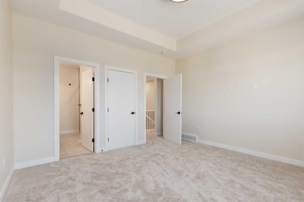 Experience the beauty of this custom-crafted Exquisite Home, set in the peaceful surroundings of Crossfield. This stunning pre-construction laned home offers 1,443 square feet of thoughtfully designed space across two stories, with soaring 9FT CEILINGS on every level to amplify its open feel. Ideal for enjoying the outdoors, the home features a charming front porch and a spacious backyard deck, perfect for hosting family gatherings on warm summer days. Inside, the main floor’s open-concept design harmonizes style with practicality. The modern kitchen is fully equipped with a breakfast bar, elegant quartz countertops, stainless steel appliances, and textured cabinets. Sunlight fills the bright great room, which is highlighted by a contemporary linear electric fireplace for a cozy ambiance. High-quality vinyl plank (LVP) flooring, sophisticated maple accents, and bold black exterior dual-pane windows add refined touches throughout the home. Completing the main floor is a conveniently located 2-piece powder room, designed for easy access and practicality. Upstairs, the inviting master suite provides a tranquil retreat with a luxurious 4-piece ensuite and a spacious walk-in closet. Two additional bedrooms offer ample space for family or guests, with another full bathroom and a practical laundry room with a sink enhancing daily convenience. Outside, a double detached garage, fully landscaped private backyard, and roughed-in basement with a separate side entrance allow for future customization and expansion. Bespoke finishing options are available, so you can personalize this home to suit your taste. Located in Crossfield’s welcoming Iron Landing community, this home is close to parks, playgrounds, shopping, and dining, as well as top-rated schools like Crossfield Elementary and W.G. Murdoch School, both just a short walk away. This peaceful neighborhood provides the best of small-town living while being under 10 minutes from Airdrie, 25 minutes from Calgary, and minutes from Highway 2 for easy commuting. Set for completion in March 2025, this Exquisite Home combines luxury, functionality, and affordability. Please note that photos are from a previous project, with our latest show home currently under construction. Don’t wait—reach out to make this incredible property yours today!