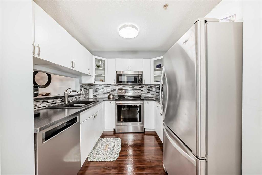 Welcome to this MOVE IN READY 2 bedroom, 2 bath, main floor unit at Tuscarora Manor backing onto GREENSPACE! Love the 1000 sq. ft. LIVING space. As you enter you'll notice the beautiful engineered hardwood floor taking you into a Bright, Welcoming, OPEN FLOOR plan. The kitchen, with SS appliances, is a perfect size and with the breakfast bar makes it convenient for a quick meal. There is also dedicated dining for family style "sit downs." Over the last 5 years the owner has updated most appliances. The living room is nice and bright with patio doors opening onto that greenspace out back. This gives a sense of having a yard without having to mow!.... Great area to spend with a morning coffee or evening BBQ. I hear even the moose come for a visit. Back inside the 2 bedrooms are an ample size and both face the green area. The master bedroom has a walk through closet to the 4 piece ensuite. The 2nd bedroom is perfect for guests or an office. Completing all you need is a Laundry room with Storage . Tuscarora Manor is conveniently located near the Tuscany LRT and Crowfoot Shopping District. Tuscany also has its own shopping area with Groceries, Coffee Shops and Restaurants. Stoney Trail and Crowfoot Trail make it an easy commute to work or out to the MOUNTAINS. This unit comes with 1 TITLED underground parking stall, #68, and an Assigned outside stall, #68. The building itself has a couple common areas one being the library/visiting area by the main doors and the other is a banquet room with kitchen for larger gatherings. The condo fee includes electricity which is a bonus. View this condo Today and Live here Tomorrow!