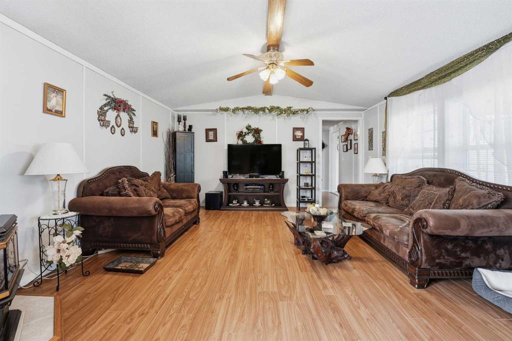 Nestled just minutes from town and surrounded by mature trees, this well-maintained mobile home park offers the perfect balance of peace, convenience, and community. Residents enjoy access to a recreation centre featuring a pool table, shuffleboard table, and a rentable kitchen, plus potential RV parking within the park. This inviting 3-bedroom, 2-bathroom home shows pride of ownership throughout. The attached double garage is insulated, drywalled, and roughed-in for gas, while a spacious mudroom and flex space addition connects directly to the garage for added functionality. The open-concept kitchen, dining, and living room form the heart of the home, complete with a gas fireplace and built-in hutch for added charm and storage. The kitchen renovation features modern cabinetry and stainless steel appliances, offering a clean, updated look. At the front of the home are two comfortable bedrooms and a renovated main 4-piece bathroom, while the primary suite at the back includes a walk-in closet and a beautifully updated 3-piece ensuite with a walk-in shower. Additional upgrades include the removal of Poly-B plumbing, updated flooring and paint, and a laundry/storage room with washer and dryer included. Experience relaxed, affordable living in a quiet, hidden gem of a community - a place where pride of ownership truly shines.
