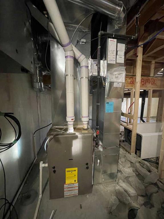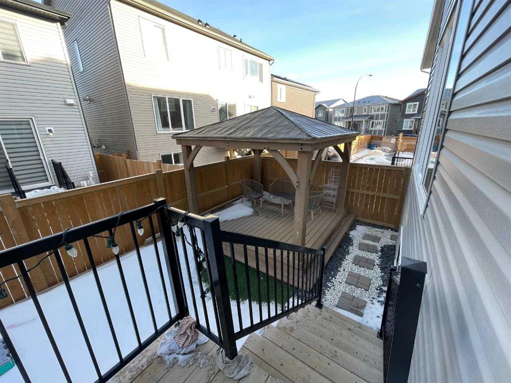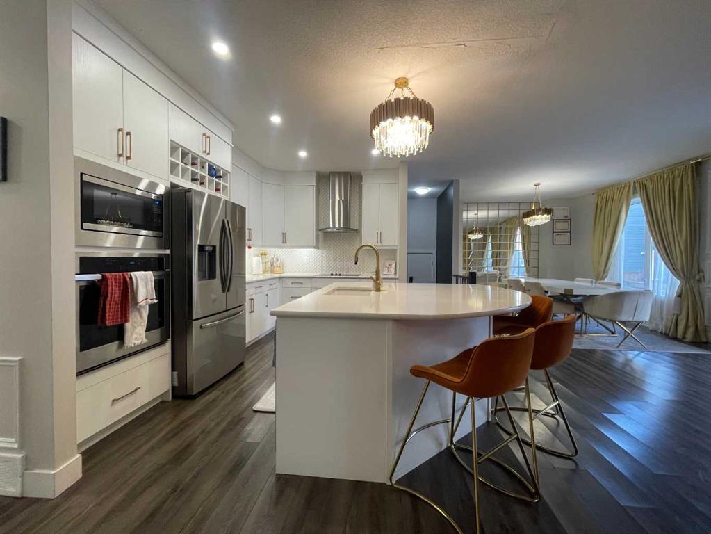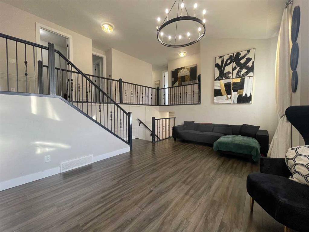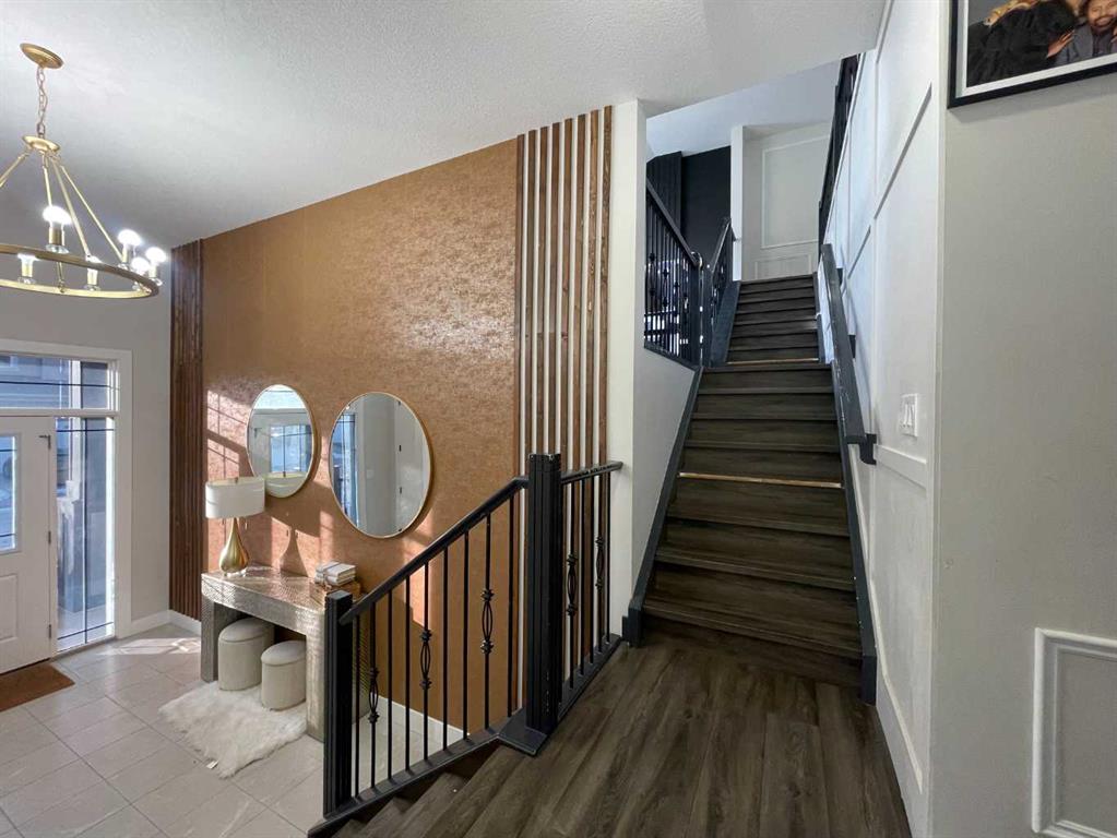 Ready for some finishing touches this architecturally distinctive home offers nearly 3,000 sq ft of developed living space in a prime NW Calgary location. Complete with a private side entrance to the unfinished basement. The main floor features soaring ceilings, wrought iron railings, wood panel accents, and a mix of laminate and tile flooring. The open-concept layout connects the kitchen, dining, and family room, creating a functional space ideal for everyday living and entertaining. Large windows bring in natural light, complemented by a feature wall and floor-to-ceiling tiled fireplace. The kitchen is well-appointed with a large quartz island, under-cabinet lighting, tile backsplash, ceiling-height cabinetry, brass hardware, bespoke lighting, and a full stainless steel appliance package including double-door fridge, glass cook top, hood fan, built-in microwave & oven, and dishwasher. Thoughtfully designed built-ins and open shelving and walk in pantry, provide practical storage with clean presentation. The main floor is completed by a half bath and a mudroom with added storage connecting you to the double attached garage. Upstairs, the bonus room stands out with vaulted ceilings, large windows, and continued wood accent detailing. The upper level includes four bedrooms, laundry, and two full bathrooms. The primary bedroom offers a walk-in closet and a spa-inspired ensuite with double quartz vanity, tiled walk-in shower, freestanding tub, and private toilet room. The secondary full bath also features a double vanity. The basement offers flexibility for extended family, guests, or rental income once renovations are completed. Currently framed out to include 2 bedrooms, kitchen/living space, laundry closet and bathroom. Located in Carrington, close to ponds, green spaces, schools, transit, and major roadways. A well-designed home with strong functionality and long-term value.