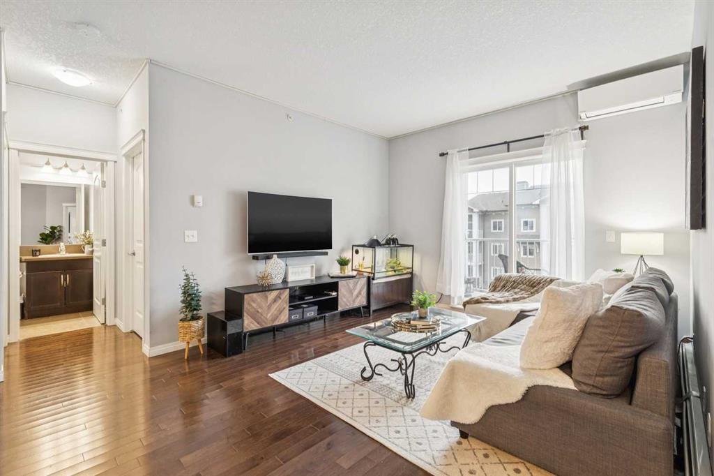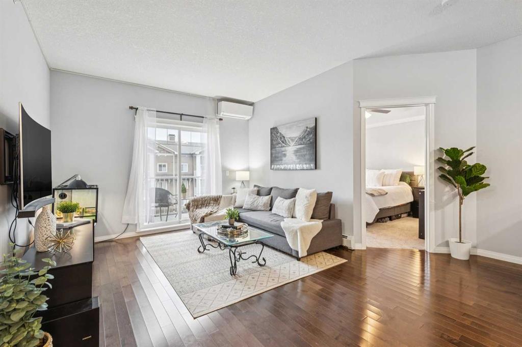 Welcome to this beautifully maintained top-floor condo in the heart of McKenzie Towne, offering comfort, style, and an unbeatable location. This bright and airy two-bedroom unit features 9-foot ceilings, rich hardwood floors, brand new carpets, stainless steel appliances, wood cabinetry, and granite countertops throughout the open-concept kitchen and living space. The well-appointed kitchen is complete with a peninsula island and breakfast bar, and flows seamlessly into a dedicated dining area and living room, ideal for everyday living and entertaining. Just off the main entry, you’ll find a versatile nook, perfect for a home office or reading corner. Enjoy outdoor living on your south-facing, covered balcony, ideal for relaxing year-round. Stay cool throughout the summer with AC in the unit. The spacious primary bedroom includes a ceiling fan, walk-in closet, and a private 3-piece ensuite featuring an oversized vanity. The thoughtfully designed layout offers bedrooms on either side of the unit, creating a private primary retreat, with the second bedroom conveniently located adjacent to the 4-piece main bathroom. Additional conveniences include in-suite stacked laundry, a storage locker, and underground titled parking, ample visitor parking with a simple registration system. Located just steps from the 130th Avenue shopping plaza, including Walmart, restaurants, and everyday amenities, this home offers a truly prime location near shopping and transit. Commuting is a breeze with quick access to Deerfoot Trail, Stoney Trail, South Health Campus, Fish Creek Park, and public transit. An exceptional opportunity to own a top-floor unit in the charming community of Mckenzie Towne.