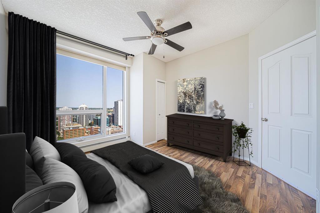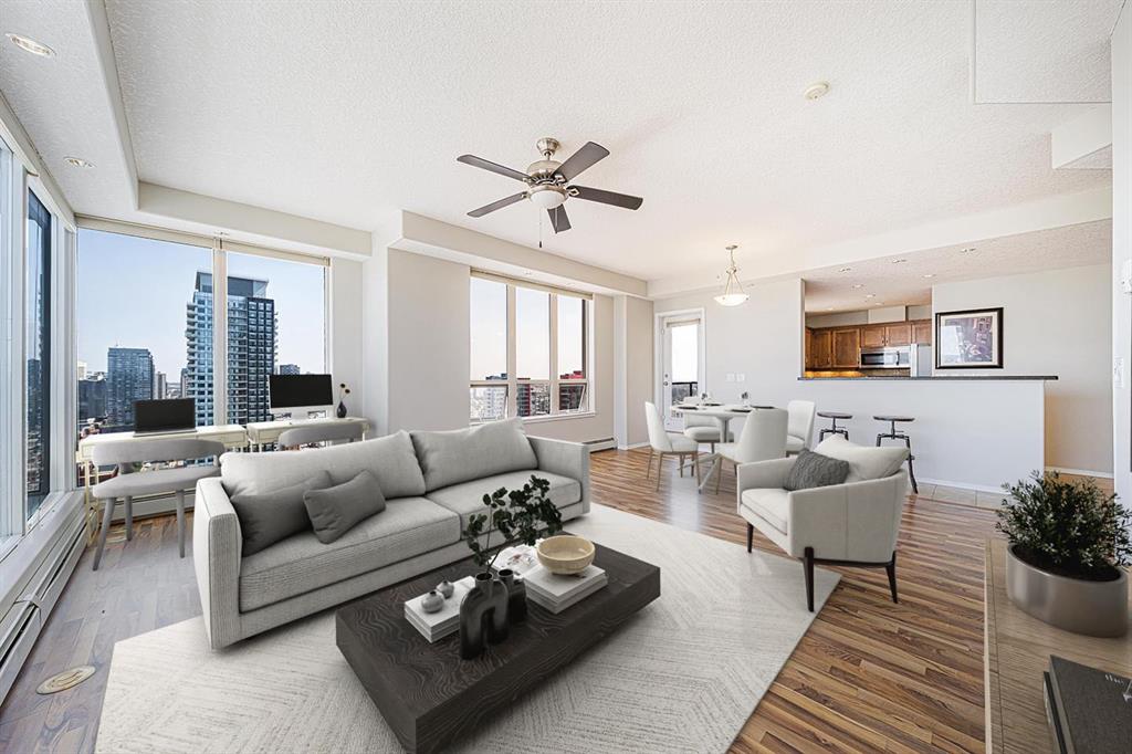 Fall in love with this stunning top-floor corner unit, offering breathtaking city views! This bright, sunny apartment features high ceilings, floor-to-ceiling windows, and a unique design. The open-concept living space is ideal for gatherings with a large kitchen, granite countertops, and a breakfast bar. Enjoy a spacious balcony with a gas outlet for barbecues, and forget gym memberships with a fully equipped on-site gym. All utilities are included with condo fees, plus heated underground parking and 24/7 security. Located in the heart of the Beltline, just steps from 17th Ave shopping, Co-op Grocery Store, Schools, Medical offices, River walk, City parks and the C train !