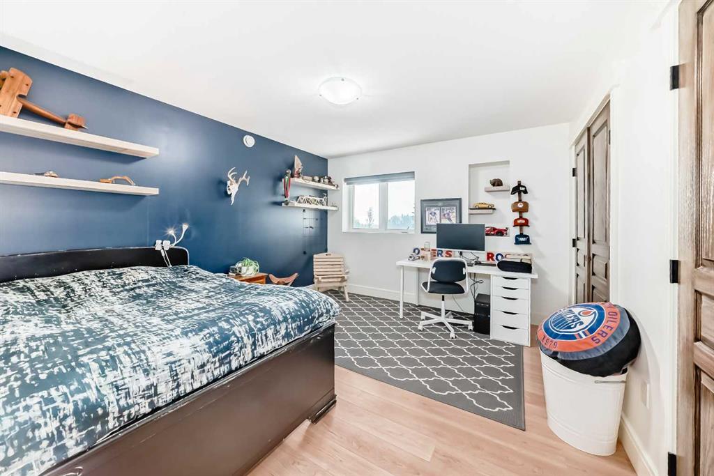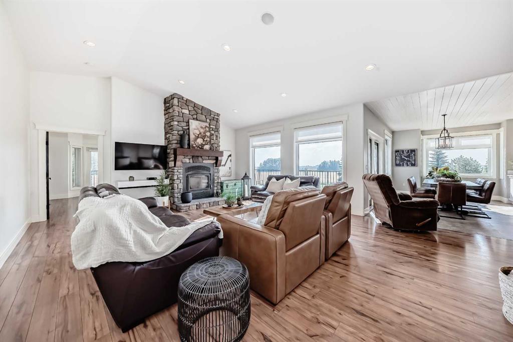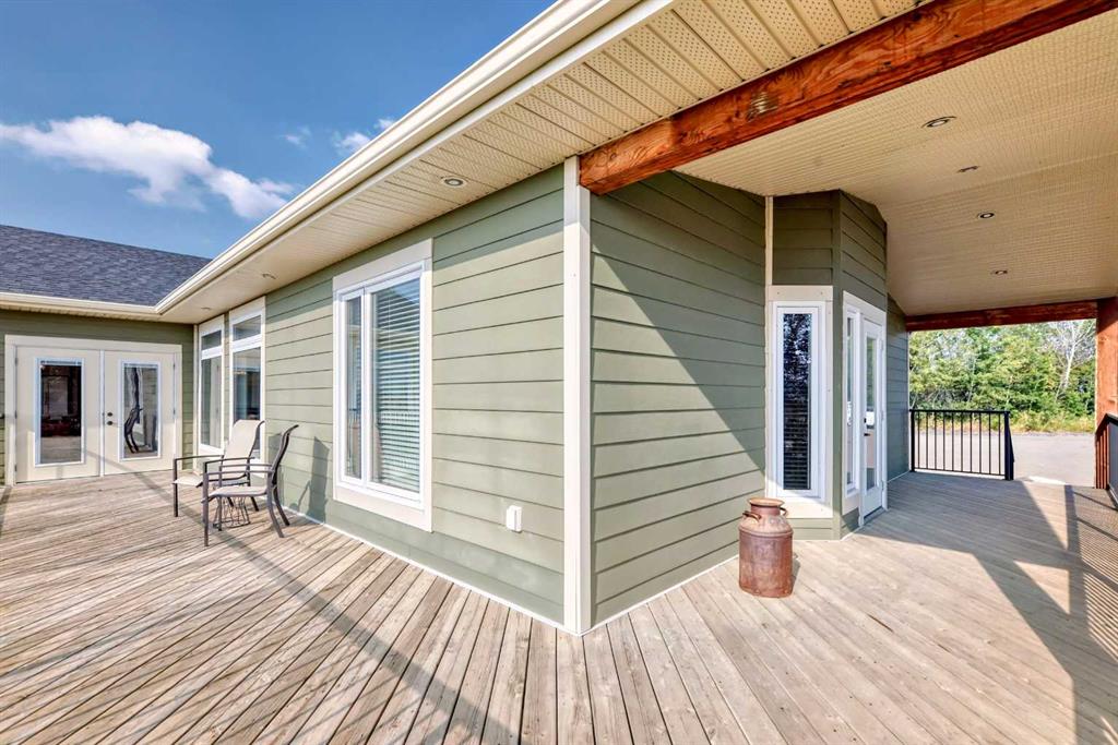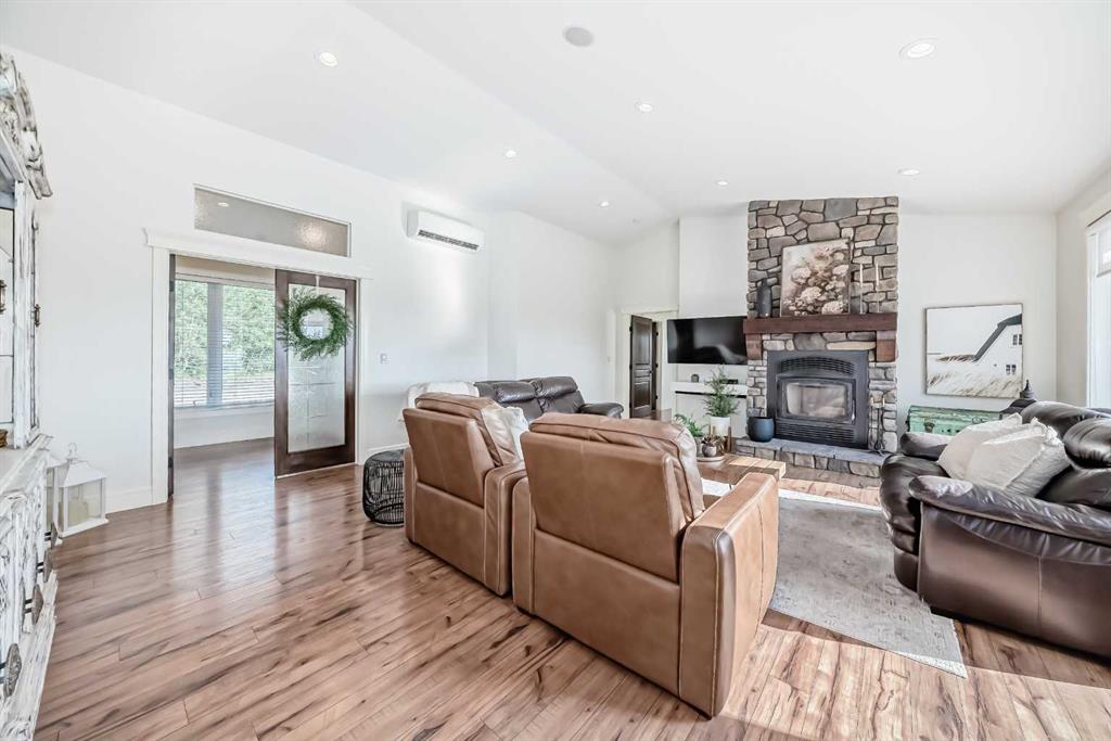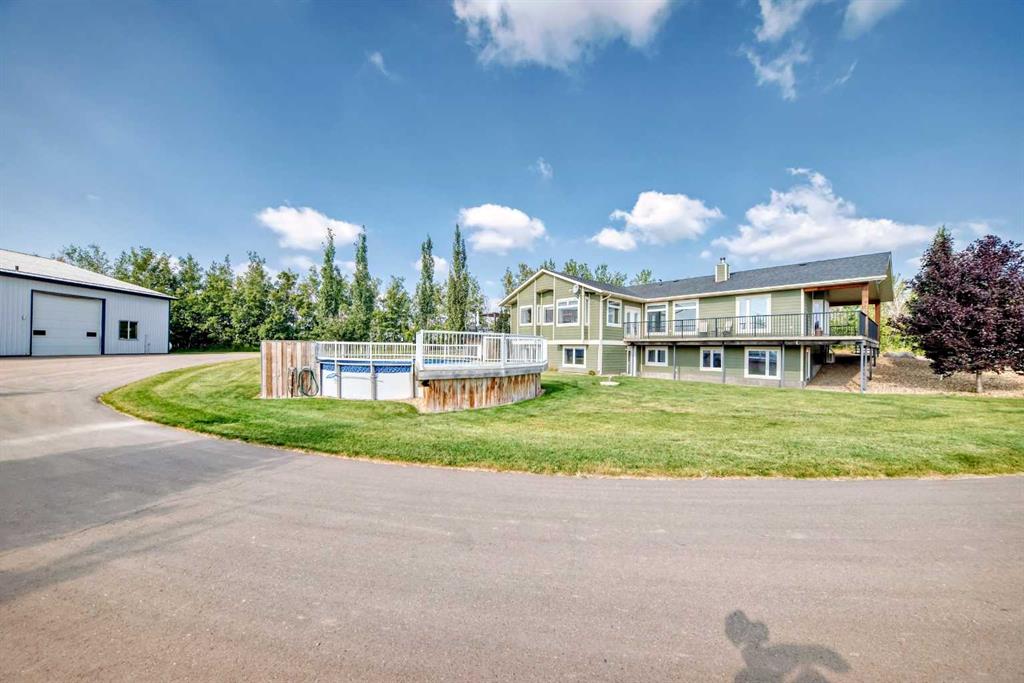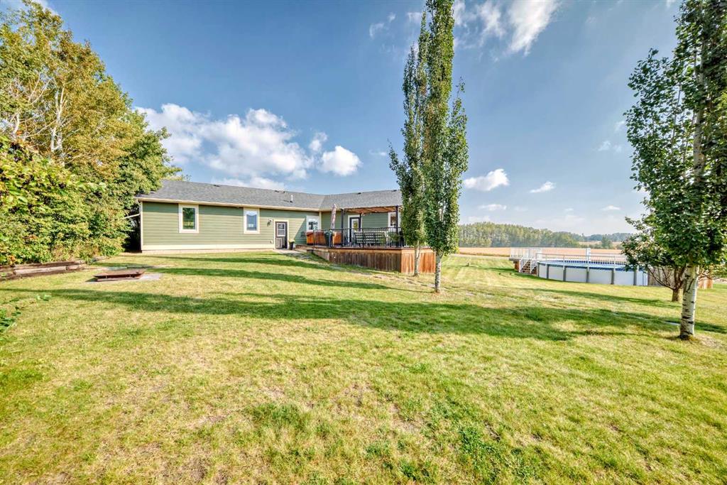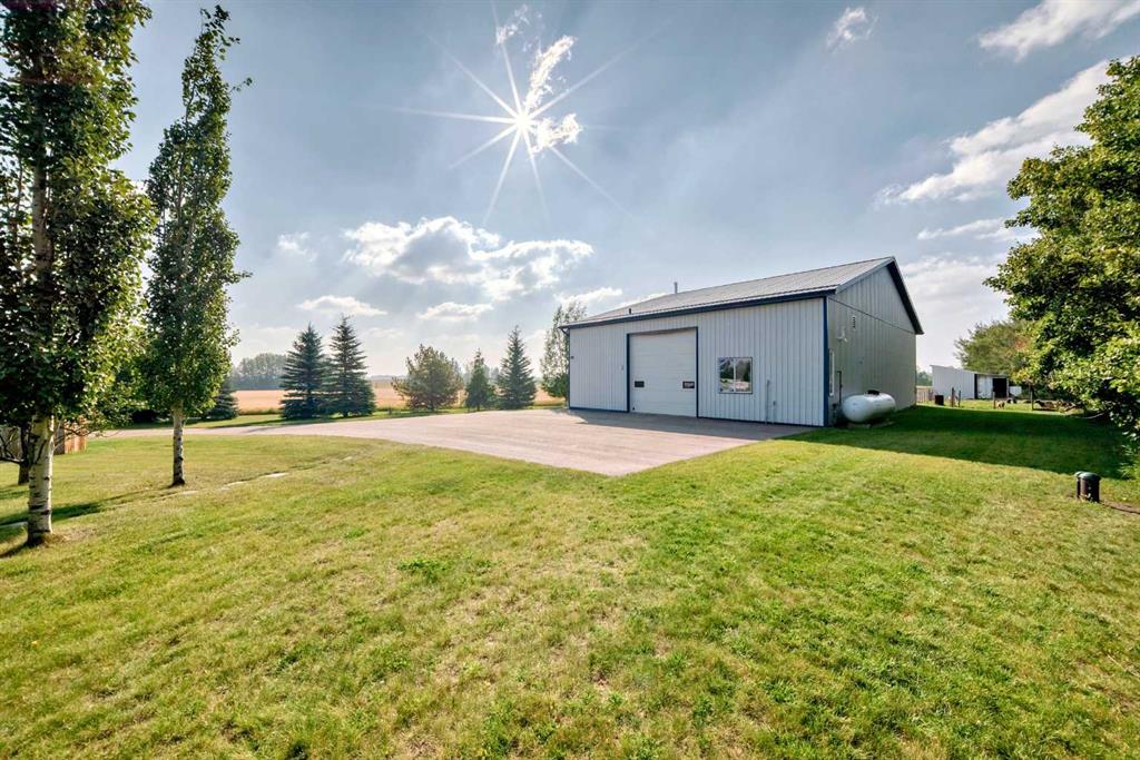 Experience the perfect blend of executive luxury and peaceful country living on this exceptional 29-acre private acreage, ideally located within 10 minutes from town, and with quick access to the Highway 2 corridor. This sprawling, like-new bungalow offers 4 bedrooms, 3 bathrooms, and a thoughtfully designed layout that balances everyday family comfort with impressive entertaining space. From the moment you step inside, pride of ownership is evident. Gleaming hardwood floors, warm neutral tones, and abundant natural light create a welcoming and refined atmosphere throughout the stunning main level. The living room is bright and inviting, centered around a striking stone-surround wood-burning fireplace that anchors the space beautifully. The kitchen is truly the heart of the home and is designed to impress with rich cabinetry, extensive counter space, granite countertops, and a large island with seating. Whether hosting guests or preparing family meals, this space delivers both style and functionality. The adjoining dining area easily accommodates gatherings of all sizes and features patio doors leading to the expansive deck, where you can soak in serene views of your private acreage. The primary suite offers a luxurious retreat, complete with a spacious walk-in closet and a spa-inspired 5-piece ensuite designed for relaxation. A dedicated main-floor office provides versatility for remote work or hobbies, while the stylish 2-piece powder room and a well-appointed laundry room with cabinetry, counter space, and sink add practical convenience. The fully finished walkout basement extends your living space with a large recreation room ideal for entertaining or unwinding. Three additional generously sized bedrooms and a 4-piece bathroom complete the lower level. Step outside to the covered patio overlooking the beautifully landscaped yard which is the perfect setting to enjoy Alberta’s seasons. Comfort is maximized year-round with in-floor heat on both levels and two ductless central air conditioning units. Outdoors, the mature trees, paved driveway, and carefully designed landscaping enhance the natural beauty and privacy of this remarkable property. The oversized attached garage (29.2’ x 27.1’) provides ample room for vehicles and storage. A standout feature is the large heated shop with in-floor heat and complete with a suite and extensive storage, offering endless possibilities for projects, equipment, or multi-generational flexibility. Additionally, the expansive gravelled flat site adjacent to the yardsite, equipped with power, is perfectly suited for parking large trucks, trailers, or heavy equipment. With 29 acres to call your own, this property offers more than just a home, it offers a lifestyle defined by comfort, space, and tranquility.