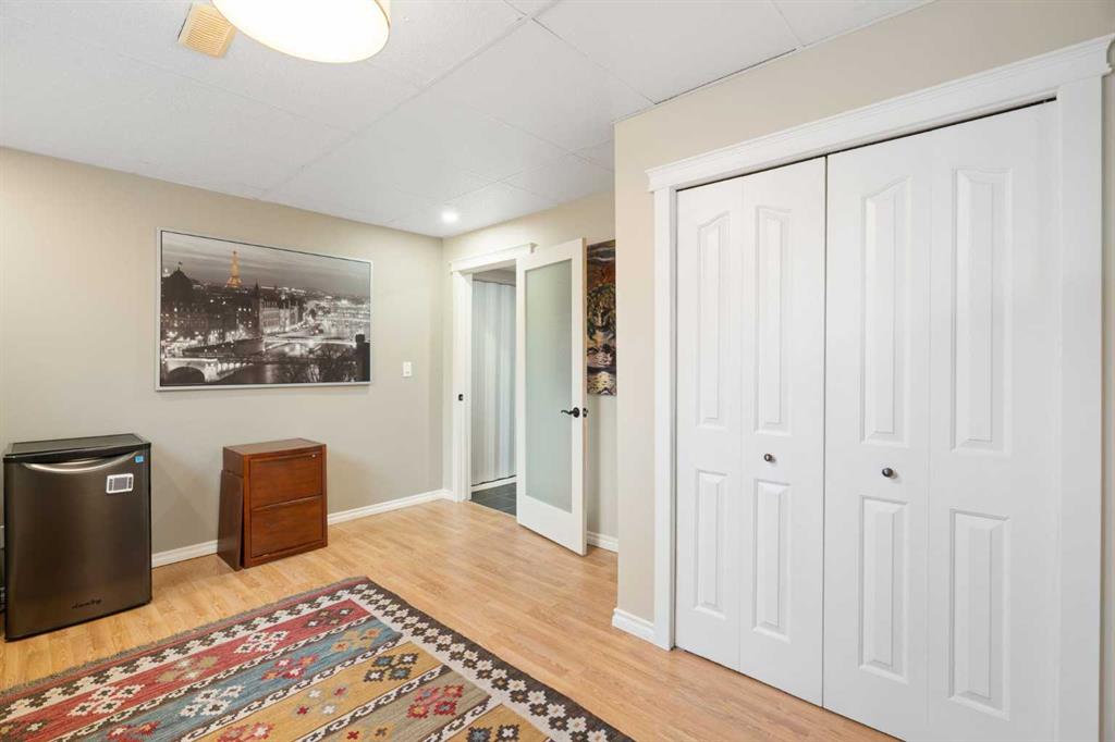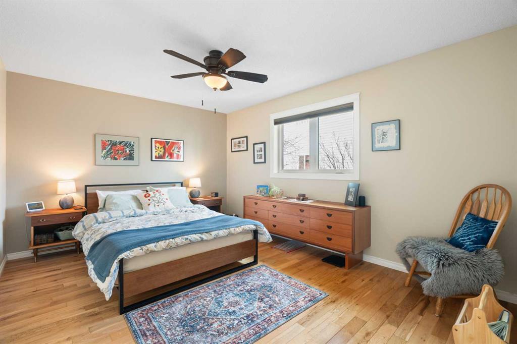 Rare opportunity to own an original-owner, custom-built bi-level by Schickedanz in the prestigious community of Bow Meadows. Tucked away in a quiet cul-de-sac with no through traffic, this meticulously maintained home sits on one of the largest lots in the area (668 SqM). The main floor is a showcase of timeless design, featuring vaulted ceilings and stunning hardwood floors. The gourmet-style kitchen is a masterpiece, boasting quartzite counters, ceiling-height soft-close cabinetry, a farmhouse sink, and a high-end stainless appliance package featuring an induction cooktop and built-in wall oven. A central island with breakfast bar and a built-in beverage cooler make this the ultimate space for entertaining. Retreat to the primary bedroom, complete with a walk-in closet and a 3-piece ensuite with heated floors. The fully developed lower level offers a spacious rec room with a wet bar, a cozy natural gas fireplace, two additional bedrooms, and a 4-piece bath with heated tile floors. Mechanical integrity is a priority here: Poly-B has been replaced with Pex, the hi-efficiency furnace and central A/C are newer (2023), and attic insulation was upgraded to R55. Outside, the massive south-facing backyard is a private oasis with a large deck, private patio and mature trees. Enjoy direct access to walking paths leading to the Bow River, with schools and shopping just minutes away. Complete with an insulated, drywalled, and heated double garage—this home is truly turn-key.