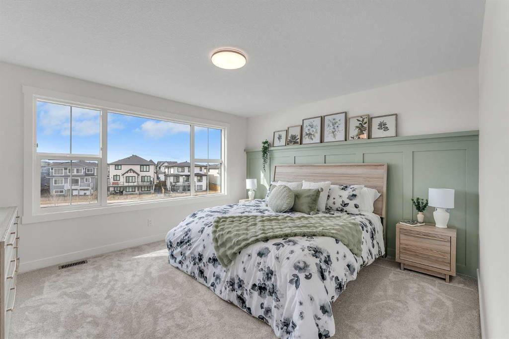 Welcome to 267 Kinniburgh Loop, a truly exceptional luxury home offering 3,294 sq. ft. of living space, 6 bedrooms, 4 full bathrooms, and a fully finished basement and Spice Kitchen. This home has been thoughtfully designed for both everyday living and entertaining. From the moment you arrive, you’re welcomed by an impressive oversized front door and a spacious, open entry that immediately sets the tone for the quality found throughout the home. Just off the foyer is a large main-floor bedroom or office, conveniently connected to a full bathroom with a standing shower—ideal for guests or multigenerational living. Pictures of similar model home spec subject to change. As you move further into the home, you’ll be captivated by the stunning chef’s kitchen featuring a nearly 9-foot island, quartz countertops, stainless steel appliances, full-height cabinetry, and high-end luxury finishes. The main floor is completed by a spacious living room with an electric fireplace, dining area, spice kitchen, and a walk-through mudroom with direct access to the garage. Everyday convenience is elevated with three main-floor closets, including two in the kitchen and one in the mudroom. Upstairs, a generous bonus room and sitting area create the perfect secondary living space. The expansive primary bedroom offers breathtaking pond views and connects to a spa-inspired 5-piece ensuite featuring dual vanities, a large glass shower with mosaic tile base, a freestanding tub, and a private toilet room. The ensuite flows seamlessly into the laundry room, which also offers access back to the bonus room for added functionality. The upper level is completed by two additional large bedrooms and another beautifully finished 5-piece bathroom, with no dropped beams on the main or upper floors for a clean, open feel. The fully finished basement extends the home’s versatility with two more spacious bedrooms, a large wet bar with fridge, and an additional washer and dryer hookup—ideal for extended family or entertaining. This home includes all of the renowned Golden Homes standards, such as true 9-foot ceilings on both the main floor and basement, triple-pane windows, side entry, matte black iron spindle railings, matte black hardware and fixtures, built-in shelving in the pantry and primary walk-in closet, upgraded carpet underlay, a tankless hot water heater, smart home features, gas lines to both the deck and garage, and a solar panel rough-in. The exterior is fully landscaped with the lot graded and loamed, sod installed to the side entry, and a front yard tree.