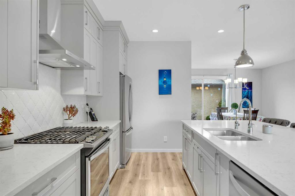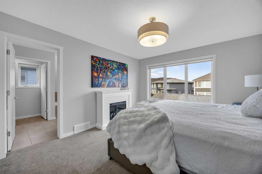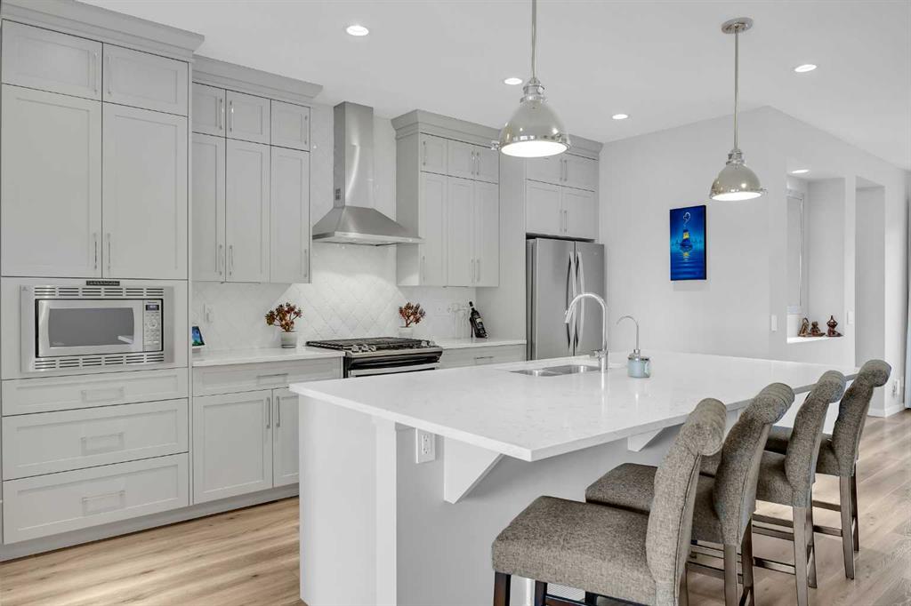 This executive paired home in Mahogany offers 1,888 sq. ft. of living space, a double detached garage, and incredible lake views. The main floor is bright and inviting, featuring oversized triple-pane windows, 9 ft. ceilings, and luxury vinyl plank flooring throughout. The stunning kitchen sits at the heart of the home and showcases extended Pewter cabinetry with soft-close doors and drawers, stainless steel appliances (including a built-in microwave and chimney hood fan), quartz countertops, and a large center island perfect for gathering with family and friends. A BBQ gas line adds convenience for outdoor entertaining. The living room takes full advantage of the lake views and includes a cozy gas fireplace, ideal for winter evenings. The spacious dining area easily accommodates a large table and provides access to the backyard patio through sliding doors. The home also features central air conditioning for year-round comfort. Upstairs you’ll find two bedrooms and a convenient laundry room complete with a front-load washer and dryer. The owner’s suite is a bright and relaxing retreat featuring a massive walk-in closet and a spa-inspired 5-piece ensuite with a soaker tub, separate shower, and private water closet. Located in an amazing estate area, just steps from the lake and beach, this home perfectly combines luxury, comfort, and the beauty of Mahogany’s lakefront lifestyle.