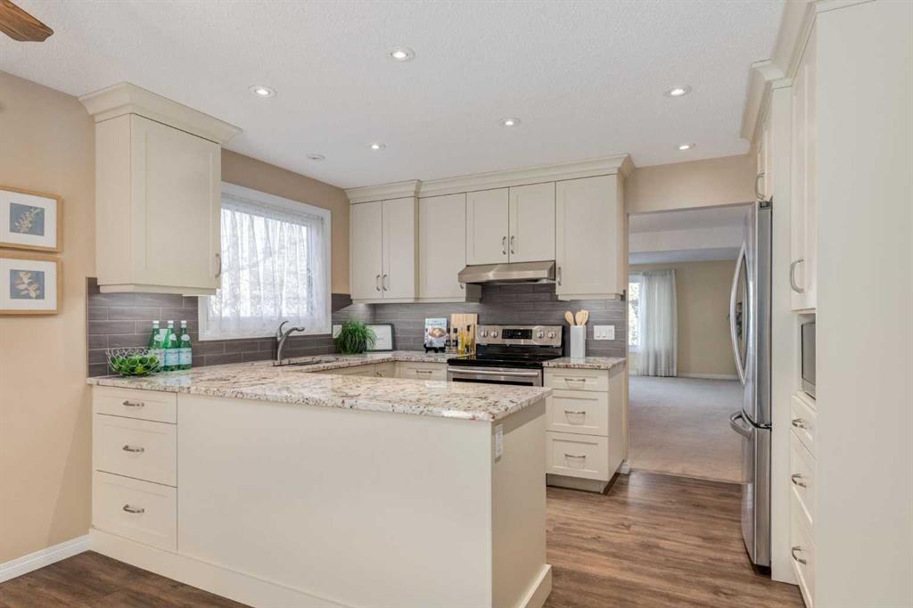 Welcome to this UPDATED and well-maintained OVERSIZED, fully finished WALK-OUT bungalow with kitchenette in the lower level, in the highly sought-after, family community of Hawkwood. This charming corner-lot home with double front attached garage offers 3 spacious bedrooms up, 3 full bathrooms, spacious south facing deck off the family room, over 2,900 Sq Ft of finished living space - perfect for family living and entertaining. You’ll love the spacious living and dining room, totally RENOVATED kitchen with an abundance of white cabinets, granite counters & stainless steel appliances. Adjacent to the kitchen is an expansive dining and family room featuring a gas fireplace - ideal for both everyday living and entertaining. Patio doors lead to the lovely south facing deck with newer vinyl covering (2020), with stairs to the backyard. Primary bedroom easily accommodates king-size furniture and features a bay window with bench, walk in closet and 4 piece ensuite bath. 2 additional bedrooms are both generously sized and 4 piece main bath completes the level. The fully developed walk-out basement includes a huge recreation room with cozy gas fireplace, 2nd kitchen, two rooms (windows are not egress size), 4 pc bath and patio doors to the backyard. An ideal space for guests or extended family. The backyard offers a large green space with mature landscaping, planter boxes with many perennials – a beautiful space for your summer enjoyment! You’ll appreciate all the updates completed in the home over the years: Hardwood floors in the bedrooms (2008) and luxury vinyl plank flooring in kitchen & family room (2016), new flooring in basement (2009), all main floor windows and both patio doors replaced (2011), new shingles (2018), high efficiency furnace (2010), front and back landscaping redone over the past 5 years. Enjoy this convenient location with easy access to transit and main traffic routes. Don’t miss out on this fantastic opportunity – book your viewing today!