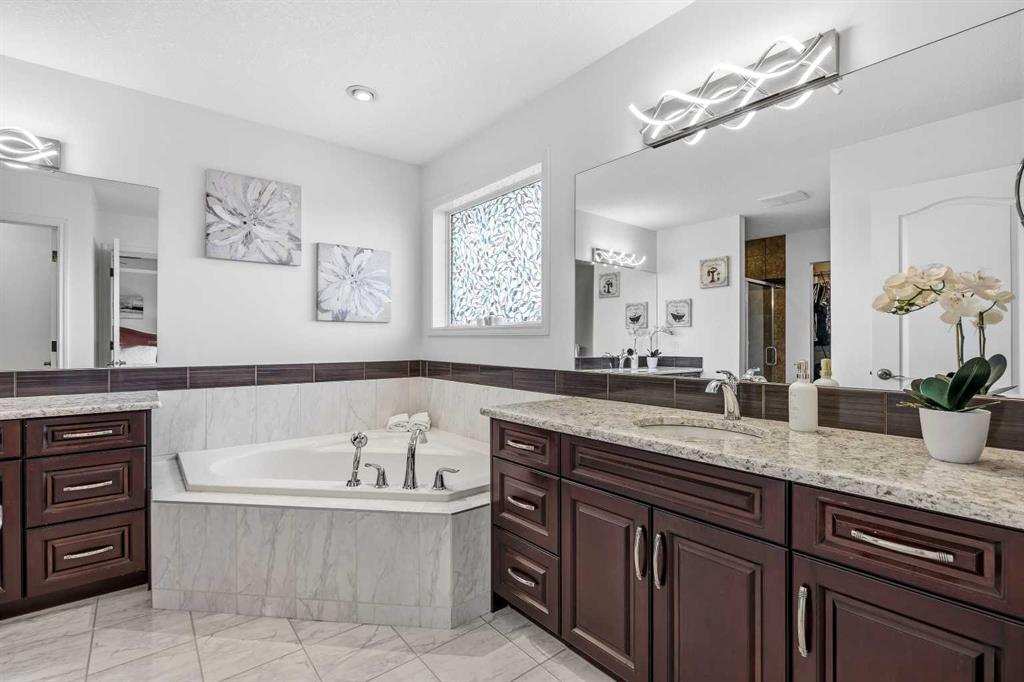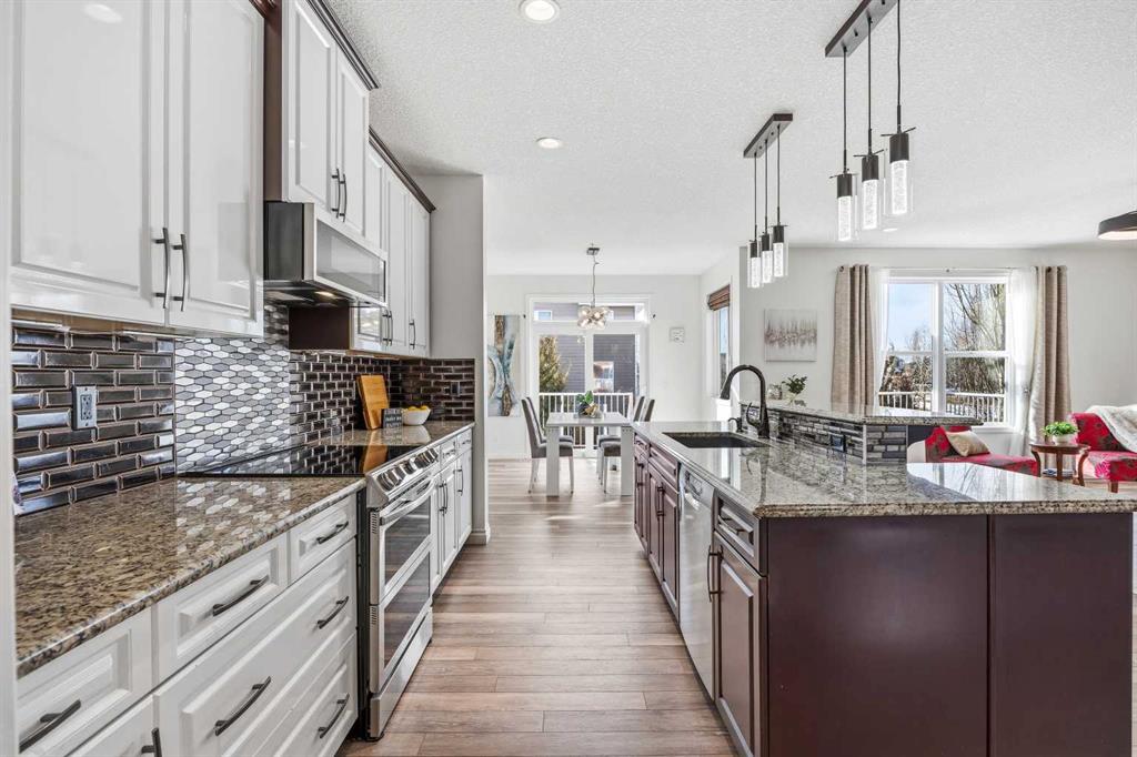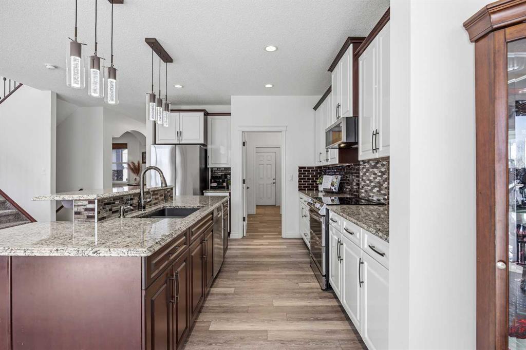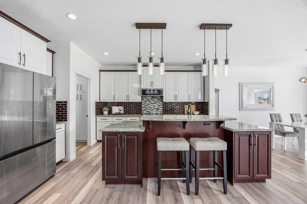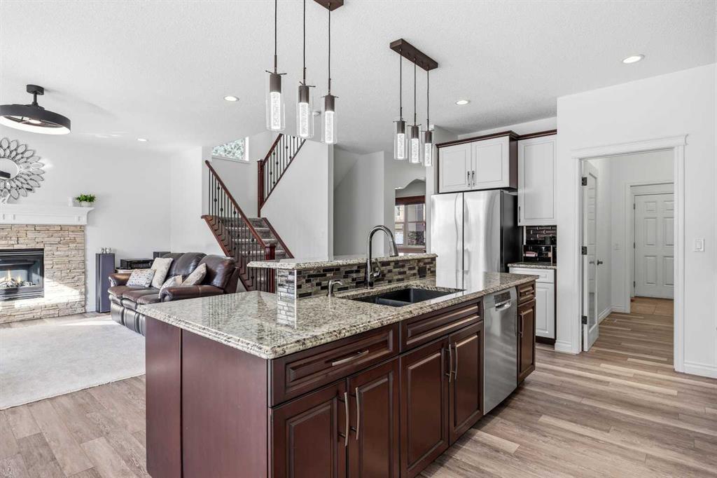 Open House March 14, 2-4pm. Welcome to Air Ranch, one of Okotoks’ most desirable communities. This beautifully maintained two-storey home offers nearly 2,700 sq. ft. above grade, four bedrooms, and a rare heated quad garage with a tandem third bay. (With approximately 826 sq. ft. of garage space, car enthusiasts and hobbyists will appreciate the tandem bay, complete with drains for washing, a sink, insulated doors, a separate ventilation fan for working on cars, and wiring for 220V.) Situated on a quiet street backing directly onto green space, pathways, and a playground, the location is ideal for families who value both privacy and connection to the outdoors. Inside, the main floor features a bright open layout with high ceilings and updated new vinyl flooring throughout. The kitchen is truly the heart of the home with two-tone cabinetry, granite countertops, updated backsplash, a raised eating bar, and a walkthrough pantry complete with built-ins and a coffee bar — an excellent setup for both everyday living and entertaining. The dining area and living room with gas fireplace overlook the backyard and open green space beyond. A main floor office or den, mudroom with great storage, and powder room complete the level. Upstairs you’ll find a spacious bonus room with vaulted ceilings, convenient upper laundry, and three generous bedrooms including the primary suite featuring heated floors in the ensuite, dual sinks, quartz countertops, a soaker tub, and a large walk-in closet. The main upper bathroom also features quartz countertops and an extended vanity with plenty of storage. The fully finished basement adds even more living space with a large recreation room with a second fireplace, fourth bedroom, and full bathroom, making it perfect for movie nights, guests, or a home gym. During the basement development, extra spray foam insulation was added for improved comfort and efficiency. Recent updates provide additional peace of mind, including new paint throughout the walls and baseboards (2025), new carpet (2025), a new refrigerator (2025), and a new hot water tank (2025). Additional features include central air conditioning, wiring for a hot tub under the deck, a dual-zone furnace, water softener, reverse osmosis to the fridge, and excellent storage throughout. Backing onto parks and pathways and located close to schools with quick access to Calgary, this home offers space, functionality, and a fantastic location in one of Okotoks’ most sought-after neighbourhoods.