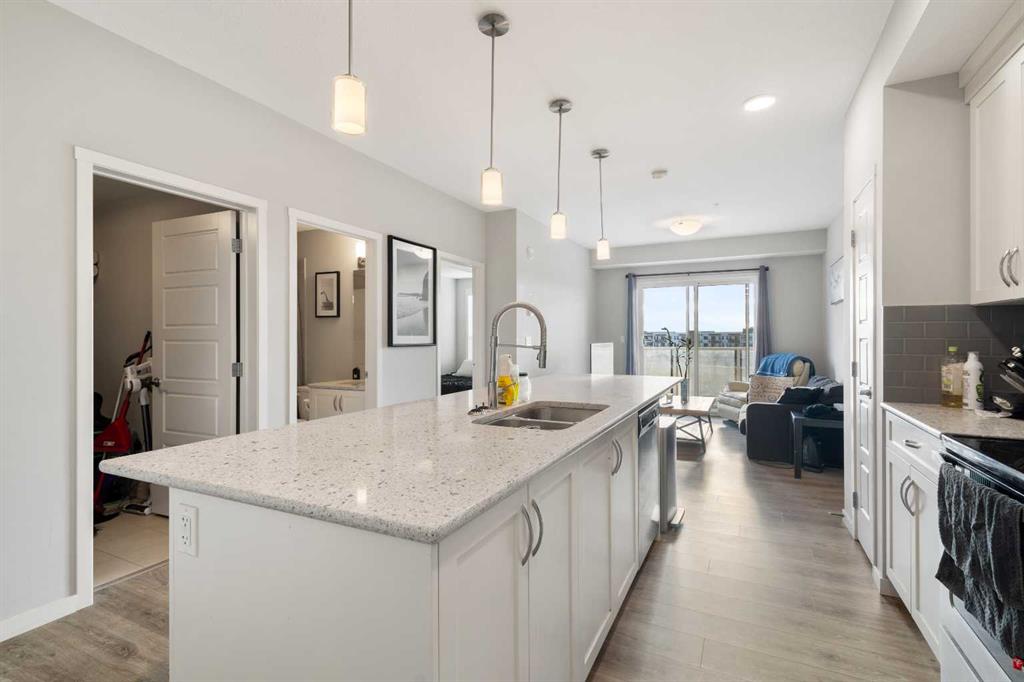 Welcome to Seton Park, one of the most convenient and desirable locations in South Alberta. This newer, beautifully upgraded unit features 9-foot ceilings, an extended island with granite countertops, and raised cabinetry with elegant crown molding. The south-facing balcony floods the living room and bedrooms with abundant natural light, creating a bright and welcoming space. The home offers two full-size bathrooms, titled parking, and the added convenience of heat and water included in the condo fees. Enjoy unbeatable walkability, just a 2-minute walk to South Health Campus, the YMCA, schools, and Seton Plaza with shopping and dining options. With Stoney Trail and Deerfoot Trail right at your doorstep, commuting is effortless. An excellent opportunity to own a beautiful unit.
