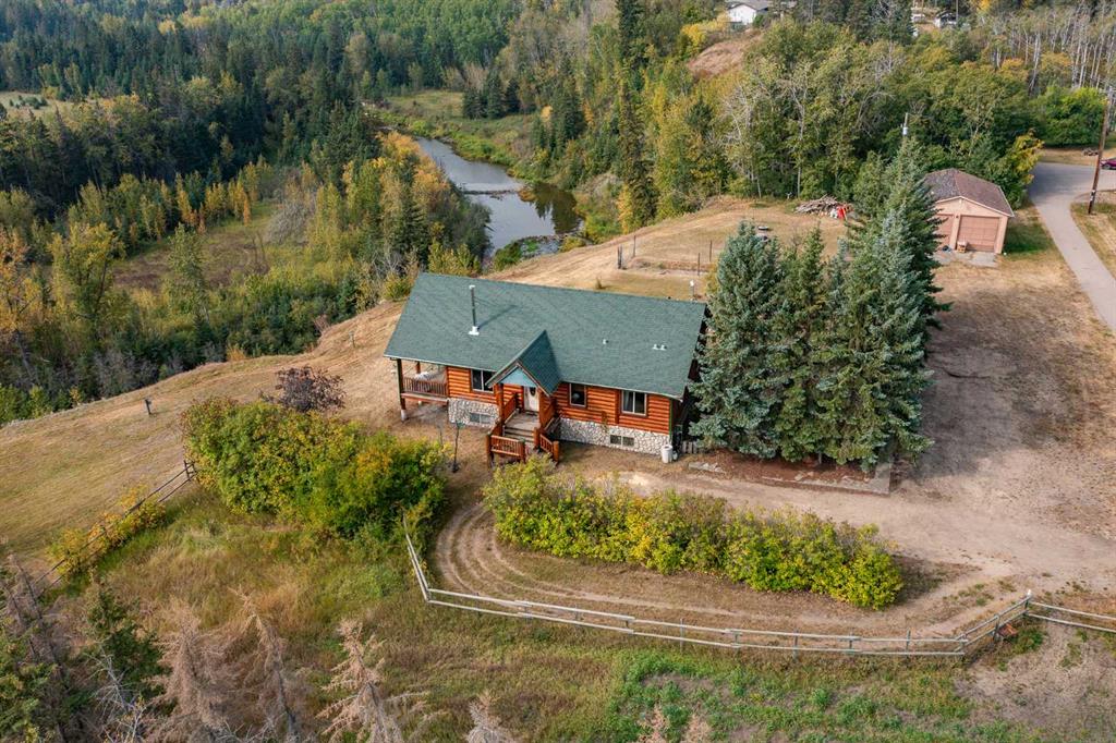 Set on 5.54 acres above the Blindman River, this log-style 1.5 storey home offers a peaceful setting with wide-open valley views and plenty of space to enjoy country living. The main floor is bright and welcoming, featuring a spacious living room with a wood stove, large south-facing windows, and direct access to the full wrap-around deck. The kitchen is practical and inviting with oak cabinetry, laminate countertops, a walk-in pantry, and a comfortable dining area. Two well-sized bedrooms, a 3-piece bathroom with a full tub, and a dedicated main floor laundry room complete this level. Upstairs, the loft-style bedroom provides a private retreat with brand new carpet, dual closets, a 3-piece ensuite, and impressive views through the oversized windows. The basement is partially developed with framing in place and building materials included, offering a head start for future development. The home is built on an ICF foundation and is equipped with underfloor heat, a high-efficiency furnace, and a high-efficiency hot water tank. The land itself is flat and usable, with a mix of open space and treed areas that attract wildlife. A pathway leads to a separate flat section of the property, ideal for a firepit area, camping spot, or future shop. The existing shop features high ceilings, a mezzanine, and radiant heat, and offers great potential for those looking for workspace or storage. Recent improvements include a new septic field and a newer pressure tank. Located in the Burbank community of Lacombe County, this property is just minutes from Blackfalds and approximately 10 minutes to Red Deer, offering the balance of quiet acreage living with convenient access to town amenities.