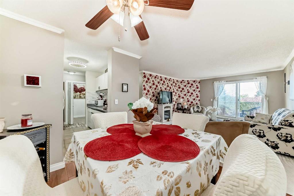 Enjoy effortless connectivity with quick access to Downtown, Deerfoot Trail, and Stoney Trail — a truly prime location. Start Building Equity in Dover Pointe! Step confidently into homeownership with this bright and beautifully refreshed two-bedroom, one-bath condo in the heart of Dover. Perched on the third floor, this spacious unit welcomes you with sunny southwest views from your private balcony — the perfect spot for your morning coffee or after-work unwind. Inside, you’ll find a functional galley kitchen featuring NEW tiles, NEW ceiling fan, NEW hood fan, and a newer stove — blending practicality with a fresh modern touch. The open dining area flows easily into a large, light-filled living room, ideal for hosting friends or relaxing solo. Throughout the home, stylish laminate flooring, crown mouldings, and NEW carpet in both bedrooms add comfort and polish. Each bedroom offers excellent closet space, while in-suite laundry keeps everyday life simple and convenient. This well-maintained, pet-friendly complex includes heat and water in your condo fees, plus one assigned outdoor parking stall. Your furry friend will love the Southview Off-Leash Park just a short 13-minute walk away, and your inner foodie will appreciate being steps from community restaurants — with Deerfoot Meadows (IKEA, Costco, Walmart & more) just minutes away. Commuting is effortless, with quick access to downtown by car or transit. Why rent when you can own your own place — comfort, convenience, and value all in one!
