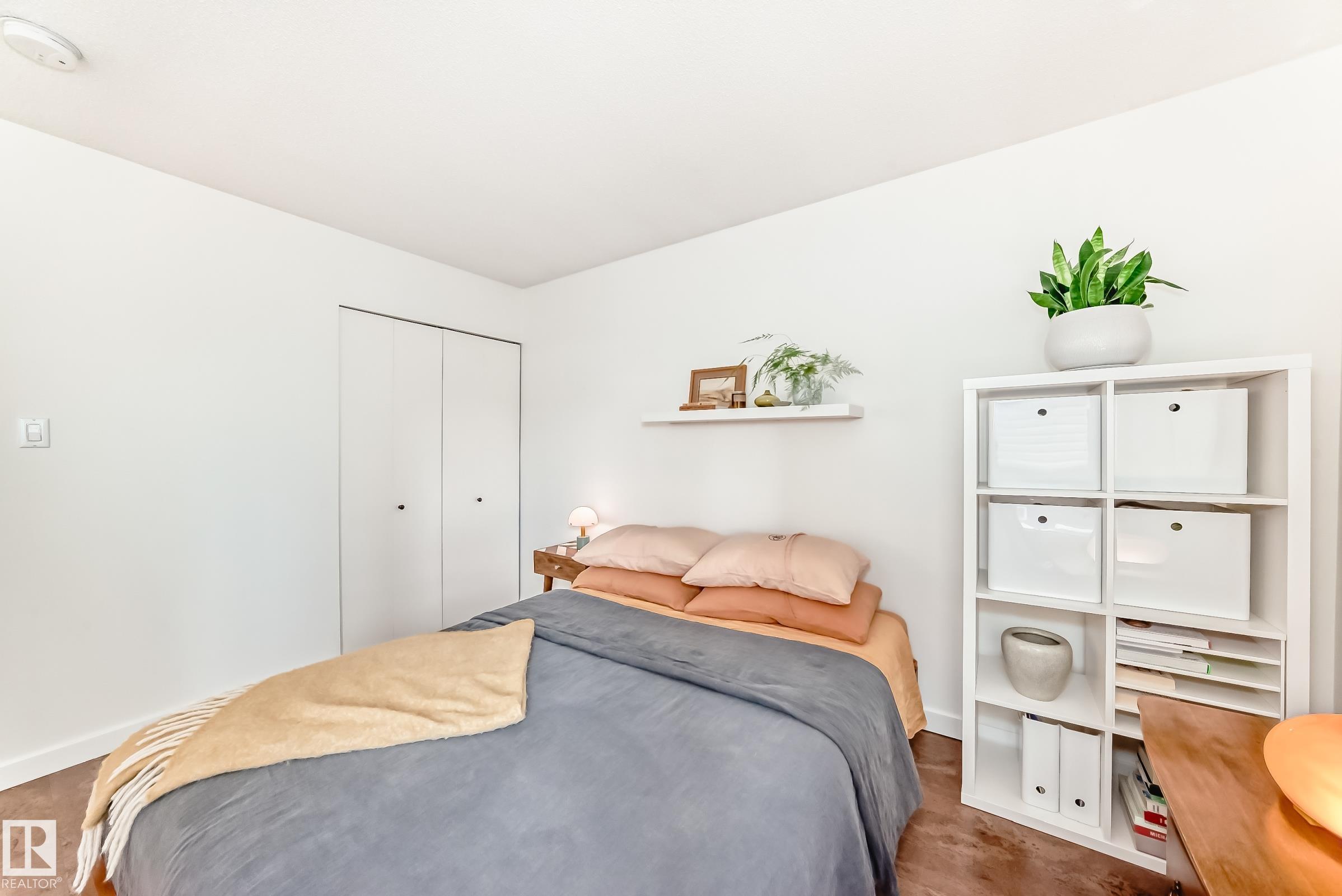 Welcome to this Top-Floor west-facing condo with a large deck & open concept layout. The L shape allows this studio to work as a 1 bedroom. The kitchen features stainless steel appliances, new countertops, tile backsplash, and ample cabinetry. Including a large walk-in pantry. Modern cork flooring throughout. The bathroom has been upgraded, unit was freshly painted, in-suite laundry, and a spacious balcony perfect for sunsets. Well-managed building with condo fees of only $466./mth for this unit, private storage locker just steps away from your unit. 1 parking stall included with your unit. Other amenities are the bike room, and courtyard. Start building your own equity now! One of downtown’s best locations— with tree-lined streets and mature landscaping, this neighbourhood is one to enjoy. Only steps away to shopping, restaurants, transit, and the river valley.