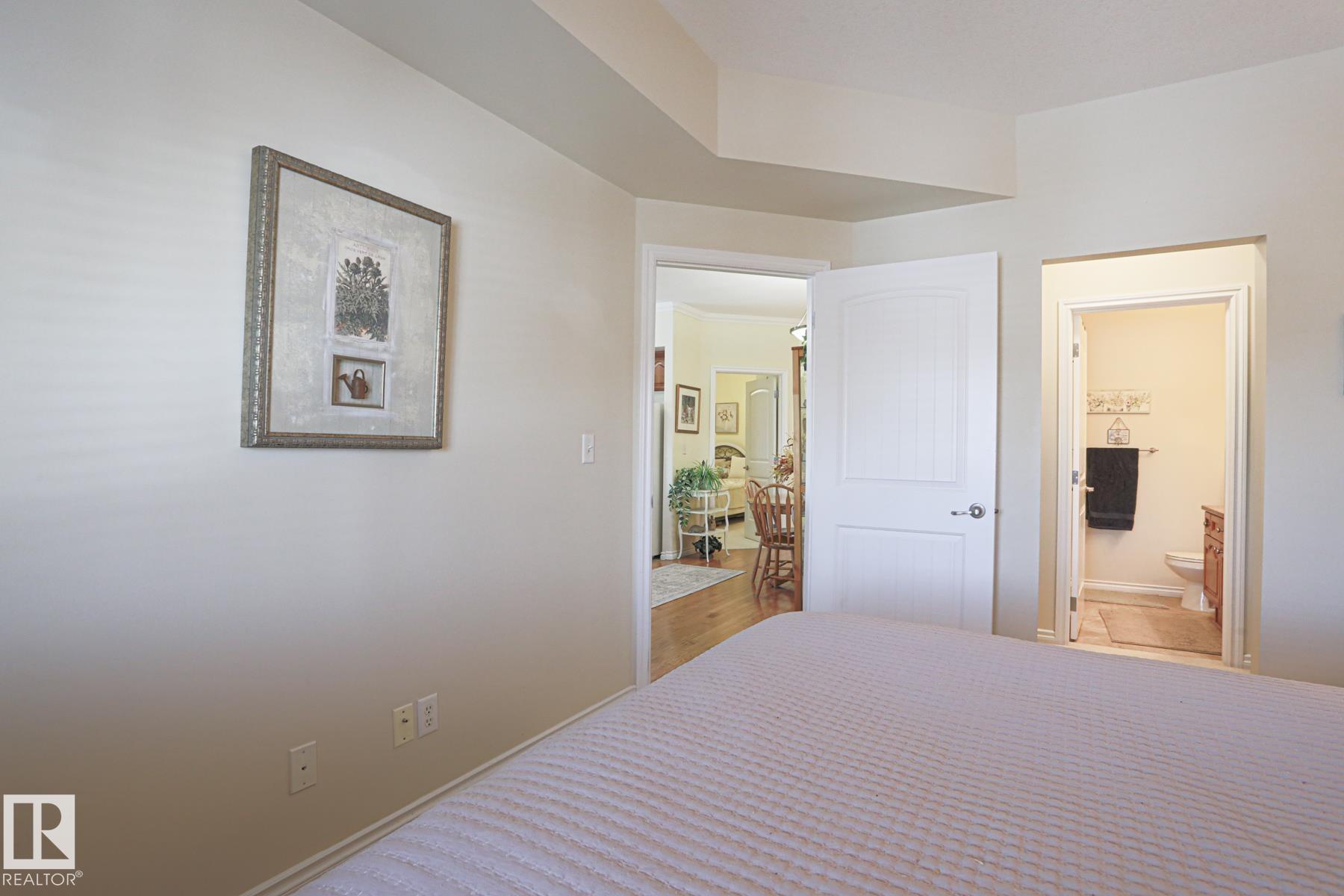 Adult living at its best in Belcanto Court in desirable Bonnie Doon. Beautiful 3rd floor north and east facing suite has lovely primary bedroom, walk through closet and three piece ensuite. Gorgeous hardwood floor adorns the living room with 9' ceilings which features a heartwarming natural gas fireplace with mantle to display your favorite photos and art. Bright kitchen with oak cabinets has a step saving wrap-around style that makes meal prep easy and convenient to serve the breakfast bar and smart dinette. A huge den (which can technically be a bedroom as it has a sprinkler head) makes for a great guest room, office, hobby/craft or relaxing private TV/reading room. You decide! Nice four piece bath for guests with tub. Large laundry room with stacker washer/dryer, lots of shelving and space for your collectibles too. Underground heated parking, carwash, guest suite and social room for savings, value and comfort. Bonnie Doon Mall + Valley Line LRT is close-by for your shopping and travelling convenience.
