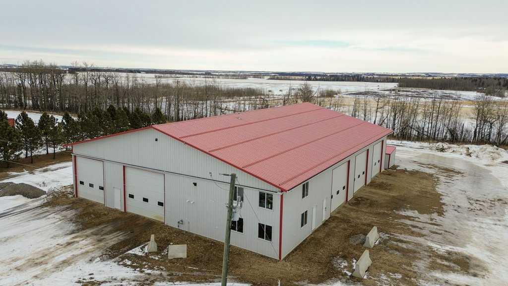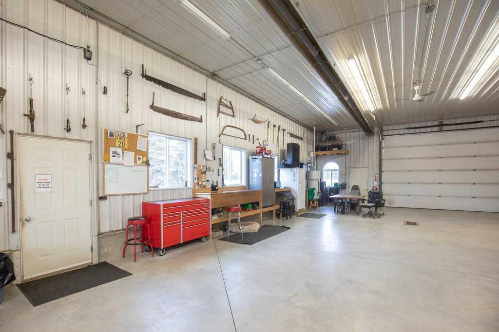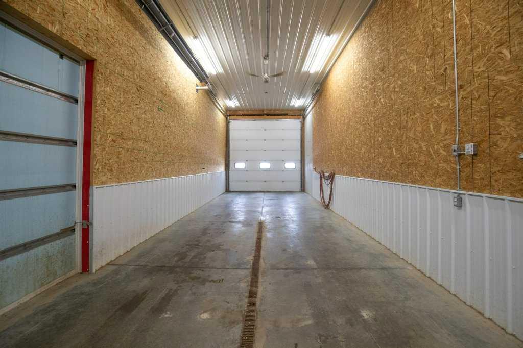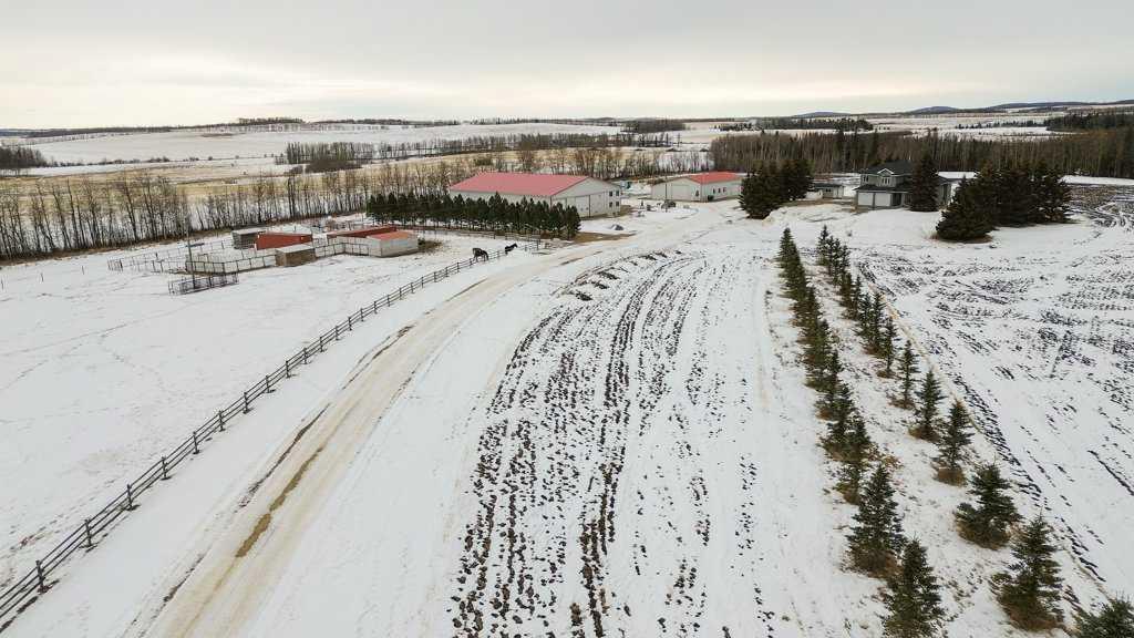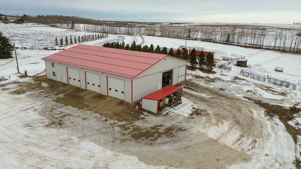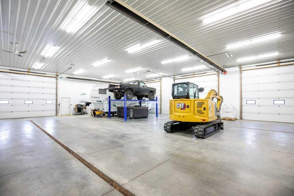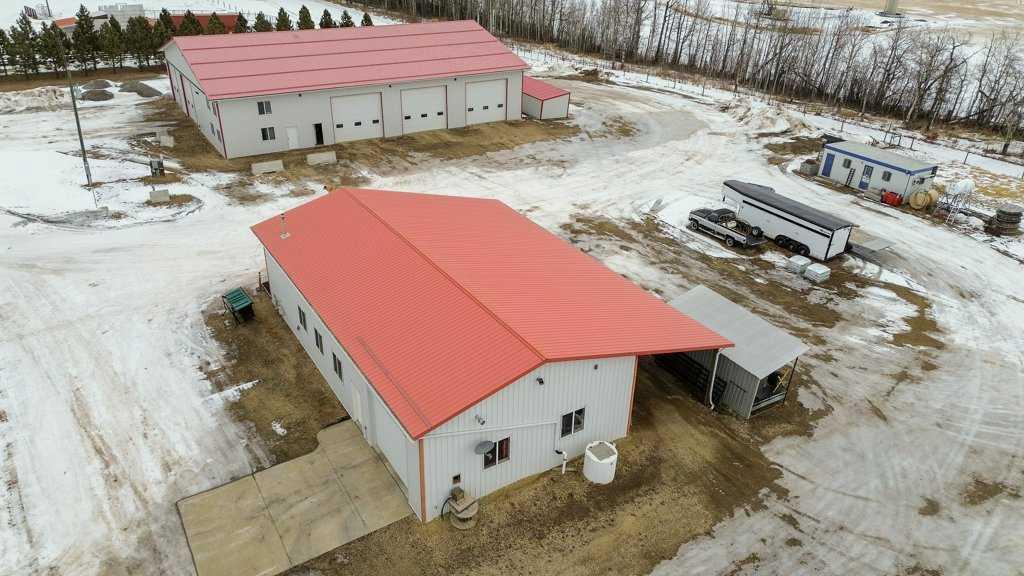 Welcome to this outstanding 80-acre gated agricultural property offering a rare blend of comfortable country living, income potential, and exceptional infrastructure. The land includes approximately 38 acres of farmable land and 15 acres of pasture, with the pasture currently rented to a neighboring farmer. Fully fenced and well-set up for horses, the property features corrals, waterers, hydrants, horse shelters, a tack room, and several outbuildings. Two wells service the property, and there are two oil leases generating ongoing revenue. The well-built two-story home, constructed in 1996, features a walkout basement and an expansive wrap-around deck showcasing breathtaking views. Inside, you’ll find vaulted ceilings, a sunken living room with elegant pillars, a gas fireplace, and a beautifully upgraded kitchen with a large island. The dining area opens directly to the deck, making it ideal for entertaining. Additional highlights include main-floor laundry and a double attached heated garage. Upstairs offers four generously sized bedrooms and an updated four-piece bathroom. The spacious primary retreat features walk-in closets and a stunning renovated ensuite with double vanity, full bathtub, and separate shower. The walkout basement provides even more living space with an additional gas fireplace, large patio wired for a hot tub, ample storage, a cold room, newer furnace, and central air conditioning. This property truly shines with its two impressive shops. The first is a 40’ x 60’ heated shop with radiant in-floor heat, lean-to drains, and two oversized doors—ideal for business operations, storage, or equipment. The second shop measures 76’ x 100’ and is divided into two sections, built on upgraded six-inch concrete. It includes five 14’ x 14’ overhead doors, four radiant heaters, and extensive workspace. A fully finished area—previously operated as a hair salon—offers in-floor heat, soundproofing, double drywall for fire protection, a full four-piece bathroom, washer and dryer, fridge, stove, oven, and could easily function as additional living quarters. Some shop bays are currently rented, with the tenant willing to remain. A rare opportunity to own a versatile, income-generating rural property with exceptional buildings, land, and a beautifully maintained home