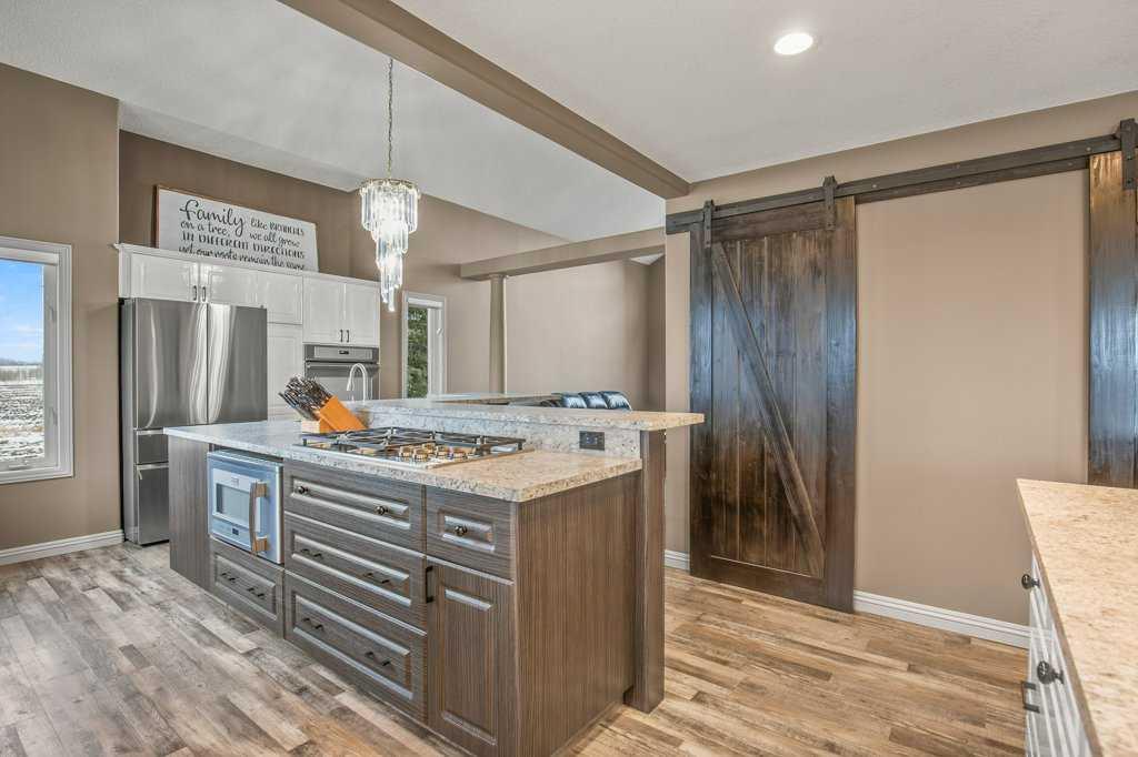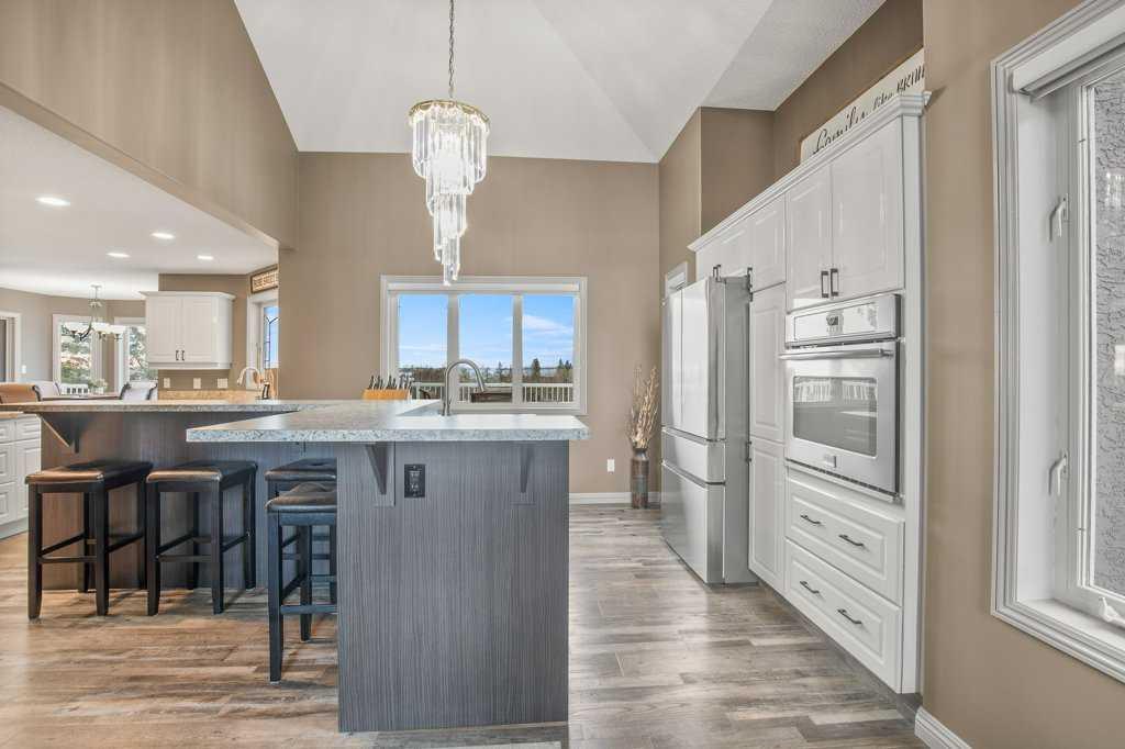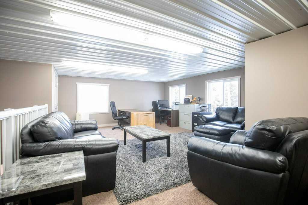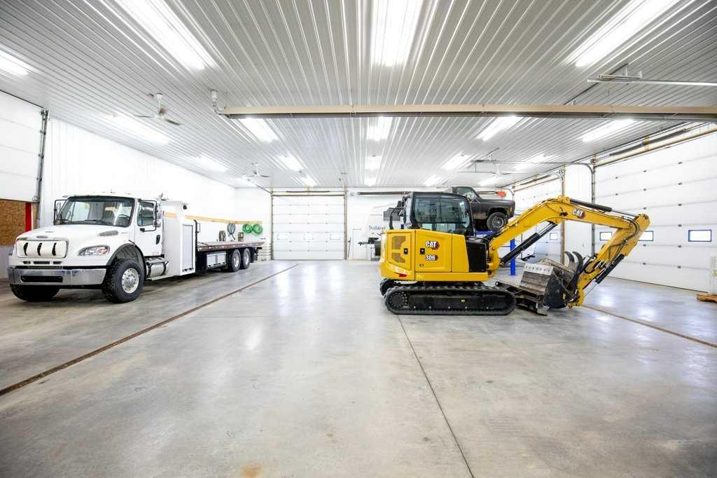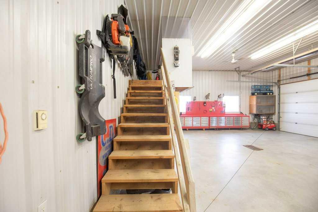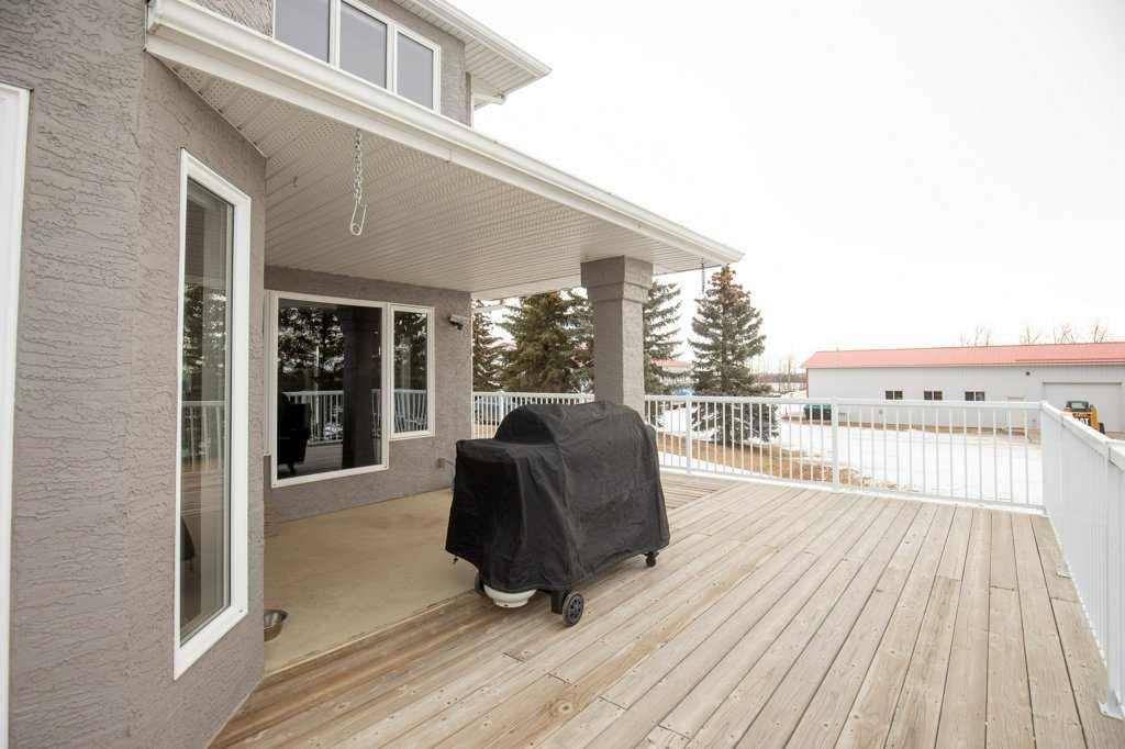 Welcome to this outstanding 80-acre gated agricultural property offering a rare blend of comfortable country living, income potential, and exceptional infrastructure. The land includes approximately 38 acres of farmable land and 15 acres of pasture, with the pasture currently rented to a neighboring farmer. Fully fenced and well-set up for horses, the property features corrals, waterers, hydrants, horse shelters, a tack room, and several outbuildings. Two wells service the property, and there are two oil leases generating ongoing revenue. The well-built two-story home, constructed in 1996, features a walkout basement and an expansive wrap-around deck showcasing breathtaking views. Inside, you’ll find vaulted ceilings, a sunken living room with elegant pillars, a gas fireplace, and a beautifully upgraded kitchen with a large island. The dining area opens directly to the deck, making it ideal for entertaining. Additional highlights include main-floor laundry and a double attached heated garage. Upstairs offers four generously sized bedrooms and an updated four-piece bathroom. The spacious primary retreat features walk-in closets and a stunning renovated ensuite with double vanity, full bathtub, and separate shower. The walkout basement provides even more living space with an additional gas fireplace, large patio wired for a hot tub, ample storage, a cold room, newer furnace, and central air conditioning. This property truly shines with its two impressive shops. The first is a 40’ x 60’ heated shop with radiant in-floor heat, lean-to drains, and two oversized doors—ideal for business operations, storage, or equipment. The second shop measures 76’ x 100’ and is divided into two sections, built on upgraded six-inch concrete. It includes five 14’ x 14’ overhead doors, four radiant heaters, and extensive workspace. A fully finished area—previously operated as a hair salon—offers in-floor heat, soundproofing, double drywall for fire protection, a full four-piece bathroom, washer and dryer, fridge, stove, oven, and could easily function as additional living quarters. Some shop bays are currently rented, with the tenant willing to remain. A rare opportunity to own a versatile, income-generating rural property with exceptional buildings, land, and a beautifully maintained home