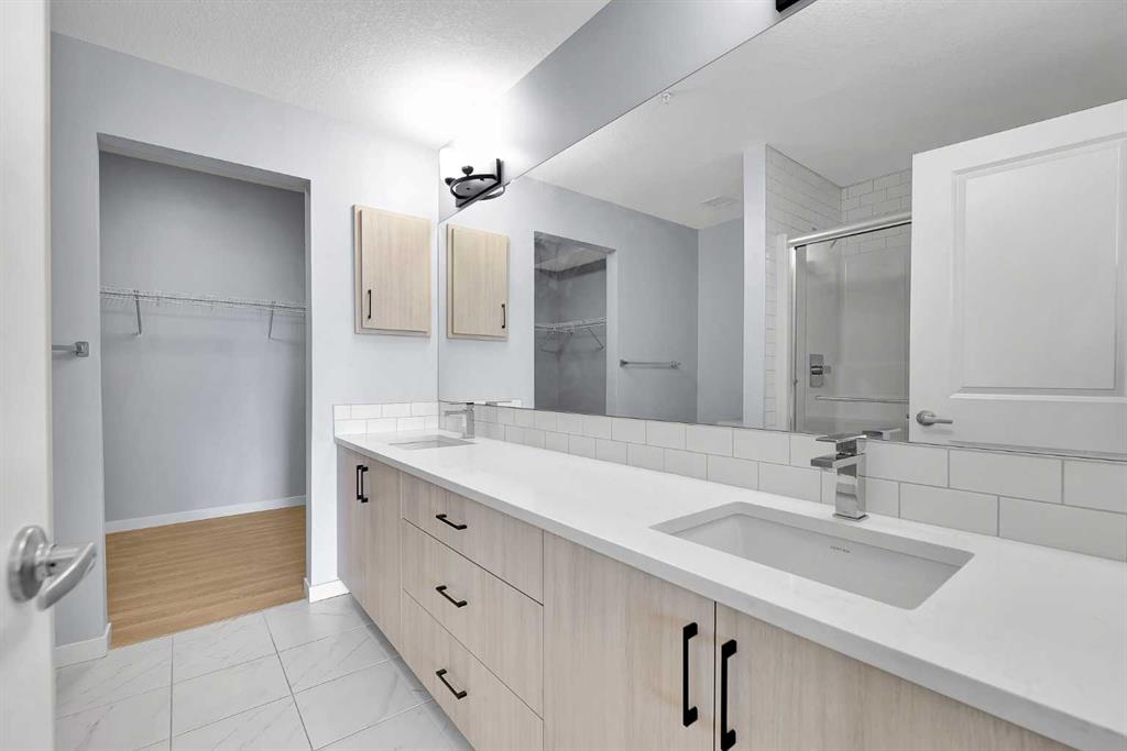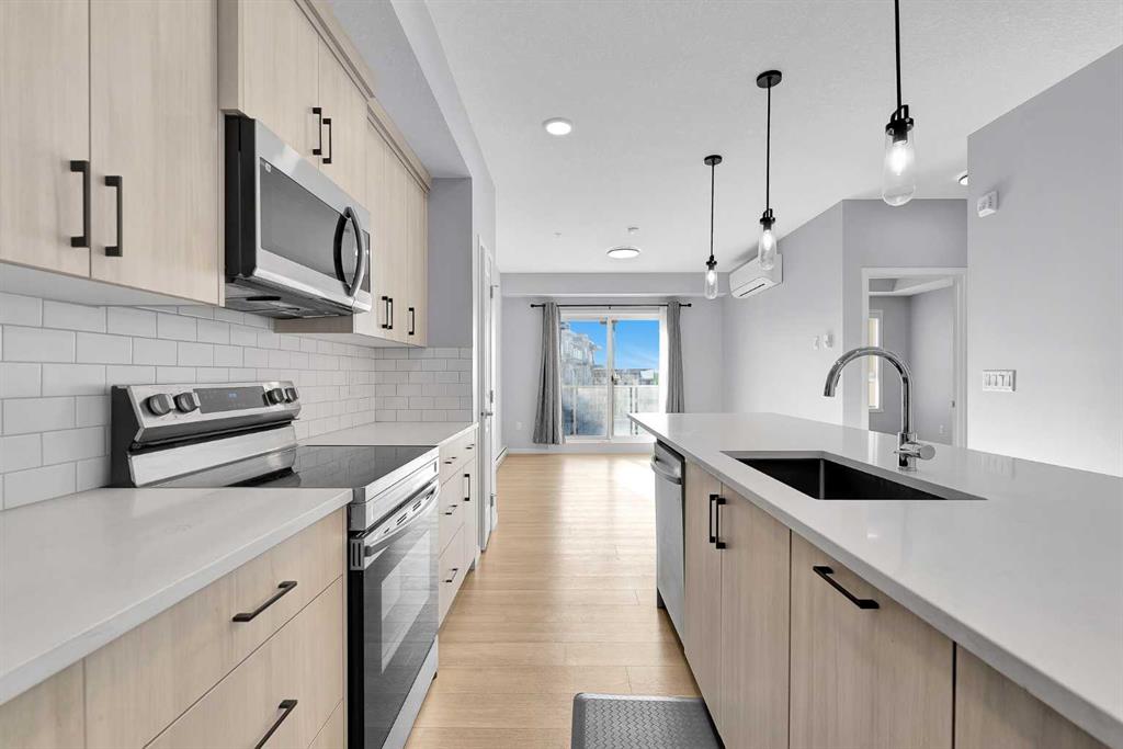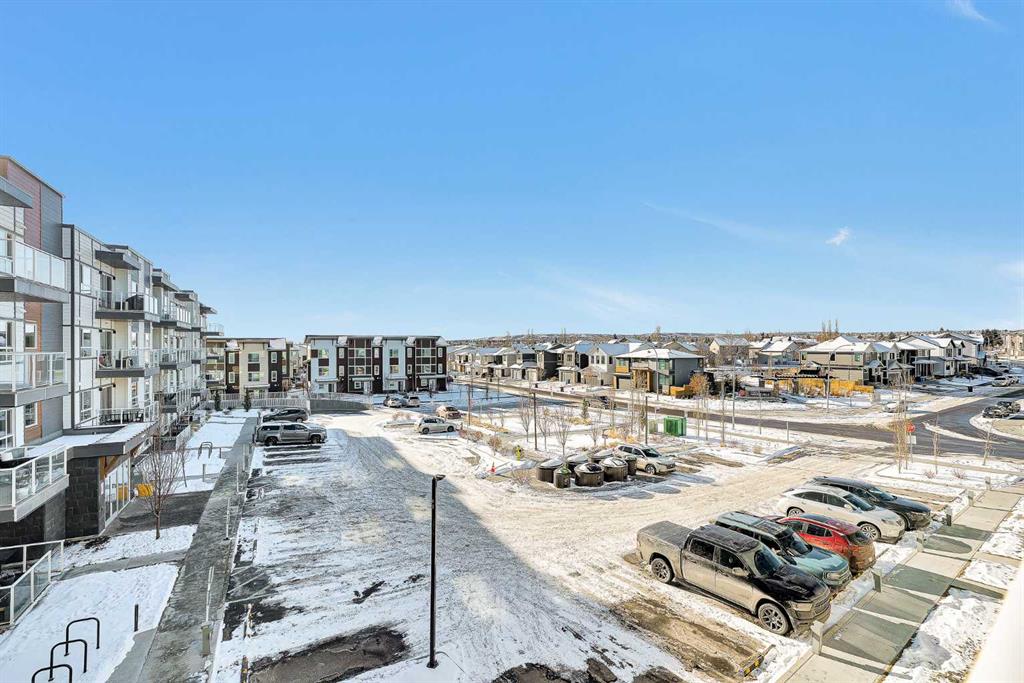 Welcome to this bright and spacious 2-bedroom, 2-bathroom condo filled with natural light and designed with comfort and functionality in mind. This open-concept unit features 9’ ceilings, luxury vinyl plank flooring, Low-E triple-glazed windows, electric baseboard heating, and air conditioning for year-round comfort. The stylish kitchen is the heart of the home, showcasing quartz countertops, stainless steel appliances, ample cabinetry, an elegant backsplash, and a central breakfast island. The kitchen flows seamlessly into the dining area and inviting living room, creating an ideal space for both everyday living and entertaining. The well-designed layout offers two generously sized bedrooms, including a primary suite complete with a walk-in closet and a private ensuite featuring a standing shower with upgraded cabinetry providing additional drawer storage. The second bedroom is thoughtfully positioned next to the main bathroom, which also features upgraded cabinetry with extra drawers for enhanced organization. In-unit laundry and additional storage further enhance everyday convenience. Step outside to the large, private balcony—perfect for morning coffee or evening gatherings—complete with a BBQ gas line. Additional features include underground parking. Located in a well-established community, residents enjoy access to an HOA with a tennis court, nearby schools and parks, and an abundance of amenities including Coventry Hills Shopping Centre, VIVO Rec Centre, grocery stores, restaurants, cafés, Home Depot, Superstore, Cineplex, T&T Supermarket, and the North Pointe bus terminal. Conveniently situated less than 10 minutes from Calgary International Airport and with quick access to Deerfoot Trail and Stoney Trail.