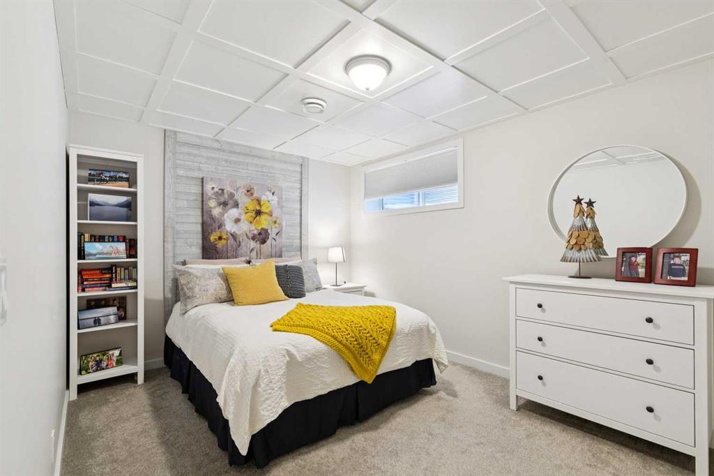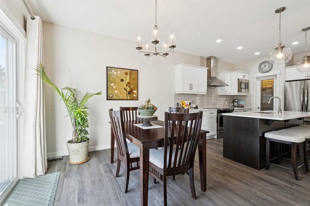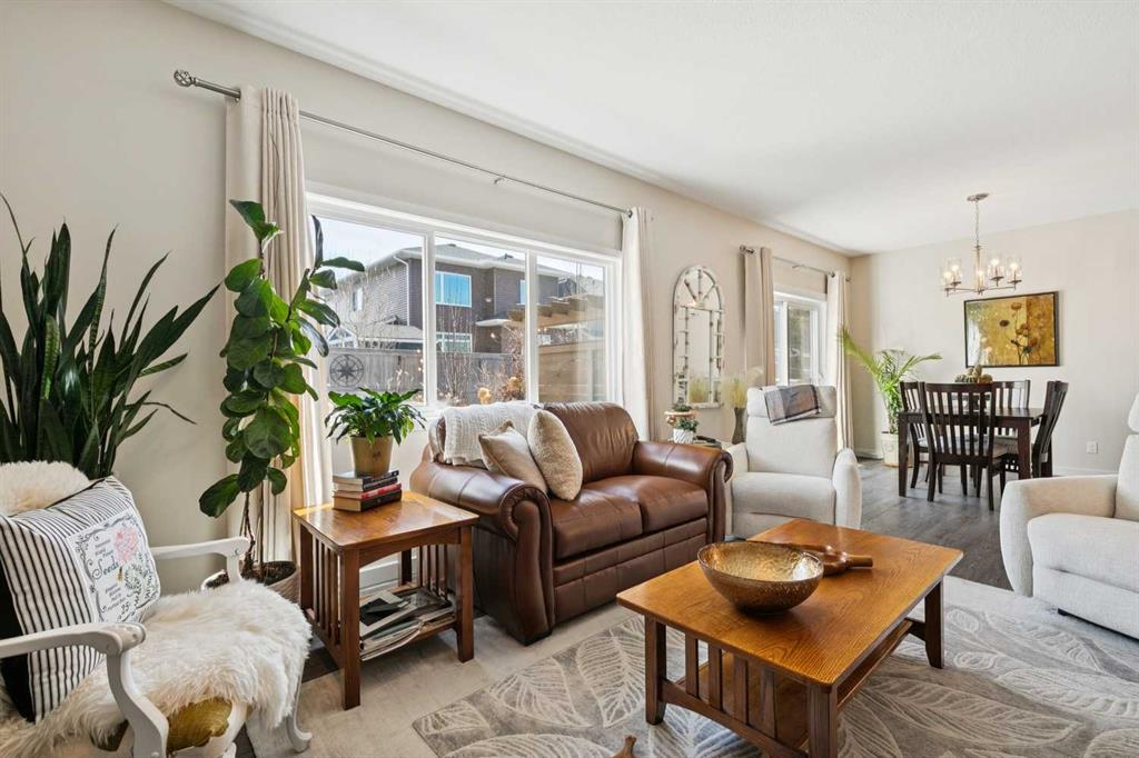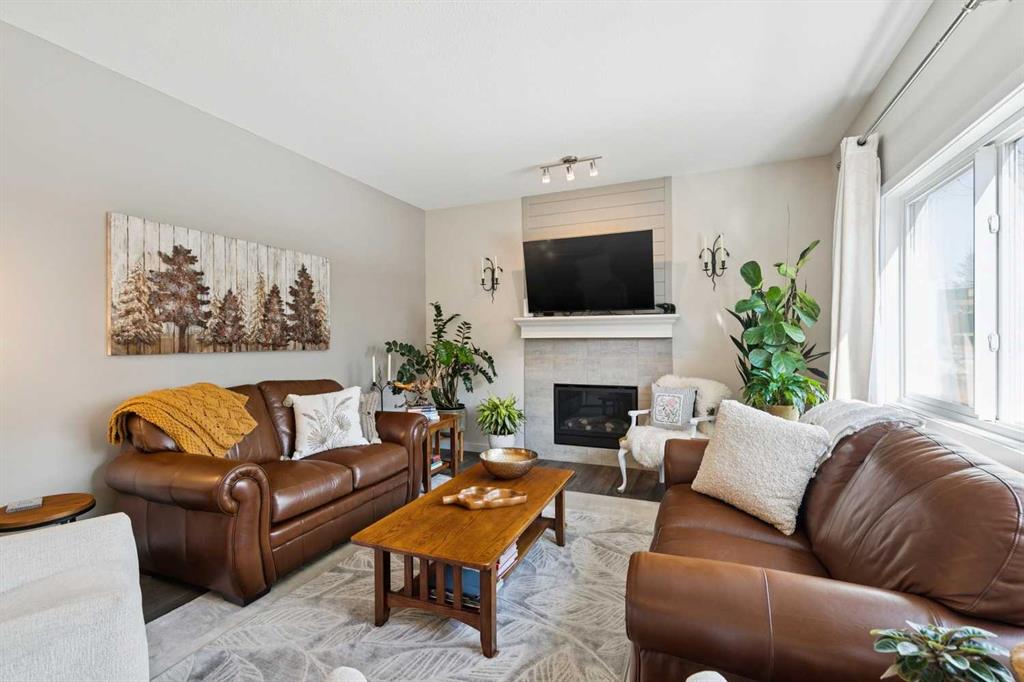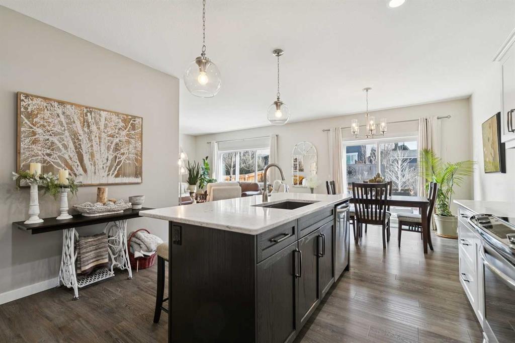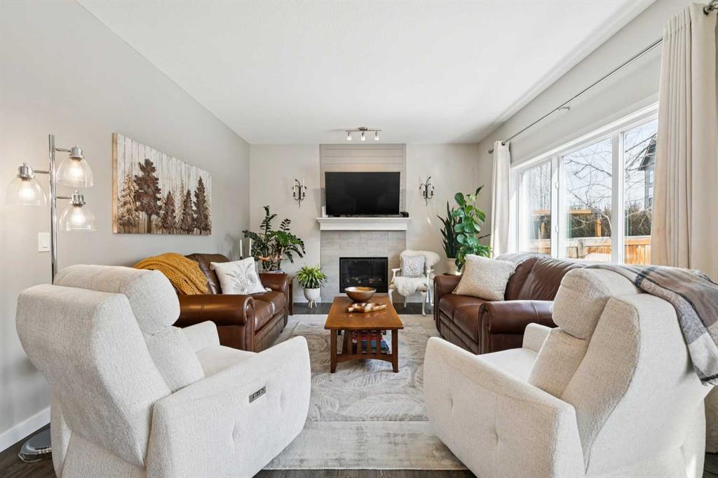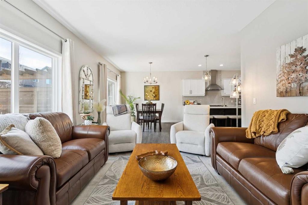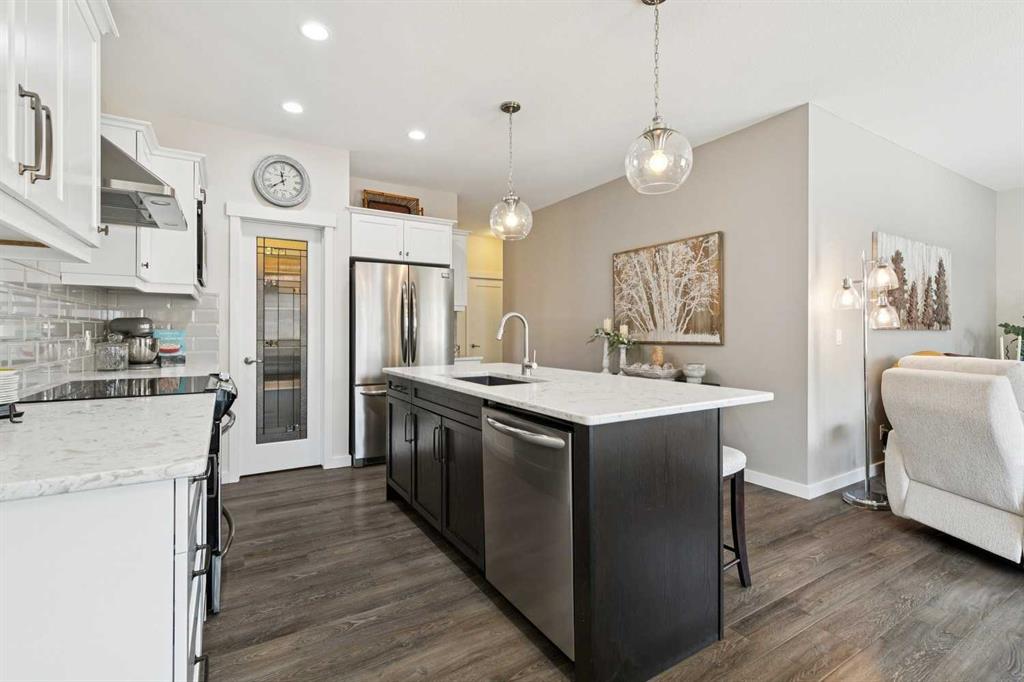 Welcome to this beautifully maintained custom-built bungalow in the family-friendly community of Ravenswood in Airdrie. Offered by the original owners, this home has been meticulously cared for and thoughtfully designed, creating a warm and comfortable space that shows pride of ownership in every detail. The spacious front entry with elegant spindle railings offers a bright and welcoming first impression. The open-concept main floor features a beautiful white kitchen with granite countertops, classic tile backsplash, stainless steel appliances, and a large corner pantry, providing both style and function. The generous island offers plenty of workspace and seating, while the dining area flows seamlessly into the large living room anchored by a cozy gas fireplace, creating an inviting place to gather with family and friends. The primary bedroom is conveniently located on the main floor and offers a relaxing retreat complete with a walk-in closet and a well-appointed ensuite featuring a soaker tub, walk-in shower, and large vanity with plenty of storage. Throughout the home you will notice thoughtful feature walls and design details that add warmth and character. The fully developed basement expands the living space beautifully, offering a large family room with a striking ceiling, electric fireplace feature wall, and built-in media area. A Murphy bed makes the space ideal for overnight guests, while the built-in desk area creates a practical workspace. Two spacious bedrooms with impressive closet space and a stylish bathroom with a tiled shower make this level perfect for family or visitors. The basement also offers excellent storage throughout, making organization easy. Outside, the beautifully landscaped backyard has clearly been lovingly maintained, featuring stunning garden beds and a charming patio area perfect for relaxing or entertaining. Additional highlights include air conditioning, new carpet, and abundant storage throughout the home. Ideally located steps from Airdrie Francophone School and Heloise Lorimer School, and only minutes to restaurants, shopping, and everyday amenities with easy access to Highway 2 for commuters. This is a rare opportunity to own a truly immaculate bungalow in a fantastic location.