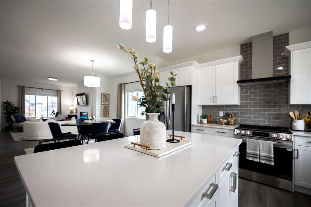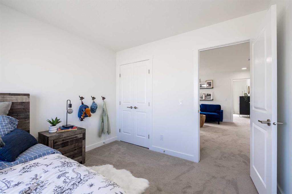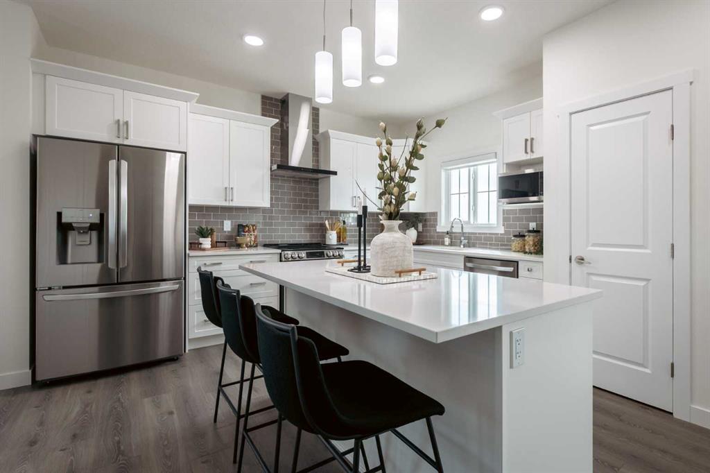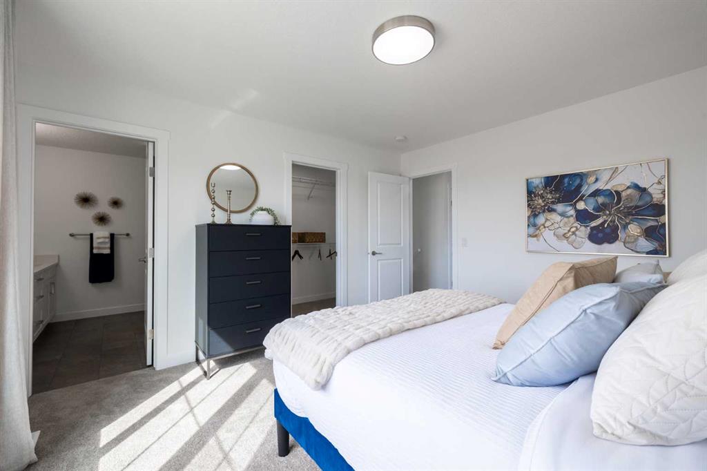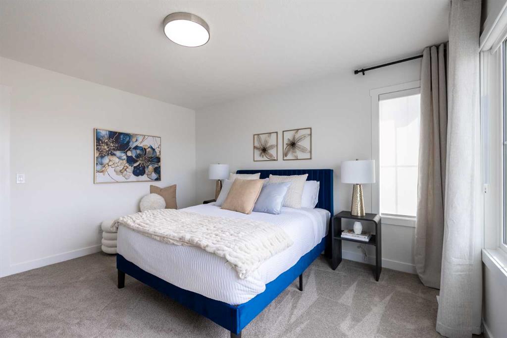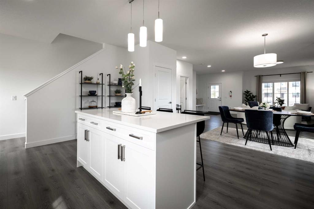 MODERN DOUGLAS WITH BONUS ROOM, SIDE ENTRY & BELMONT CONVENIENCE! Welcome to Belmont, a growing SW Calgary community known for its family-friendly vibe, scenic walking paths, nearby shopping, and easy access to major routes, perfect for balancing lifestyle and convenience. This Douglas-Z model zero lot line home features over 1800 sqft of a bright open-concept main floor with 9’ ceilings and beautiful French-imported laminate flooring, creating a warm and cohesive living space. The modern kitchen is complete with quartz countertops, ample cabinetry, and a seamless connection to the dining and living areas—ideal for both daily living and entertaining. Durable vinyl tile flooring in all wet areas adds practicality where it matters most. Upstairs, you’ll find three spacious bedrooms, a versatile bonus room perfect for family time or a home office, and the convenience of second-floor laundry. The layout is designed to grow with you, offering both comfort and flexibility for busy households. Additional highlights include a separate side entrance for future potential and a rear parking pad for convenient off-street parking. A well-balanced home that blends modern finishes, smart design, and a welcoming community, this is Belmont living at its best. PICTURES ARE OF SHOW HOME; ACTUAL HOME, FIXTURES, FINISHES, ETC. MAY VARY AND ARE SUBJECT TO AVAILABILITY/CHANGE WITHOUT NOTICE