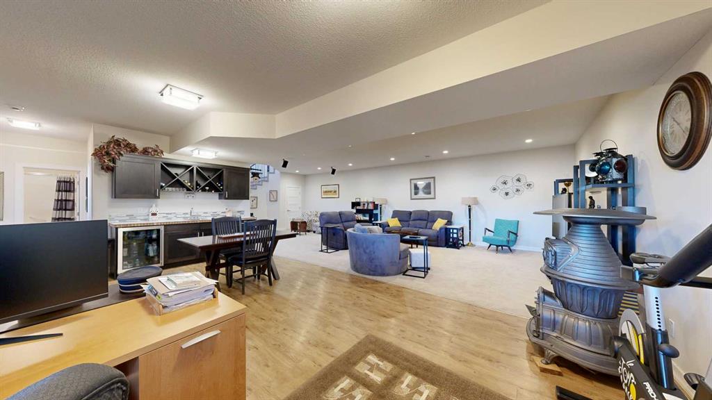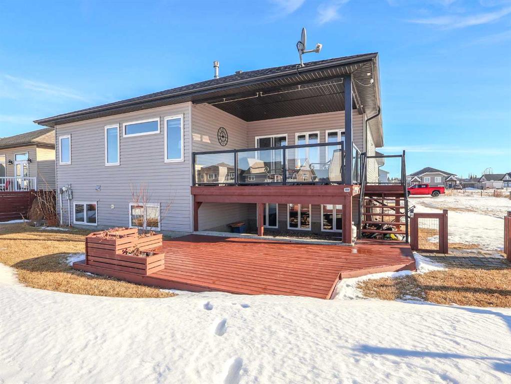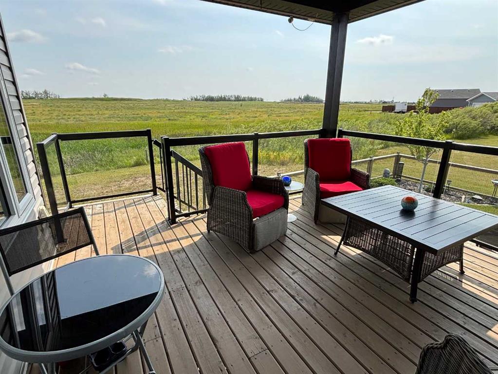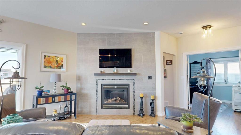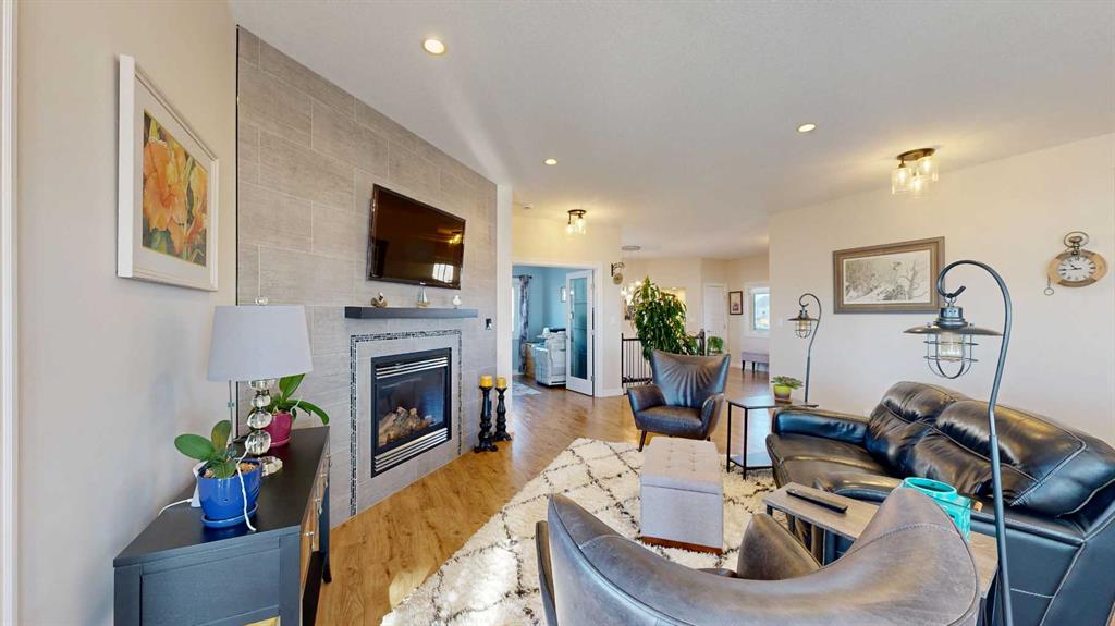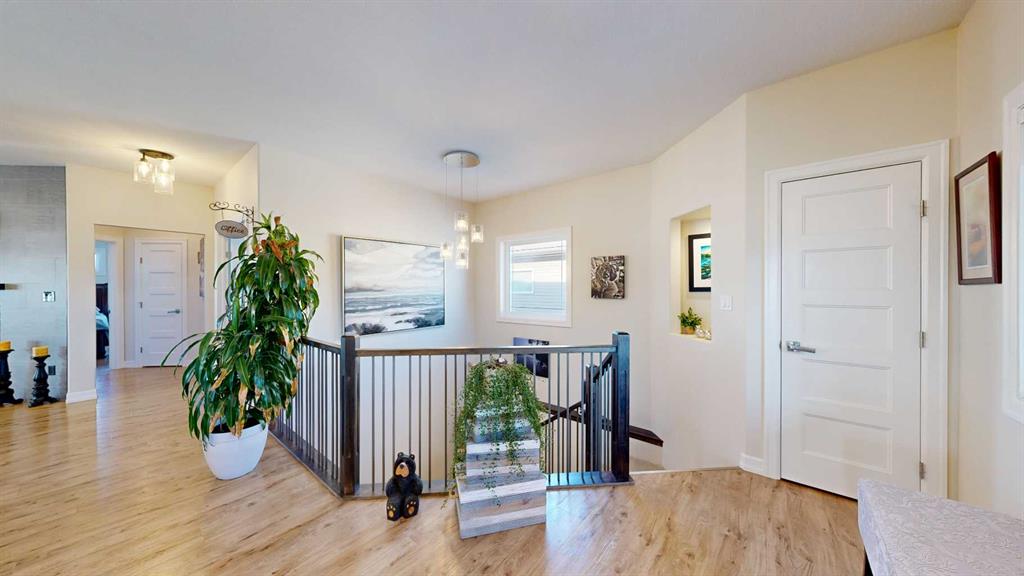 This impressive custom-built home offers a perfect balance of space, style, and functionality, ideally located in a desirable area of town with an open field to the south and beautiful greenspace behind. Thoughtful design, modern fixtures, and quality finishes create a contemporary yet welcoming living environment throughout. The bright and spacious front entry features convenient coat closets and sets the tone for the home’s light-filled interior, highlighted by warm wood-look flooring and neutral tones. The open-concept main living area seamlessly connects the kitchen, dining, and living spaces, making it ideal for both everyday living and entertaining. The kitchen is well appointed with dark wood cabinetry, stainless steel appliances including a double oven, a large island with sink, and a walk-through pantry with space for an additional fridge or freezer. The dining area offers abundant windows and patio door access to the back deck, while the living room is anchored by a beautiful gas fireplace. The primary bedroom is a true retreat, presenting a spa-inspired ensuite with freestanding tub, walk-in shower, and an organized walk-in closet. A home office with French doors is conveniently located on the main floor, along with a 2-piece bathroom, a laundry room with sink and front-load washer and dryer, and direct access to the attached garage. The staircase with wood handrail and metal balusters adds architectural interest and leads to the fully developed basement with 9’ ceilings. This open yet well-defined space features a wet bar with cabinetry, sink, and mini fridge, two additional bedrooms, and a bright 4-piece bathroom. Enjoy the comfort of air conditioning in this home and in-floor heat in the basement. The heated, oversized 24’ x 26’ garage provides excellent storage and workspace. Outside, enjoy a covered raised deck with panoramic countryside views, plus a lower ground-level deck with built-in planters—perfect for relaxing or entertaining. This immaculate home offers exceptional comfort, thoughtful design, and stunning surroundings.