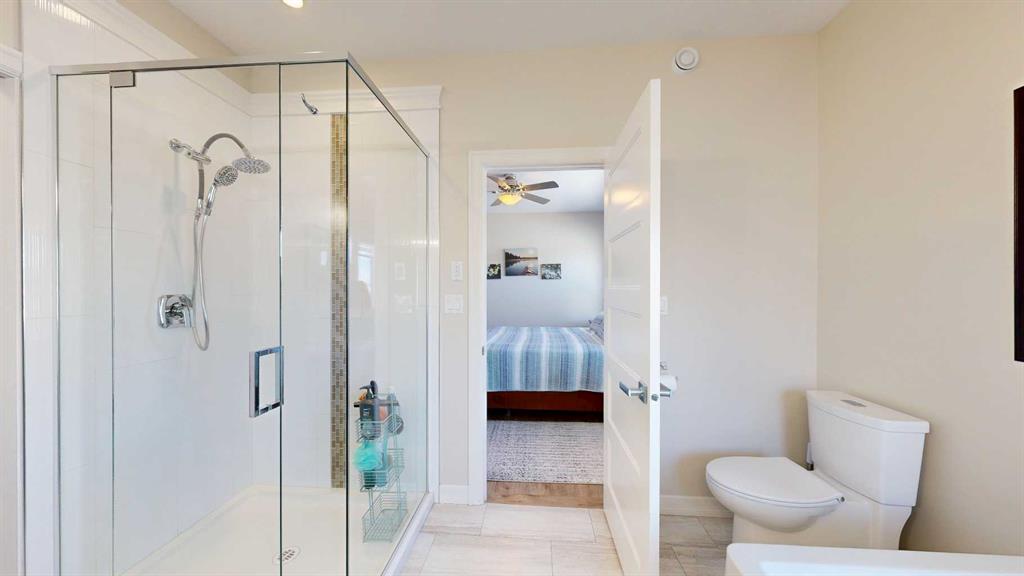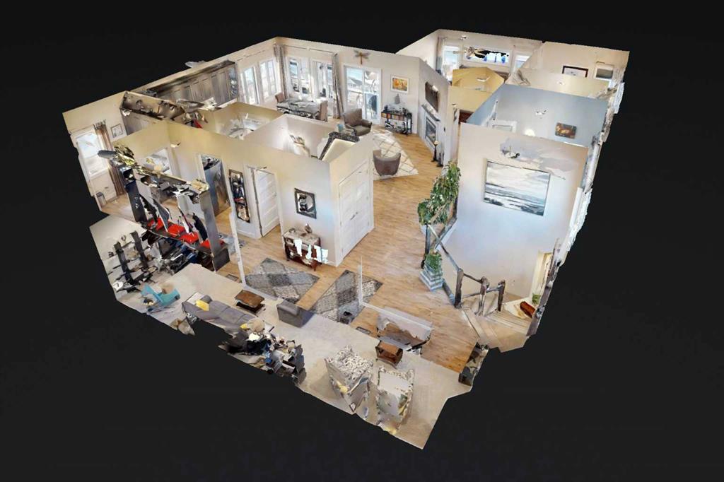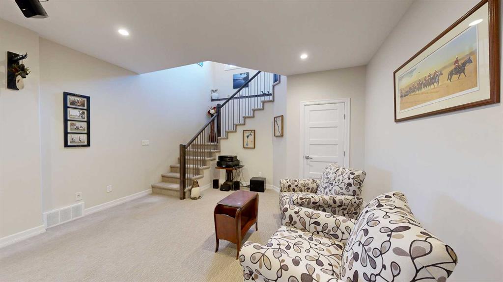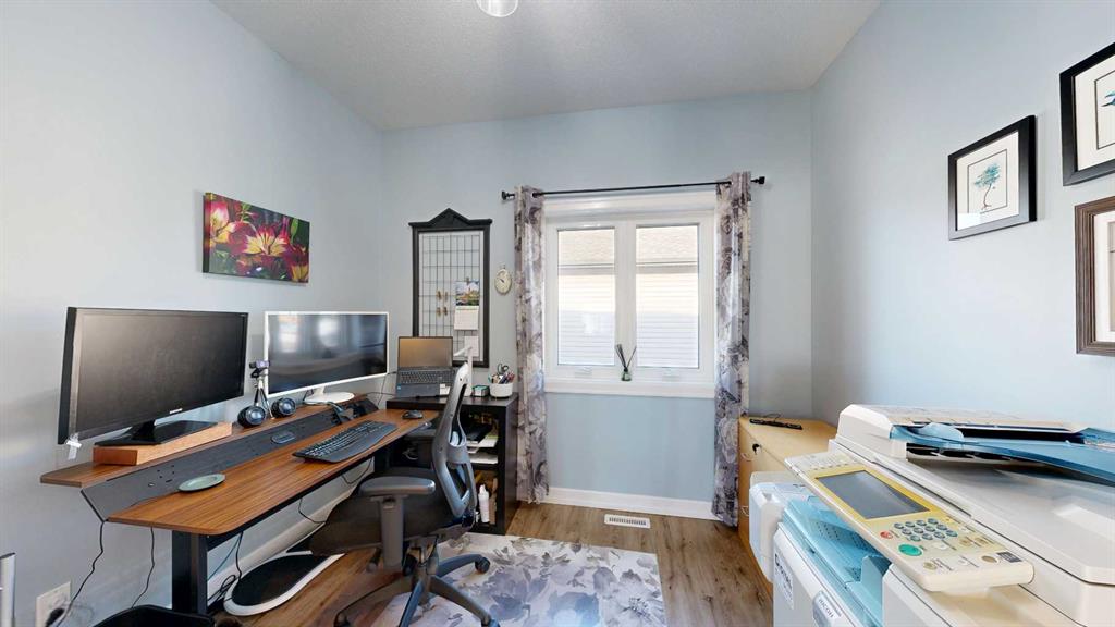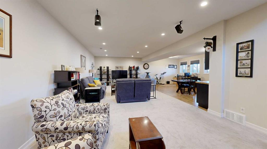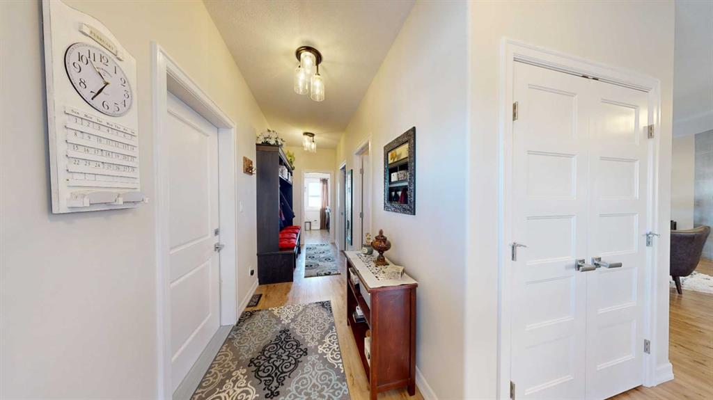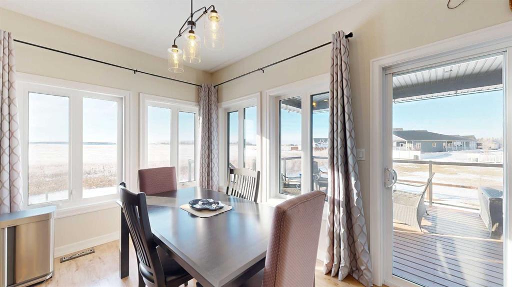 This impressive custom-built home offers a perfect balance of space, style, and functionality, ideally located in a desirable area of town with an open field to the south and beautiful greenspace behind. Thoughtful design, modern fixtures, and quality finishes create a contemporary yet welcoming living environment throughout. The bright and spacious front entry features convenient coat closets and sets the tone for the home’s light-filled interior, highlighted by warm wood-look flooring and neutral tones. The open-concept main living area seamlessly connects the kitchen, dining, and living spaces, making it ideal for both everyday living and entertaining. The kitchen is well appointed with dark wood cabinetry, stainless steel appliances including a double oven, a large island with sink, and a walk-through pantry with space for an additional fridge or freezer. The dining area offers abundant windows and patio door access to the back deck, while the living room is anchored by a beautiful gas fireplace. The primary bedroom is a true retreat, presenting a spa-inspired ensuite with freestanding tub, walk-in shower, and an organized walk-in closet. A home office with French doors is conveniently located on the main floor, along with a 2-piece bathroom, a laundry room with sink and front-load washer and dryer, and direct access to the attached garage. The staircase with wood handrail and metal balusters adds architectural interest and leads to the fully developed basement with 9’ ceilings. This open yet well-defined space features a wet bar with cabinetry, sink, and mini fridge, two additional bedrooms, and a bright 4-piece bathroom. Enjoy the comfort of air conditioning in this home and in-floor heat in the basement. The heated, oversized 24’ x 26’ garage provides excellent storage and workspace. Outside, enjoy a covered raised deck with panoramic countryside views, plus a lower ground-level deck with built-in planters—perfect for relaxing or entertaining. This immaculate home offers exceptional comfort, thoughtful design, and stunning surroundings.