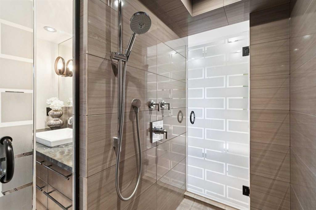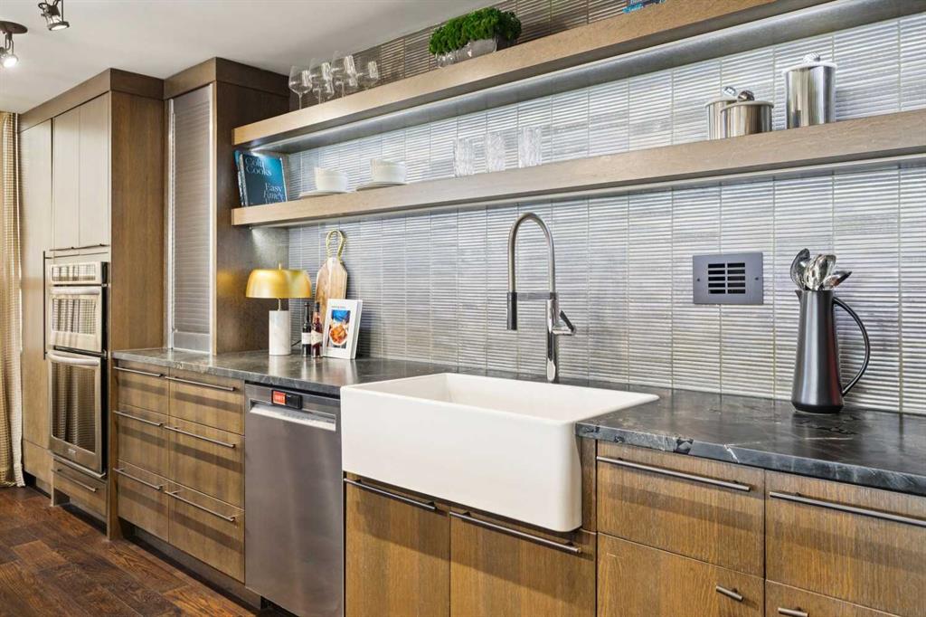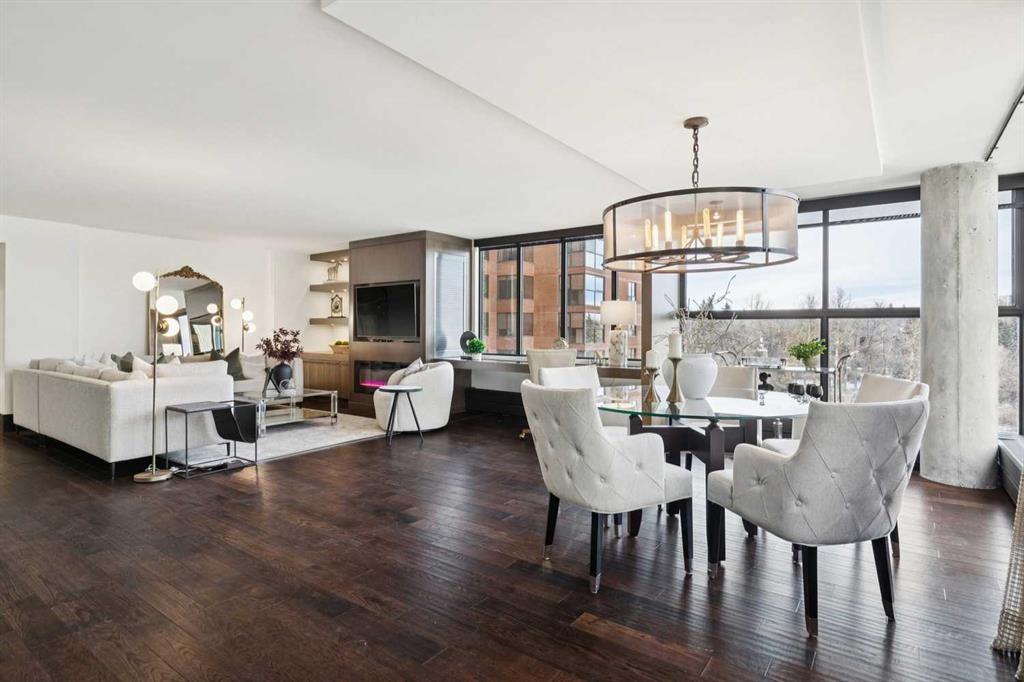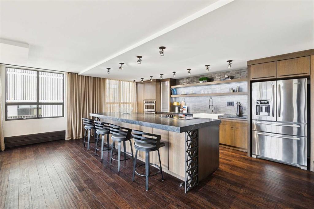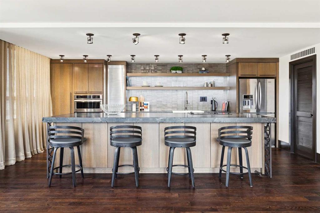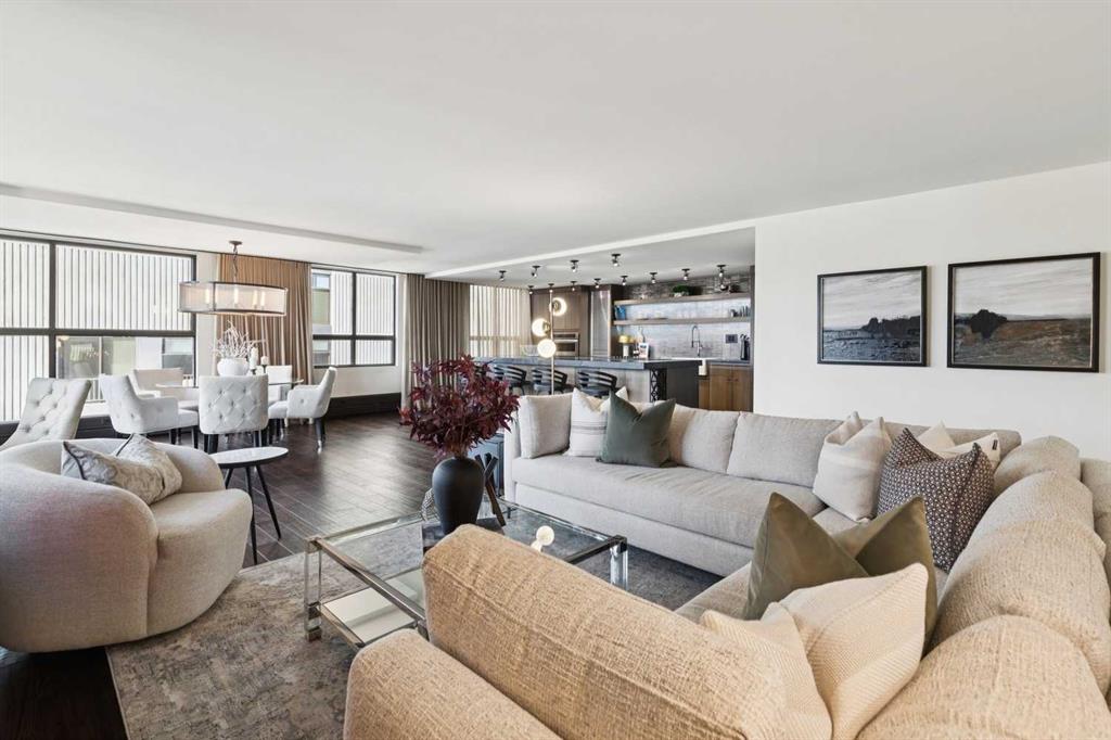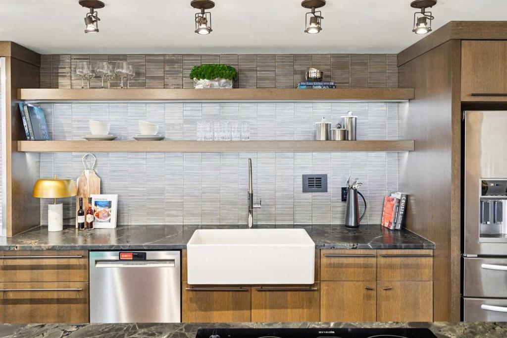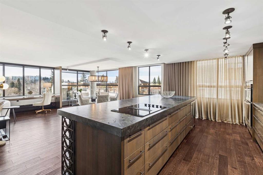 Welcome to Riverstone—one of Calgary’s most prestigious inner city residences, perfectly positioned in the heart of Mission and just steps from the Elbow River. This luxurious 1,572 sq. ft. SW corner unit has over $300,000 in high-end renovations, thoughtfully crafted by renowned interior designer Douglas Cridland. Showcasing a modern, open concept layout, the home is wrapped in floor to ceiling SW windows that bathe the living and dining areas in natural light while capturing sweeping southwest views. The custom chef’s kitchen is both functional and stunning, featuring premium stainless steel appliances, a farmhouse sink, soft-close cabinetry with dovetail construction, built-ins, a wine fridge, and a striking leather granite island that anchors the space. The spacious primary bedroom, accented by sliding barn doors, includes a beautifully designed ensuite with a walk in shower and a generous walk in closet. A large second bedroom and a well appointed main bath with a shared shower offer flexibility for guests or a home office.Additional upgrades include solid core doors, designer lighting and plumbing fixtures, pot lights, smooth ceilings, and an elegant electric fireplace. Riverstone is a true full-service building, offering 24-hour concierge, a fitness center, swimming pool, visitor parking, car wash bay, and tennis courts. This home delivers exceptional value in Calgary’s upscale condo market—combining luxury, location, and lifestyle in one of the city’s most desirable communities.