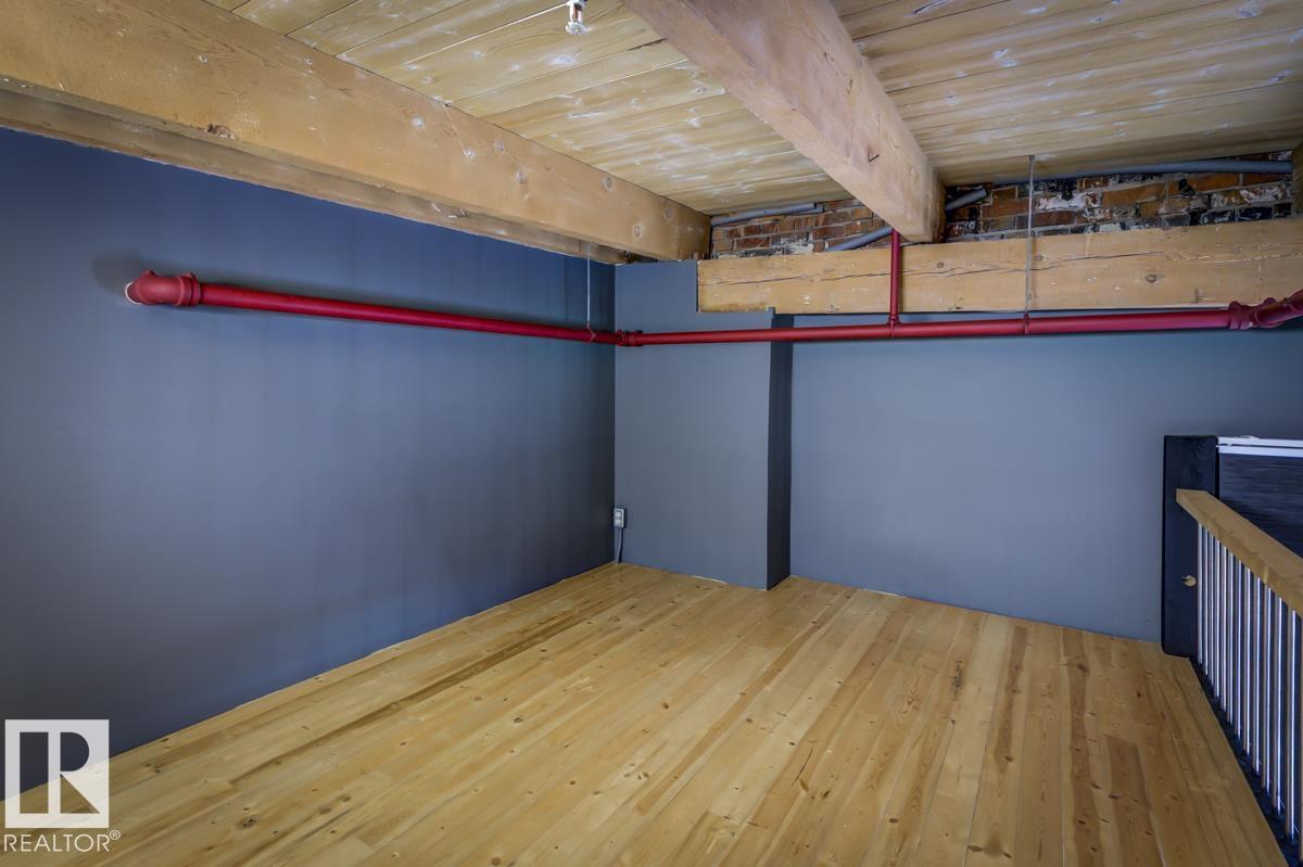 This is a true historic warehouse loft, authentic, architectural, and incredibly rare. Located in one of Edmonton’s most respected warehouse conversions, this top-floor corner-unit loft offers approximately open, flexible living space with soaring 13-foot exposed timber ceilings, original beams and columns, and beautiful west-facing light. The open-concept layout is currently configured as a one-bedroom plus den with a raised loft and massive built-in wardrobe, while still allowing for creative customization. Thoughtful updates include new laminate flooring, concrete countertops, a modern kitchen island, in-suite laundry, air conditioning, and a beautifully renovated bathroom. Underground titled parking and exceptionally low condo fees that include heat and water add tremendous value. Perfectly situated in the Warehouse District, steps from 104 Street, the Ice District, Brewery District, and post-secondary institutions, this is authentic urban loft living.